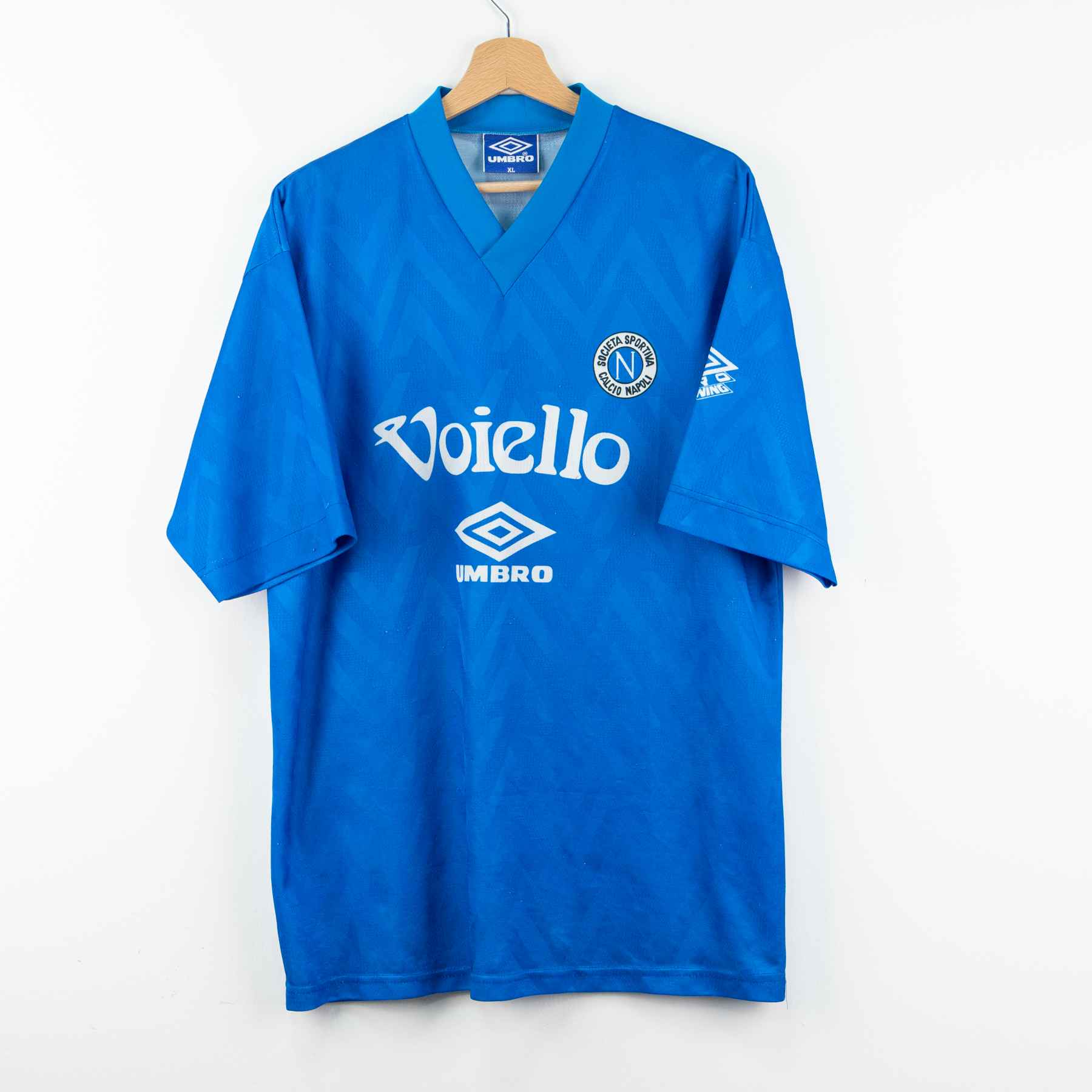 Il capo presenta il classico colore azzurro Napoli con scollo a V e grafica tono su tono tipica dei primi anni ’90. Sul petto sono presenti lo sponsor Voiello, storico marchio legato al club in quel periodo, e il logo Umbro. Lo stemma circolare della Società Sportiva Calcio Napoli è applicato sul lato cuore.