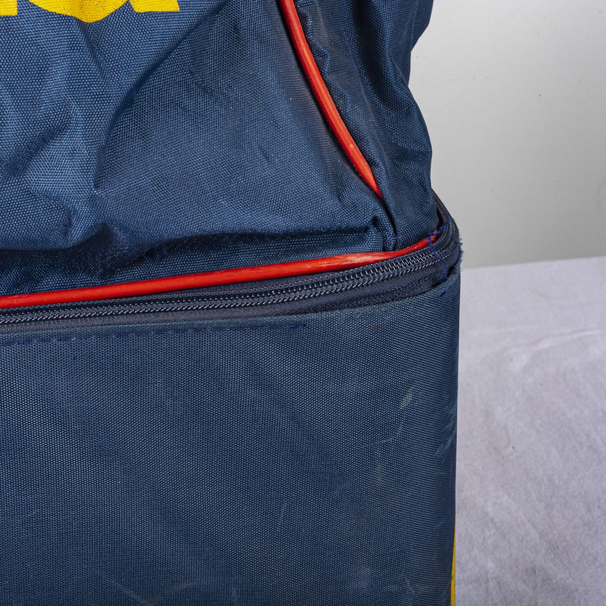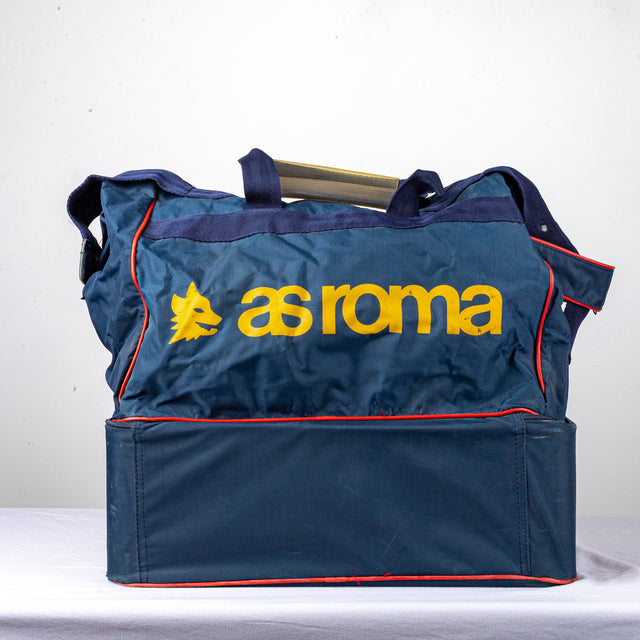 Borsone ufficiale dell’AS Roma stagione 1994/1995, prodotto da Asics. Modello di colore blu navy con dettagli a contrasto rossi e loghi gialli. Scritta “as roma” frontale e logo Asics sul fondo rigido. Ampio scomparto principale con chiusura a zip, tasca inferiore separata ideale per scarpe o abbigliamento.