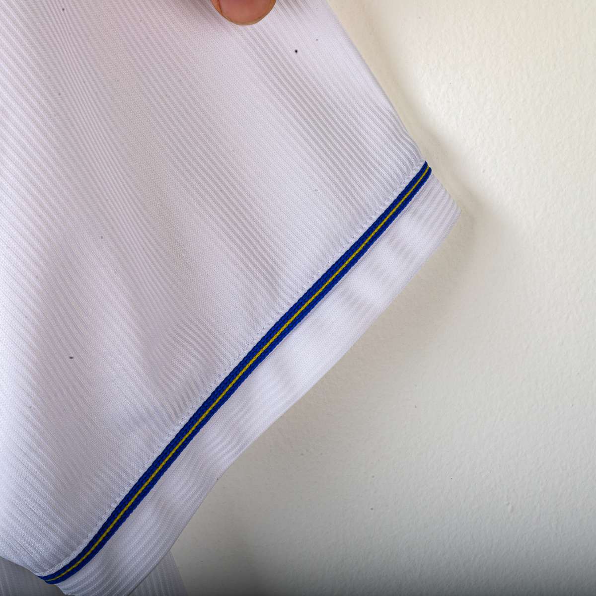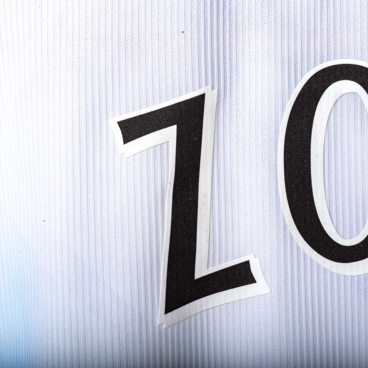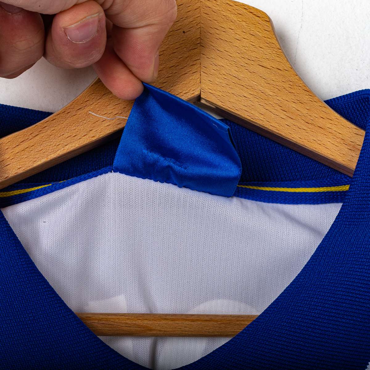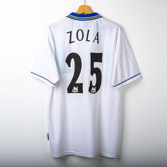 Maglia away del Chelsea della stagione 1999/2000. Logo Chelsea ricamato al centro della maglia. Logo Umbro applicato in flock sul petto. Sponsor Autoglass stampato frontalmente sempe in flock di colore blu. Sul retro sono presenti nome ZOLA e numero 25 in flock. Etichetta interna Umbro originale con indicazione Made in China. Taglia XL.