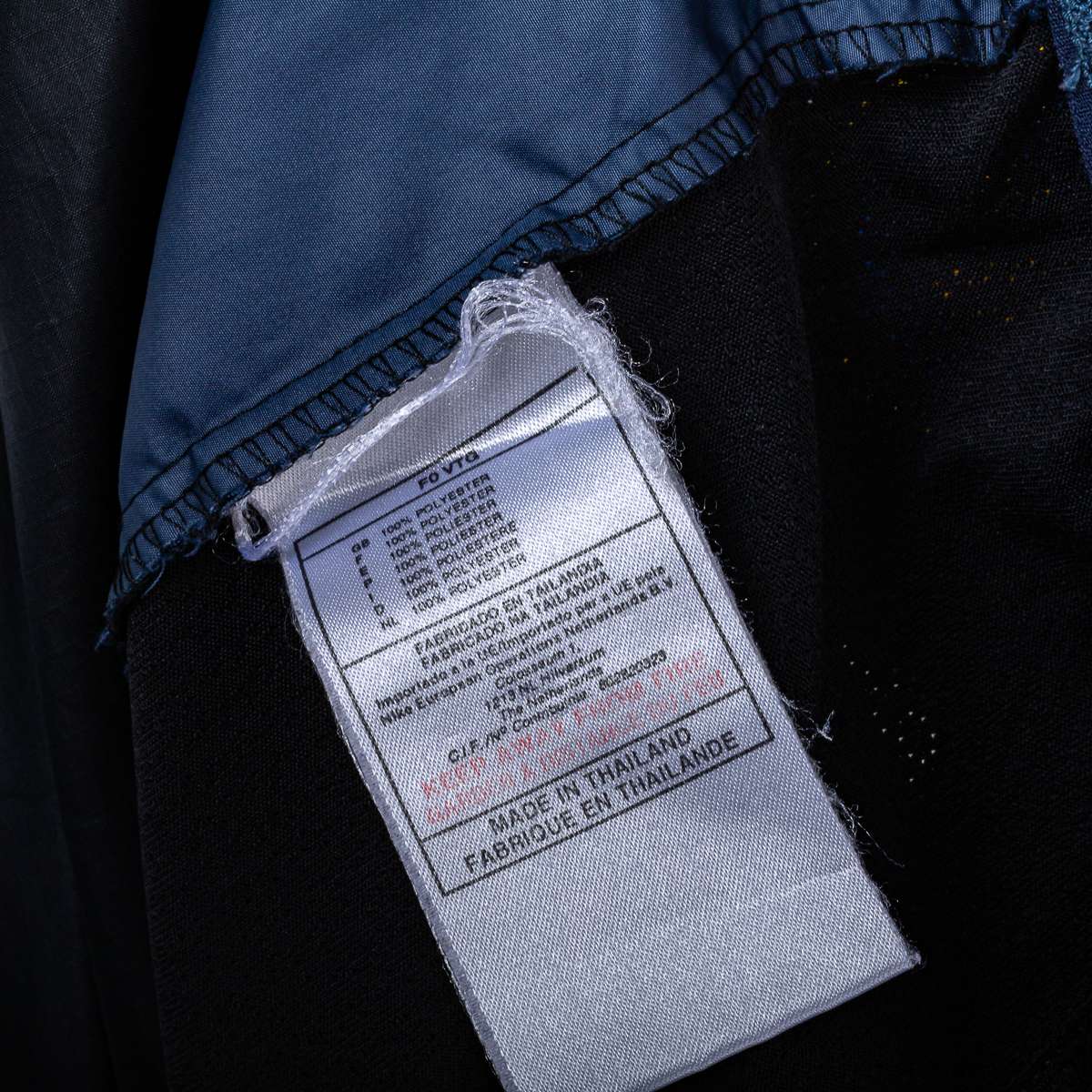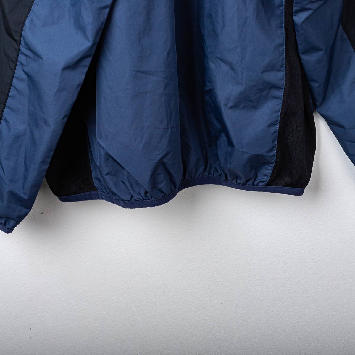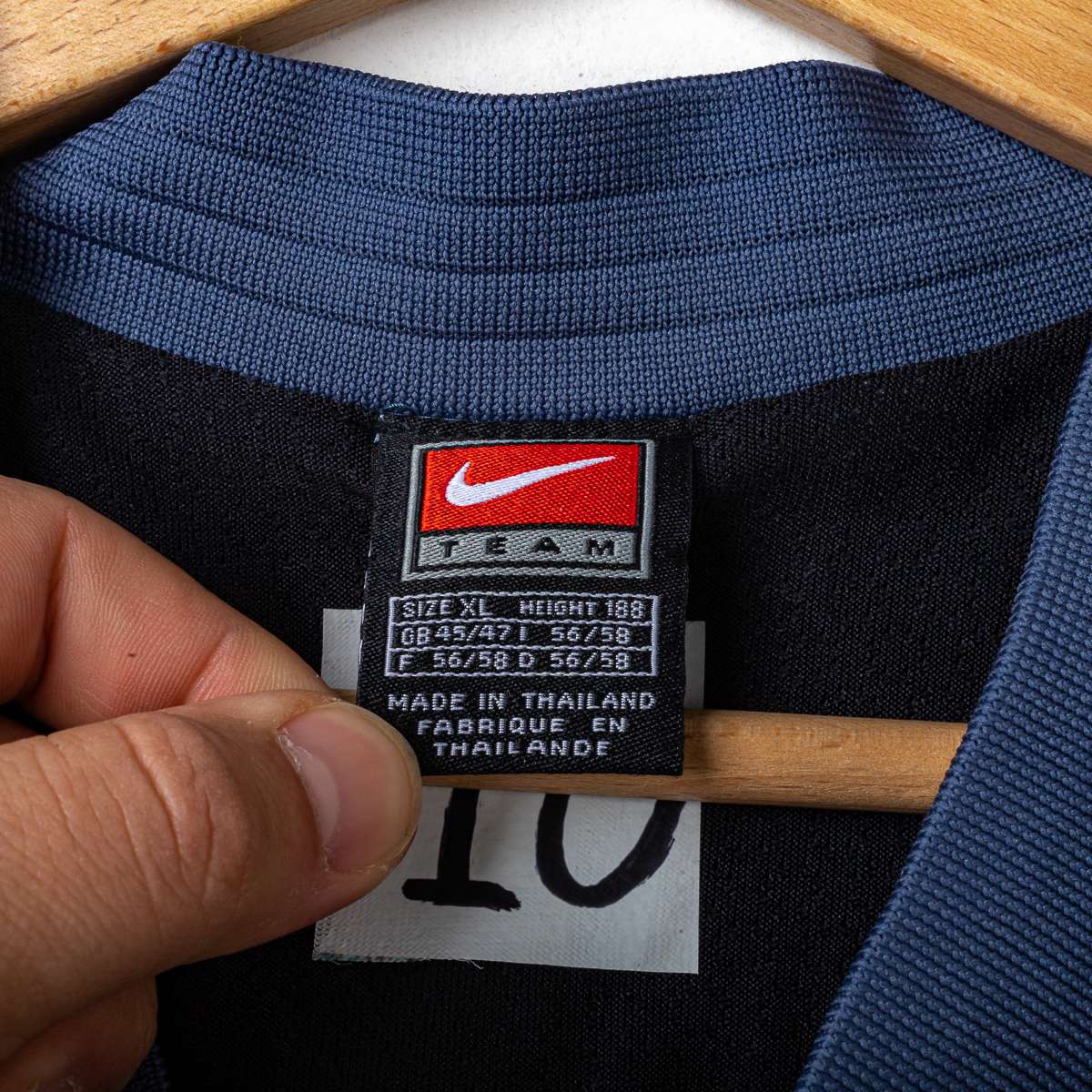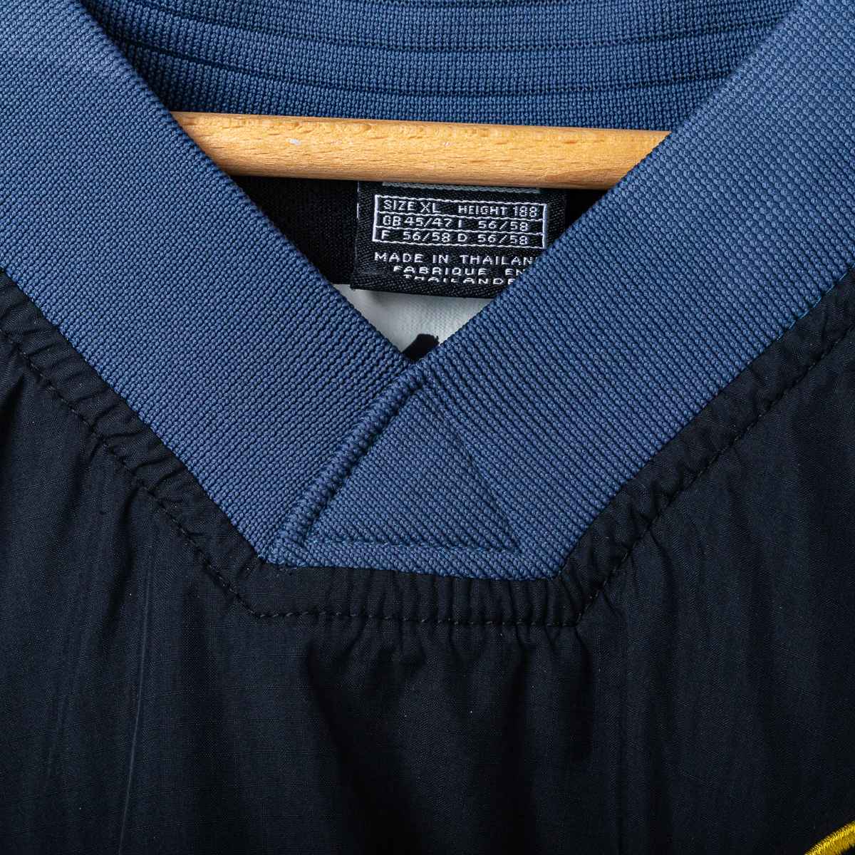 Giacca training ufficiale FC Internazionale Milano stagione 2000/2001, prodotta da Nike. Modello tecnico da allenamento realizzato in tessuto leggero sintetico, pensato per lo staff e i giocatori durante le sessioni di training. Colorazione nera con inserti blu scuro a contrasto e pannellature ergonomiche tipiche del design Nike dei primi anni Duemila. Collo a V elasticizzato, fondo e polsini elasticizzati per una vestibilità comoda e funzionale. Logo Nike ricamato sul petto lato destro, Stemma Inter 1908 applicato lato cuore. Sponsor Pirelli stampato in grande formato sul fronte. Sul retro è presente la scritta “INTER” cerchiata, elemento iconico dei capi training dell’epoca. Etichetta interna Nike Team con indicazione taglia XL e produzione Made in Thailand.