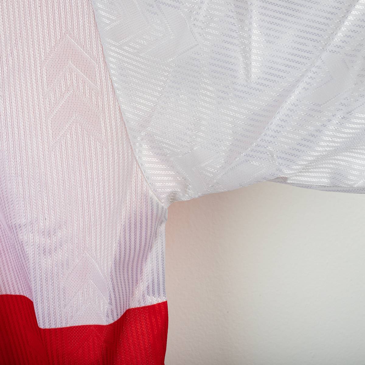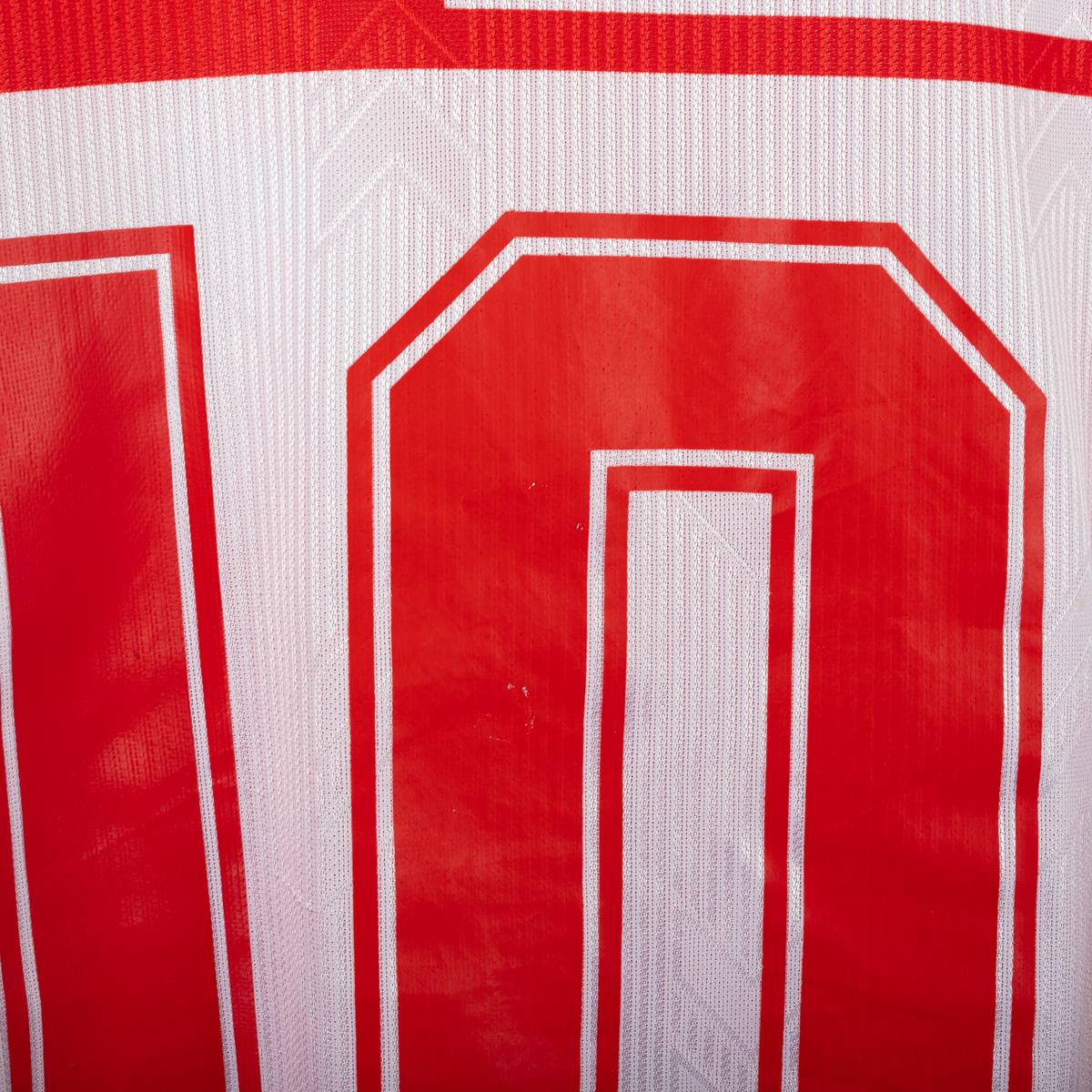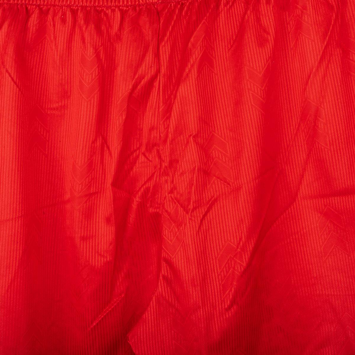 Completo home del Rimini Calcio stagione 2004/2005, prodotto da Hummel, composto da maglia e pantaloncini originali. Maglia a manica corta con classico design biancorosso a riquadri verticali e texture tono su tono con chevron Hummel. Colletto a V in maglia bianca con profilo rosso. Sul fronte sono presenti il logo Hummel , lo stemma Rimini Calcio ricamato lato cuore e lo sponsor Riviera di Rimini – La Riviera dei Parchi applicato in stampa. Sul retro numero 10 stampato. Pantaloncini coordinati con chevron Hummel laterali e stemma Rimini Calcio applicato. Taglia da etichetta L. Tessuto 100% poliestere. Completo originale d’epoca in buone condizioni generali, con normali segni di utilizzo e leggere tracce di usura sulla stampa del numero.