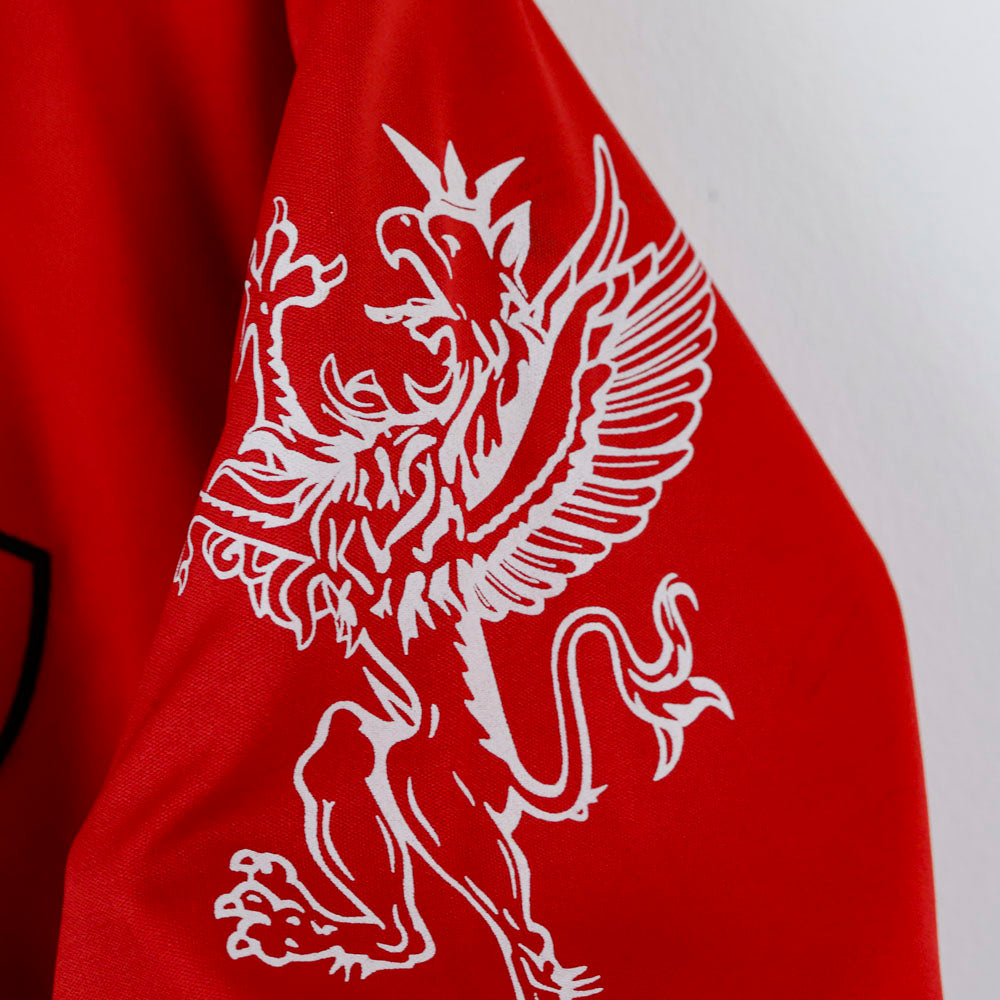Maglia home ufficiale del Perugia stagione 2013/2014 prodotta da FOG. Design essenziale con base rossa e colletto a polo bianco a contrasto, ripreso anche nei bordi manica. Stemma A.C. Perugia applicato lato cuore tramite patch cucita. Logo FOG posizionato sulla spalla tramite stampa. Grafica del grifone sulla manica realizzata tramite stampa. Scritta “A.C. Perugia” sul retro sotto il colletto applicata tramite stampa.