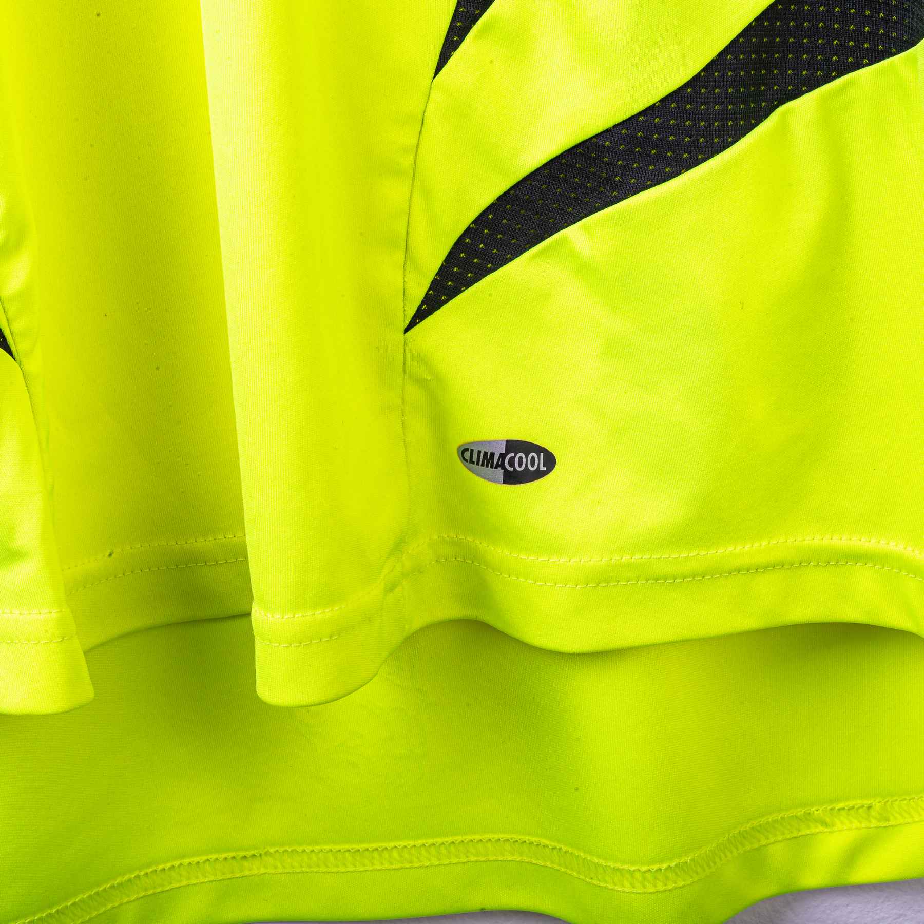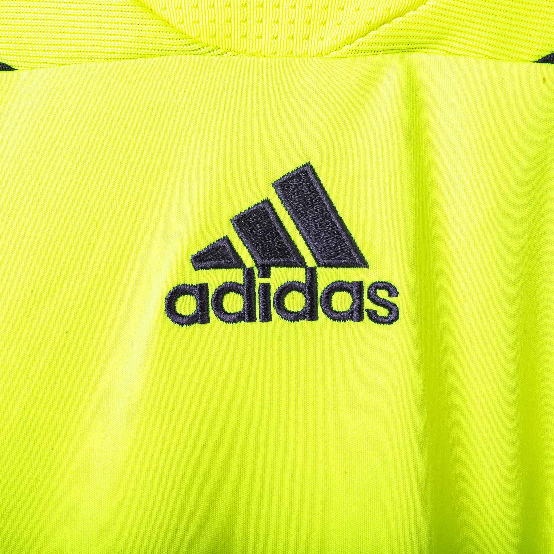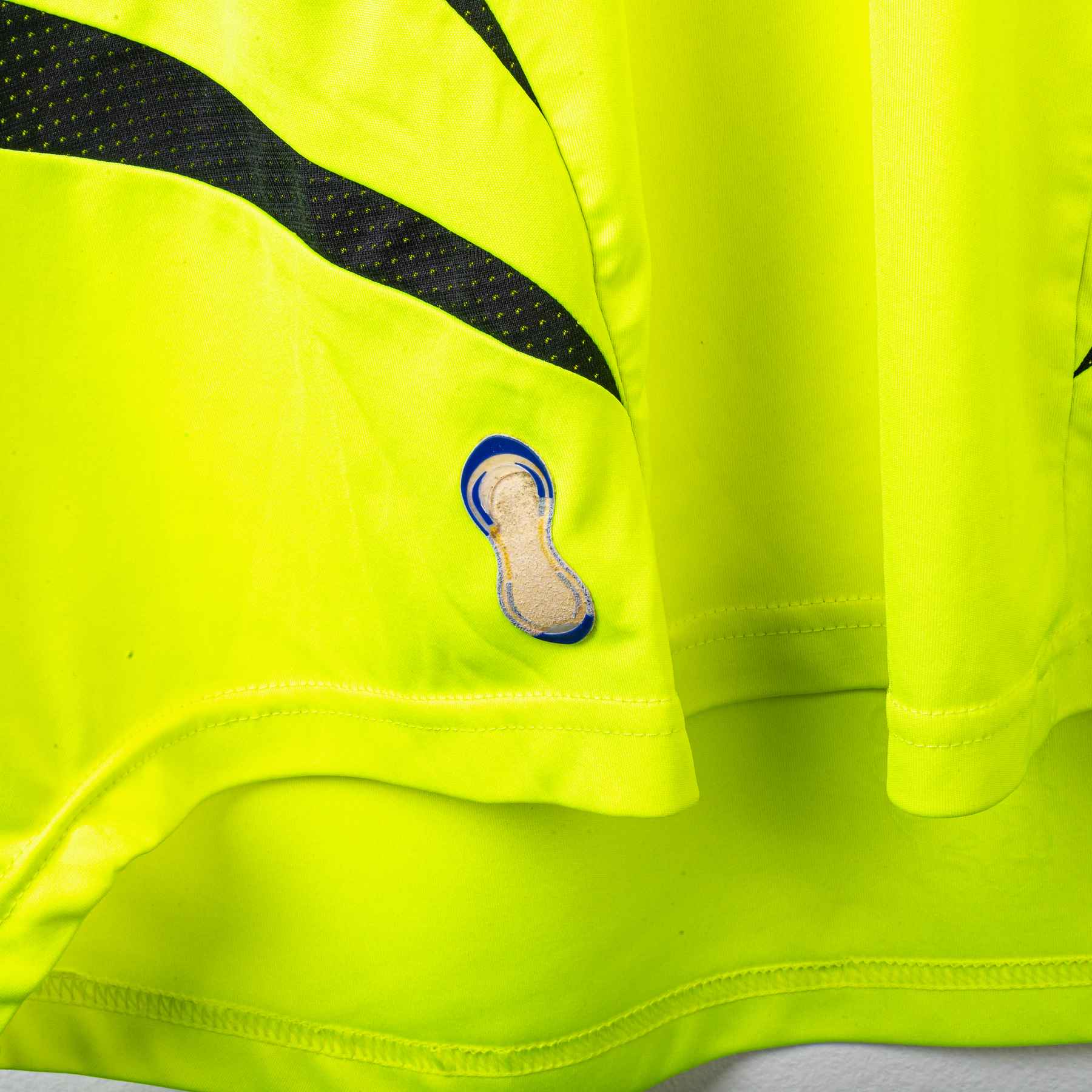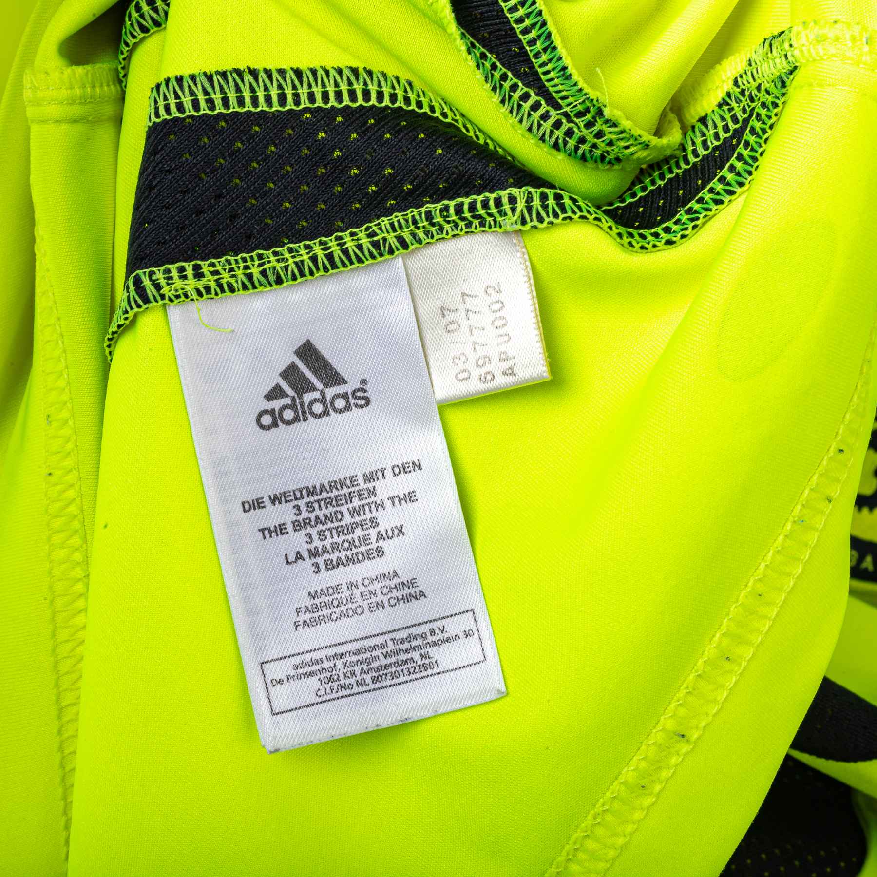 Maglia away del Chelsea stagione 2007/2008, realizzata da Adidas. Iconica colorazione giallo fluo con inserti e dettagli neri, pensata per la massima visibilità in campo. Design caratterizzato da ampi pannelli curvi in contrasto sul fronte e sui fianchi con inserti in mesh traspirante. Stemma Chelsea ricamato in versione monocromatica nero/giallo sul petto sinistro, logo Adidas ricamato in nero sul petto destro. Sponsor centrale “Samsung mobile” applicato in flock nero. Sul retro personalizzazione DROGBA 11. Colletto girocollo rinforzato con piccolo inserto in mesh, tecnologia Clima/Climacool Adidas per migliorare la traspirazione. Etichette Adidas interne e laterali originali, codice prodotto stampato sulla label interna.
