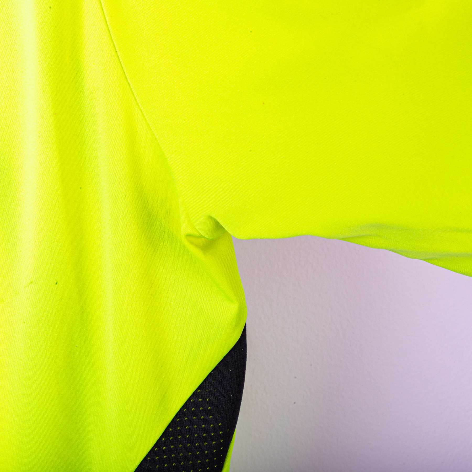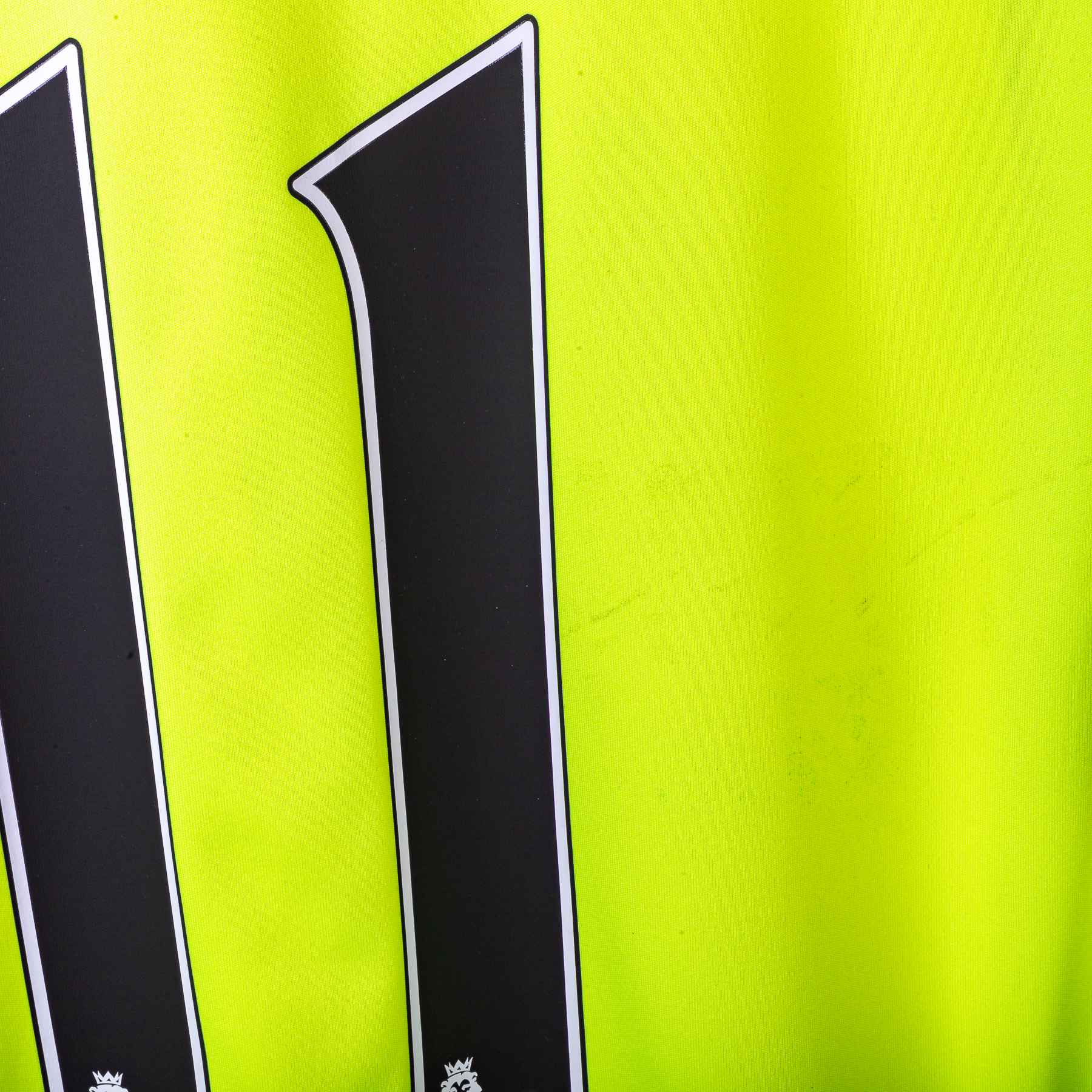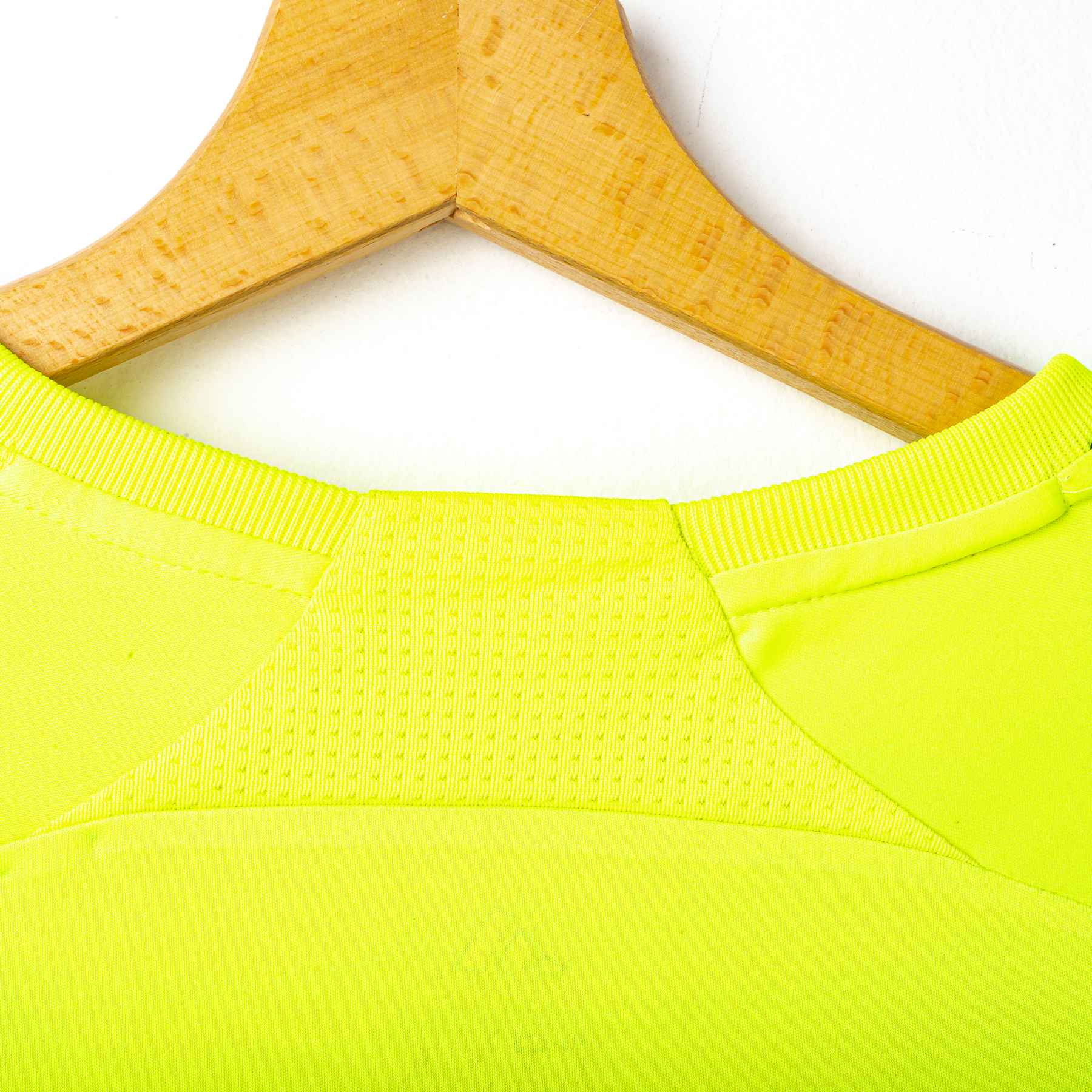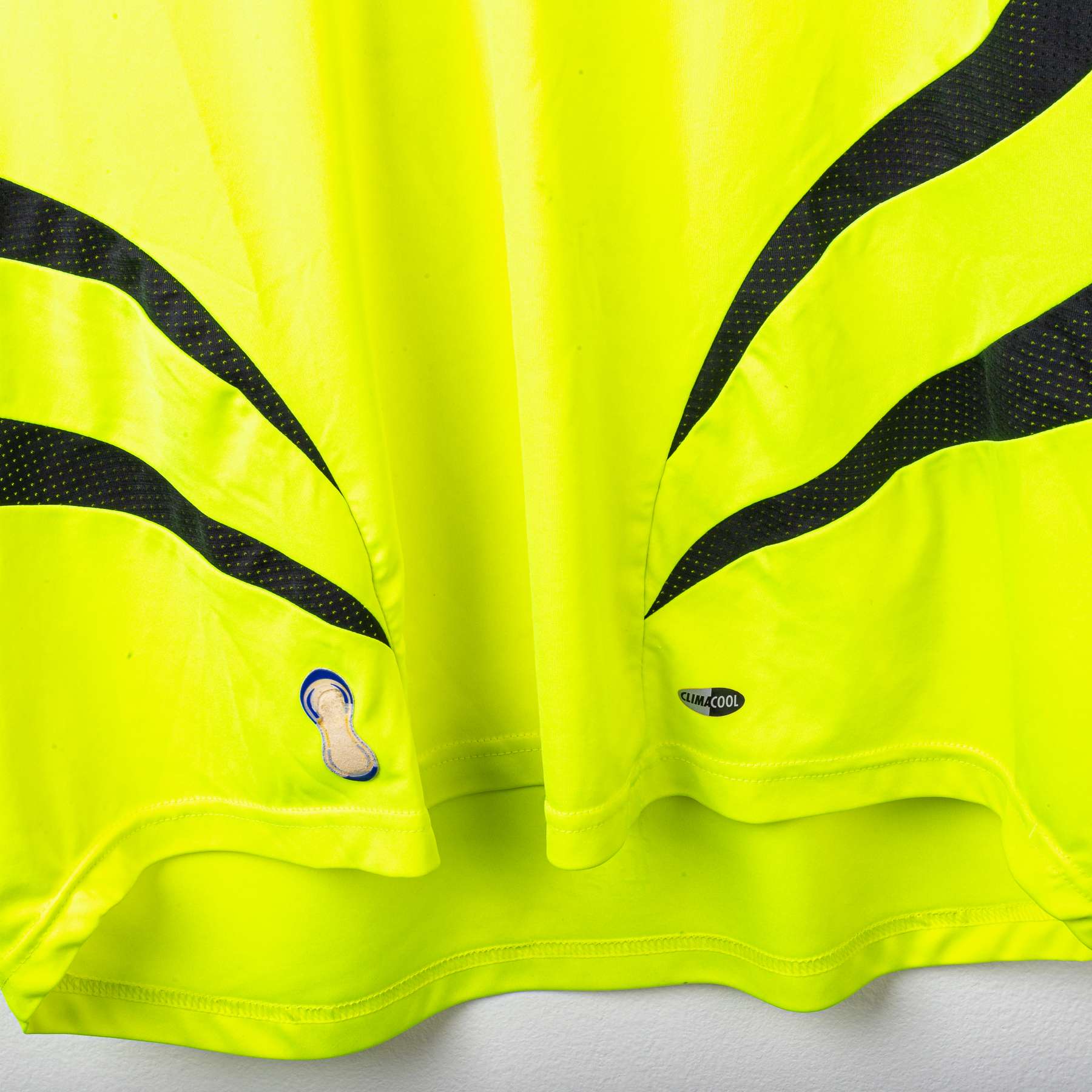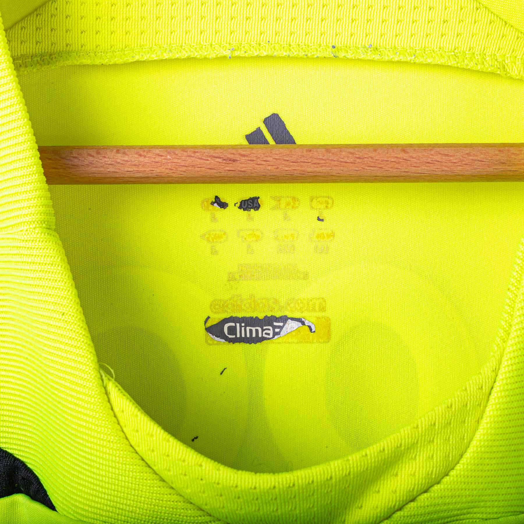 Maglia away del Chelsea stagione 2007/2008, realizzata da Adidas. Iconica colorazione giallo fluo con inserti e dettagli neri, pensata per la massima visibilità in campo. Design caratterizzato da ampi pannelli curvi in contrasto sul fronte e sui fianchi con inserti in mesh traspirante. Stemma Chelsea ricamato in versione monocromatica nero/giallo sul petto sinistro, logo Adidas ricamato in nero sul petto destro. Sponsor centrale “Samsung mobile” applicato in flock nero. Sul retro personalizzazione DROGBA 11. Colletto girocollo rinforzato con piccolo inserto in mesh, tecnologia Clima/Climacool Adidas per migliorare la traspirazione. Etichette Adidas interne e laterali originali, codice prodotto stampato sulla label interna.