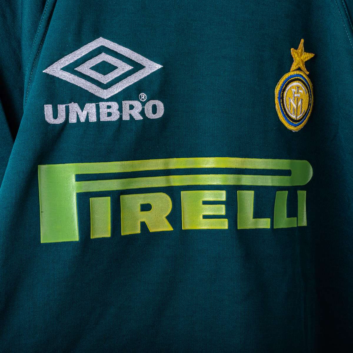 Maglia da allenamento dell’Inter stagione 1995/1996, prodotta da Umbro. Modello a manica corta in tonalità verde petrolio, con collo girocollo e spalle rinforzate a pannelli testurizzati in maglia. Sul fronte sono presenti il logo Umbro applicato, lo stemma Inter lato cuore con stella e lo sponsor Pirelli in stampa gommata verde fluo. Sul retro è presente il logo Umbro stampato nella parte alta. Dettagli Umbro aggiuntivi sulle maniche, inclusa patch “Umbro Training”. Tessuto tecnico ideale per training. Taglia da etichetta XXL.