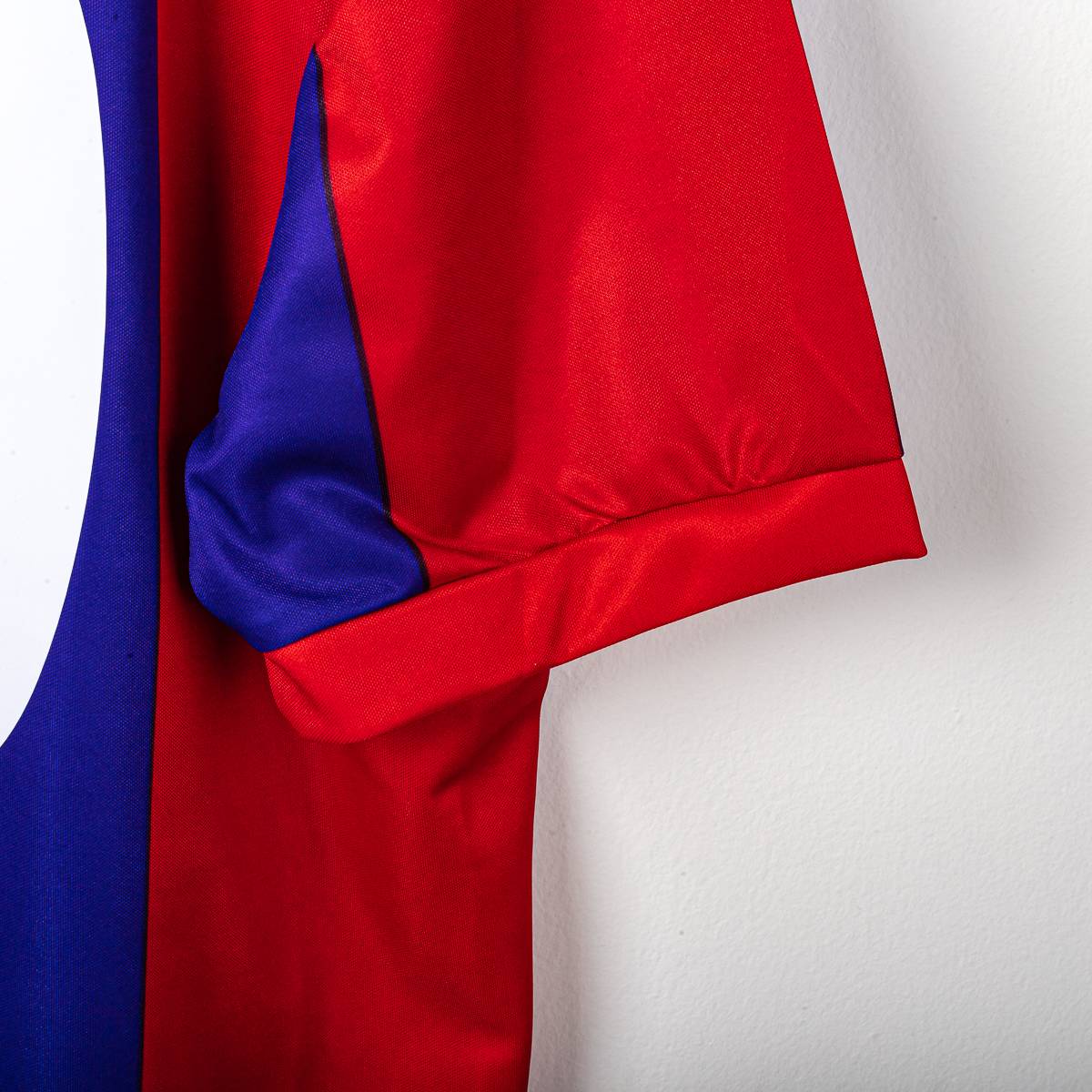 Maglia home del Bologna FC stagione 2002/2003, prodotta da Macron. Modello a manica corta con classiche bande verticali rossoblù, colletto a girocollo con rifiniture a contrasto. Sul fronte sono presenti il logo Macron e lo sponsor AreaBanca applicati in flock, con stemma ufficiale Bologna FC 1909 cucito lato cuore. Sul retro personalizzazione Signori 10 in stampa bianca, con scritta Bologna FC 1909 all’interno del colletto posteriore. Taglia da etichetta L.