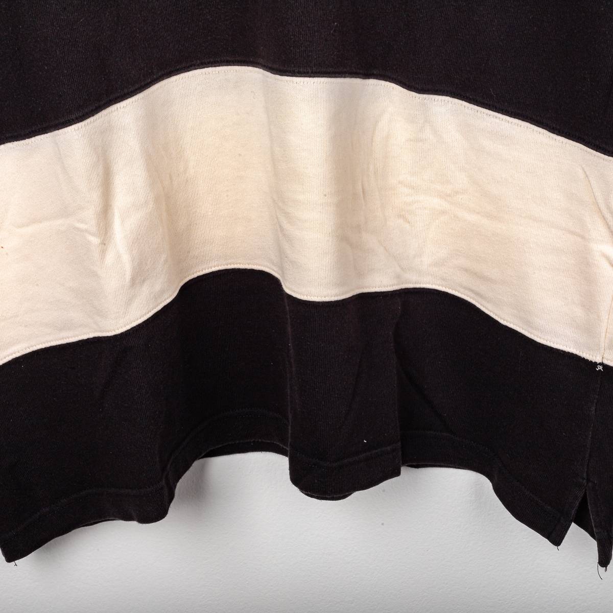 Polo ufficiale della Juventus stagione 1997/1998, prodotta da Kappa. Modello a manica corta in stile rugby, con iconico design a bande orizzontali bianche e nere e colletto classico con chiusura a lacci. Sul fronte sono applicati il logo Kappa ricamato e lo stemma Juventus d’epoca con due stelle, cucito lato cuore. Sul retro è presente il logo Kappa ricamato sotto il colletto.Taglia da etichetta XL.
