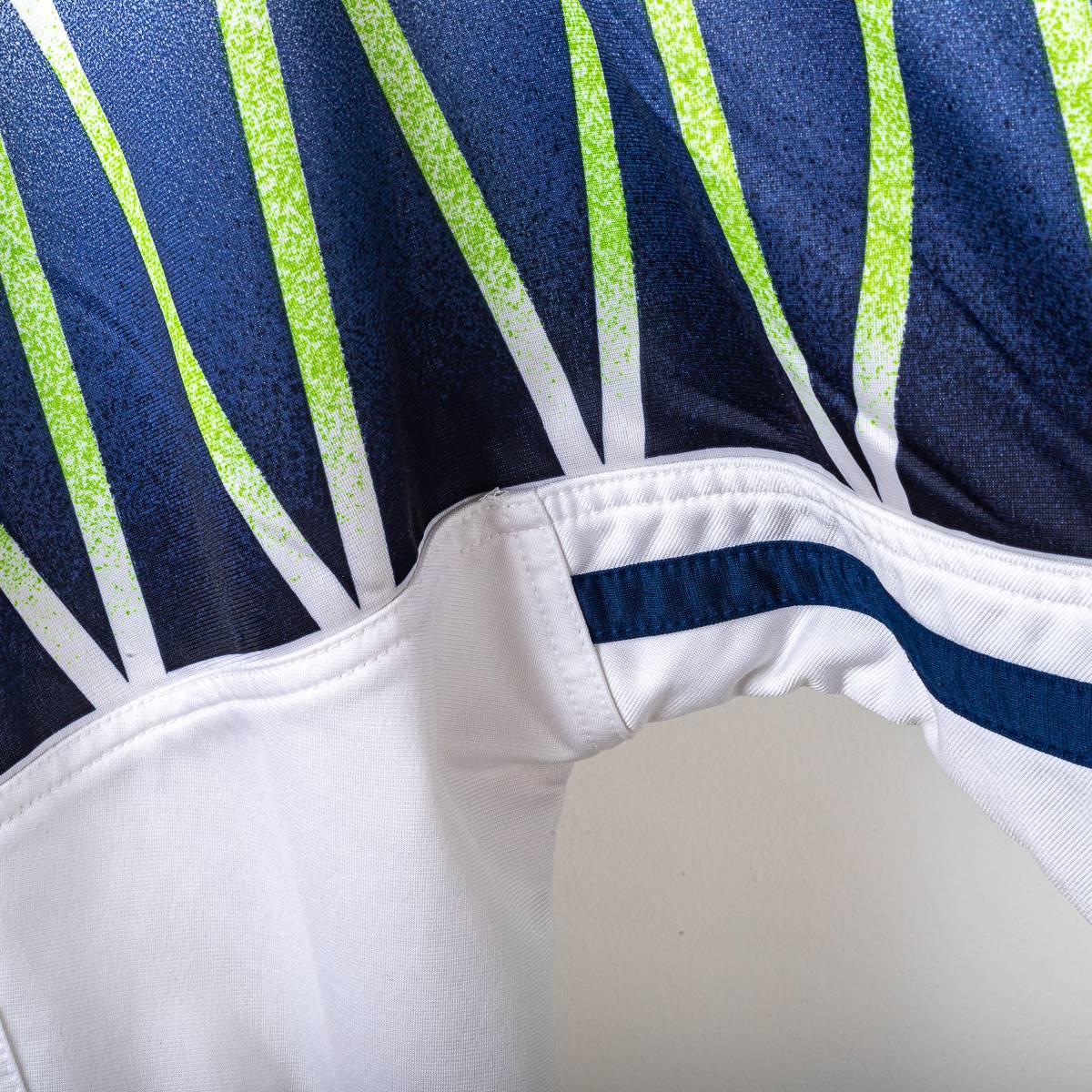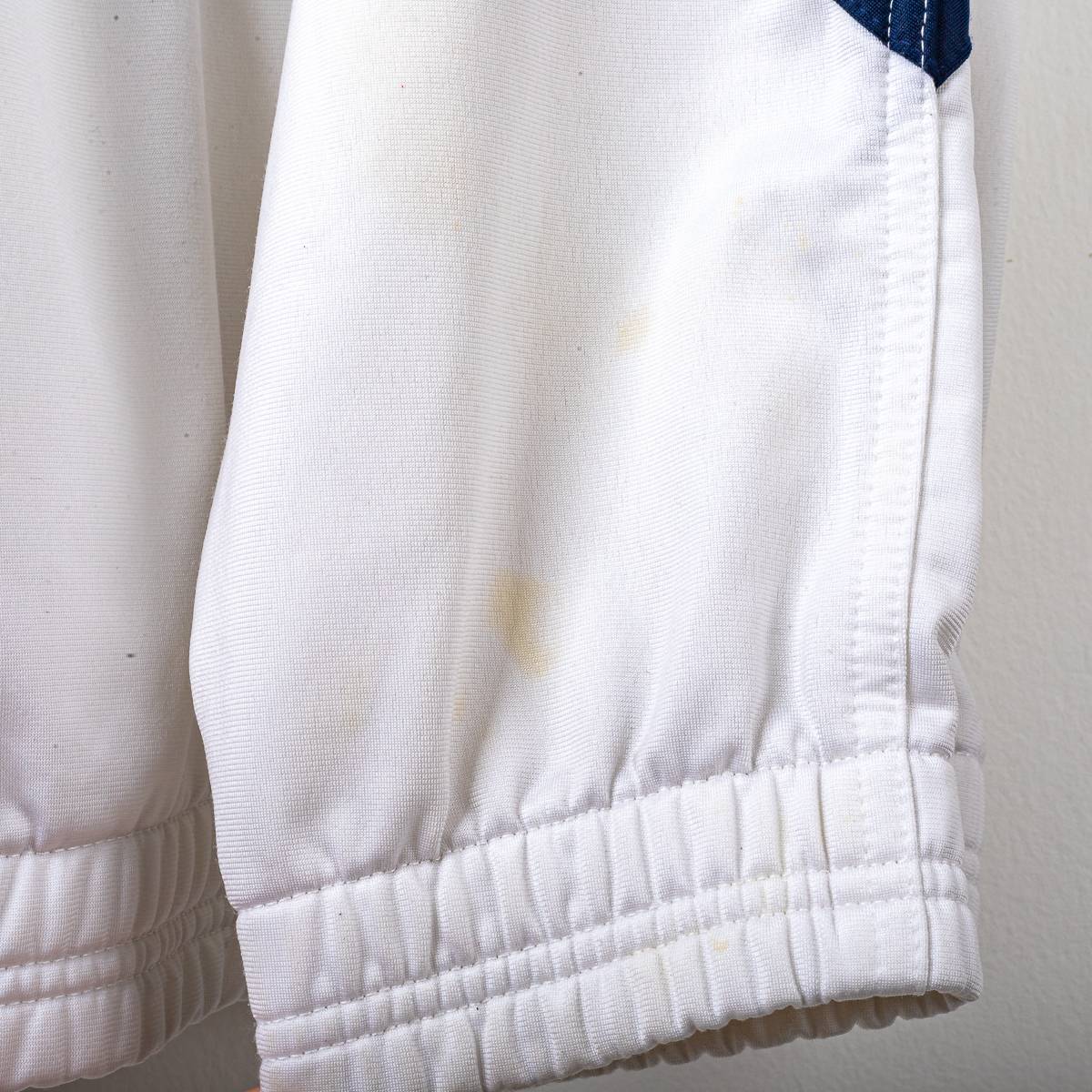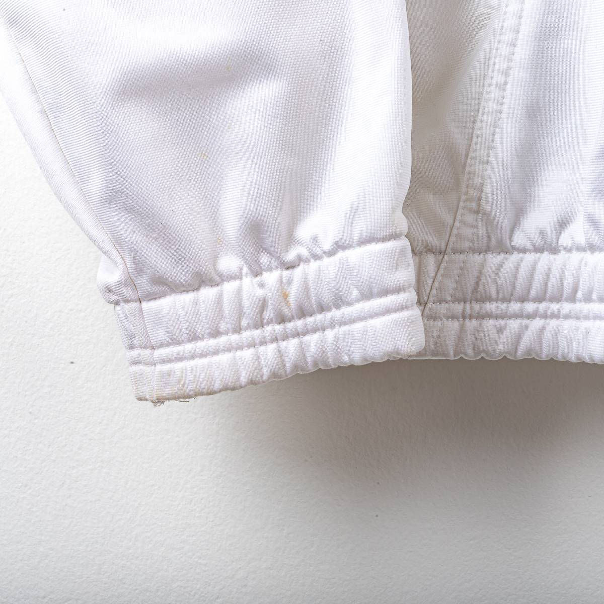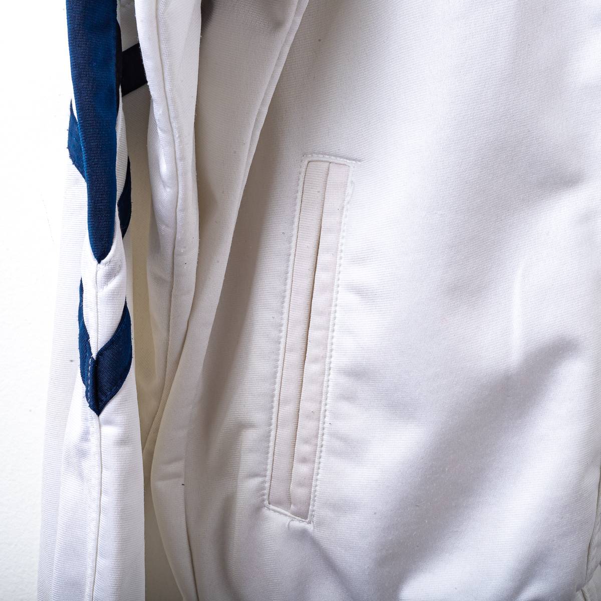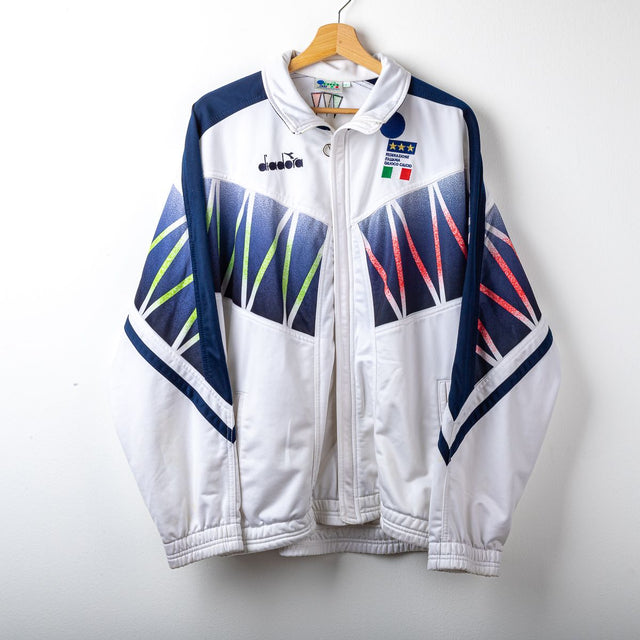Giacca rappresentanza della Nazionale Italiana di calcio, realizzata da Diadora in occasione dei Mondiali USA 1994. Modello di colore bianco con inserti blu navy sulle spalle e lungo le maniche, arricchito da grafiche geometriche multicolor ispirate allo stile anni ’90. Chiusura frontale con zip integrale e colletto alto. Tessuto tecnico 100% poliestere con interno leggermente felpato, ideale come capo da rappresentanza e collezione. Taglia da etichetta L.