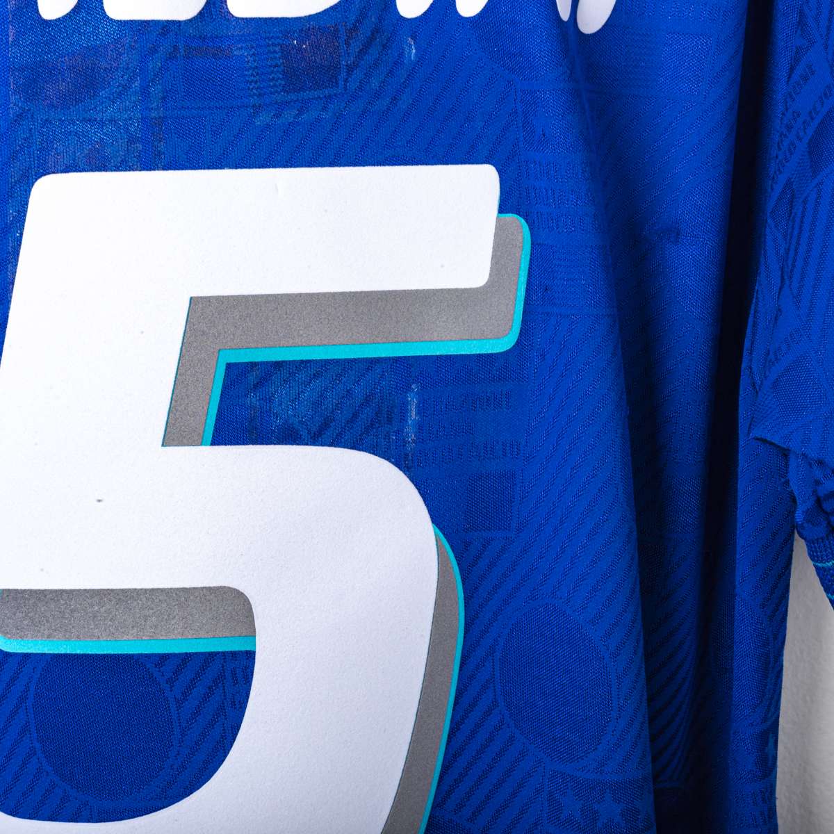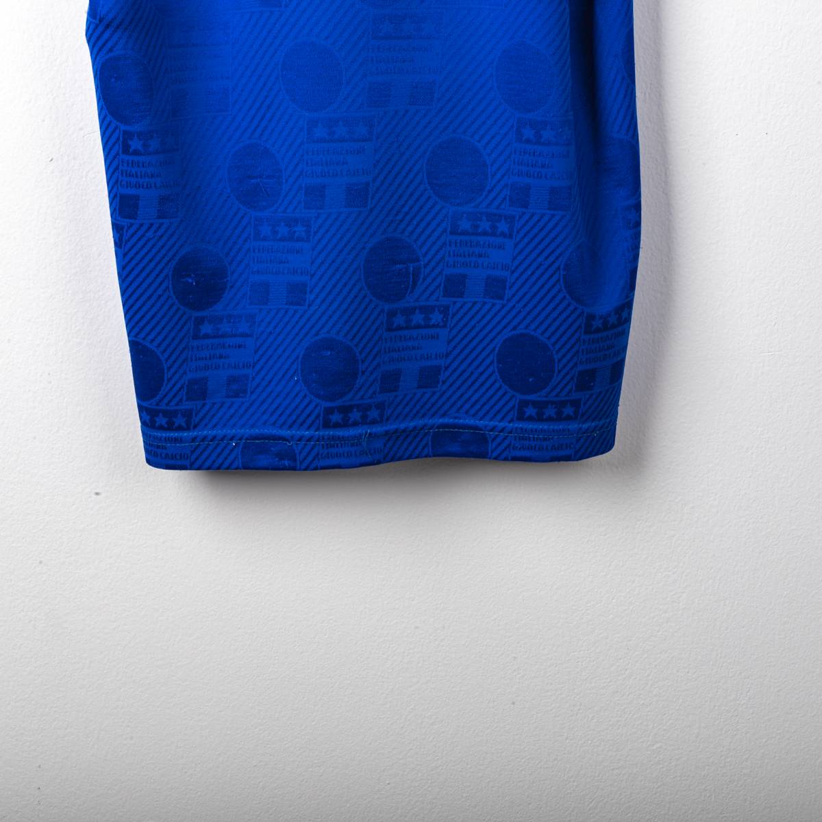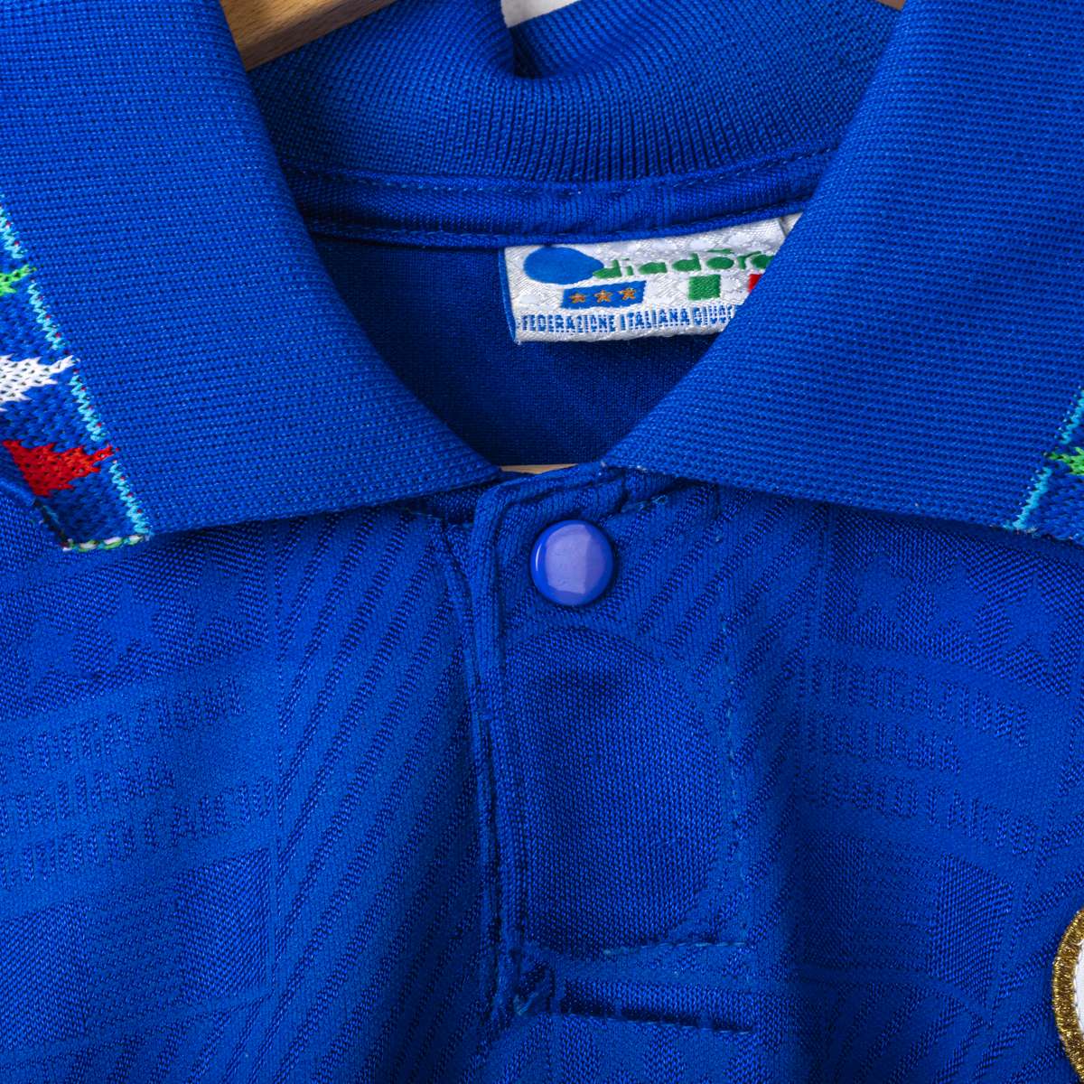 Maglia home della Nazionale Italiana del Mondiale USA 1994. Presenta la classica colorazione azzurra con trama jacquard tono su tono. Colletto a polo con chiusura a bottone. Logo Federazione Italiana Giuoco Calcio cucito ed il Numero 5 applicato sul fronte in materiale vellutato. Nome MALDINI e numero 5 applicati sul retro in flock. Etichetta interna Diadora FIGC. Vestibilità regolare. Misure indicative: altezza 78 cm, larghezza torace 46,5 cm.