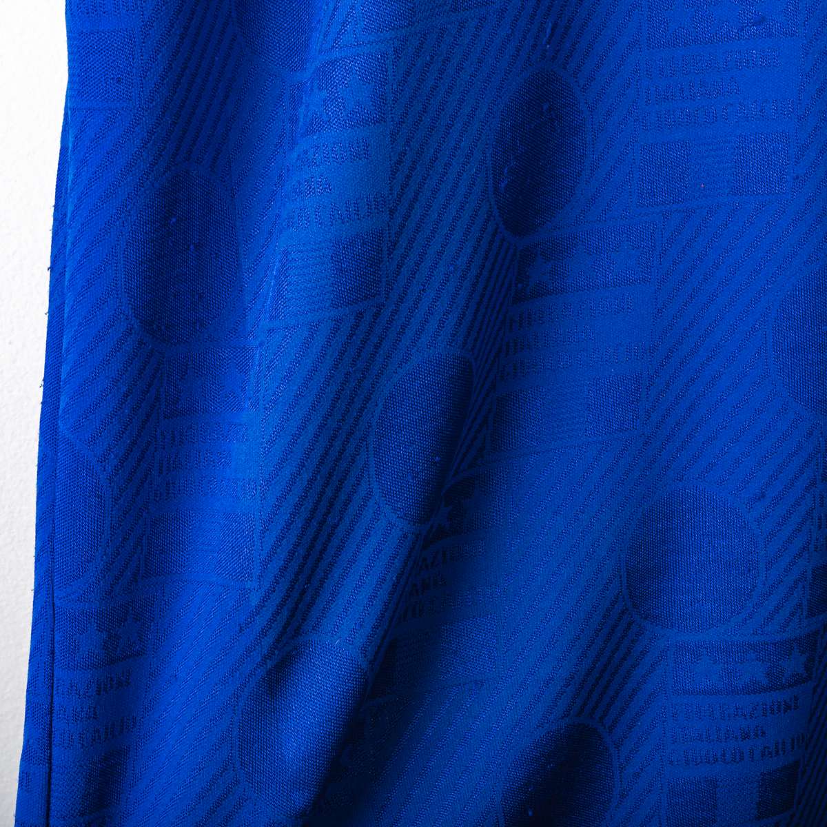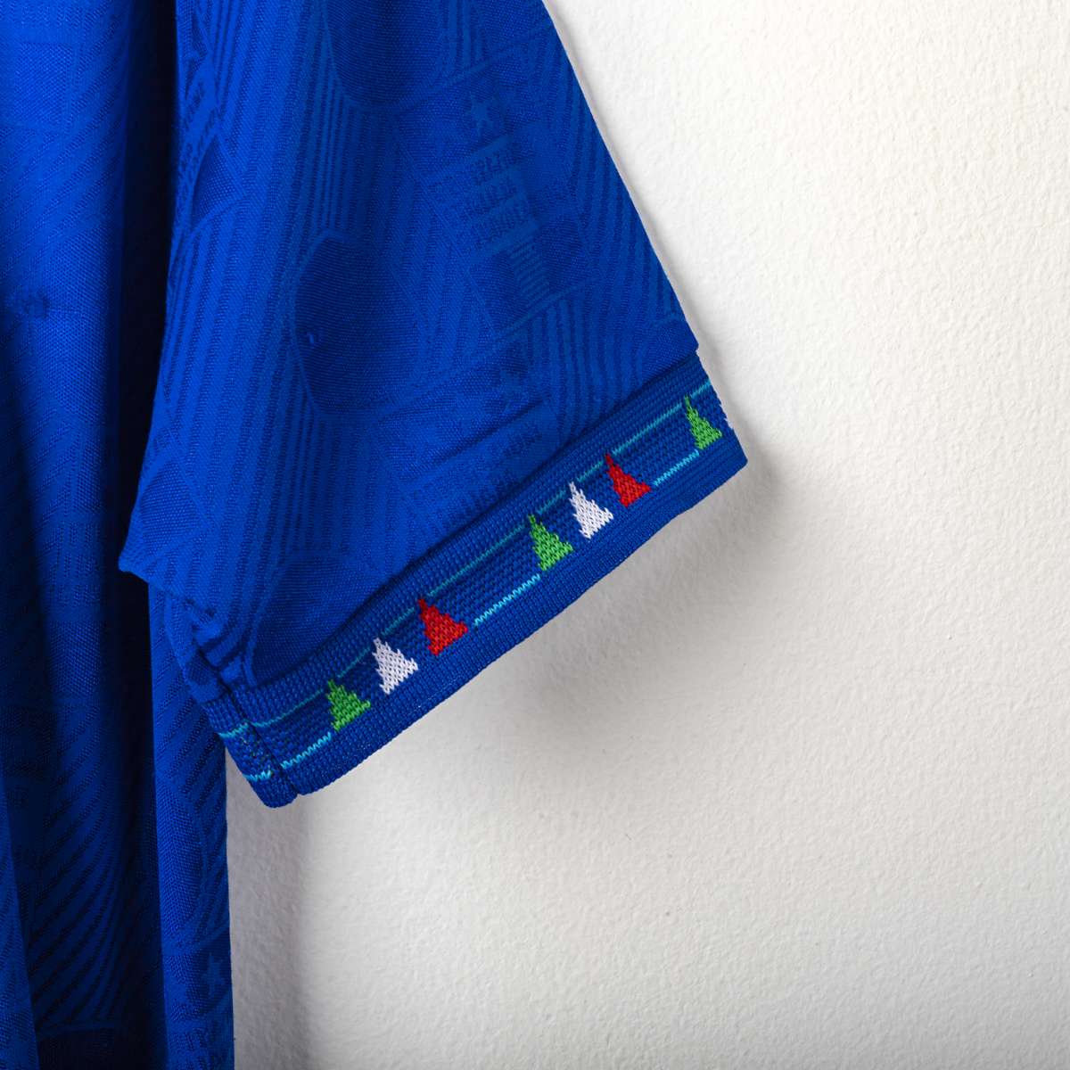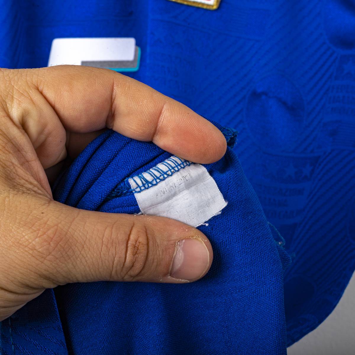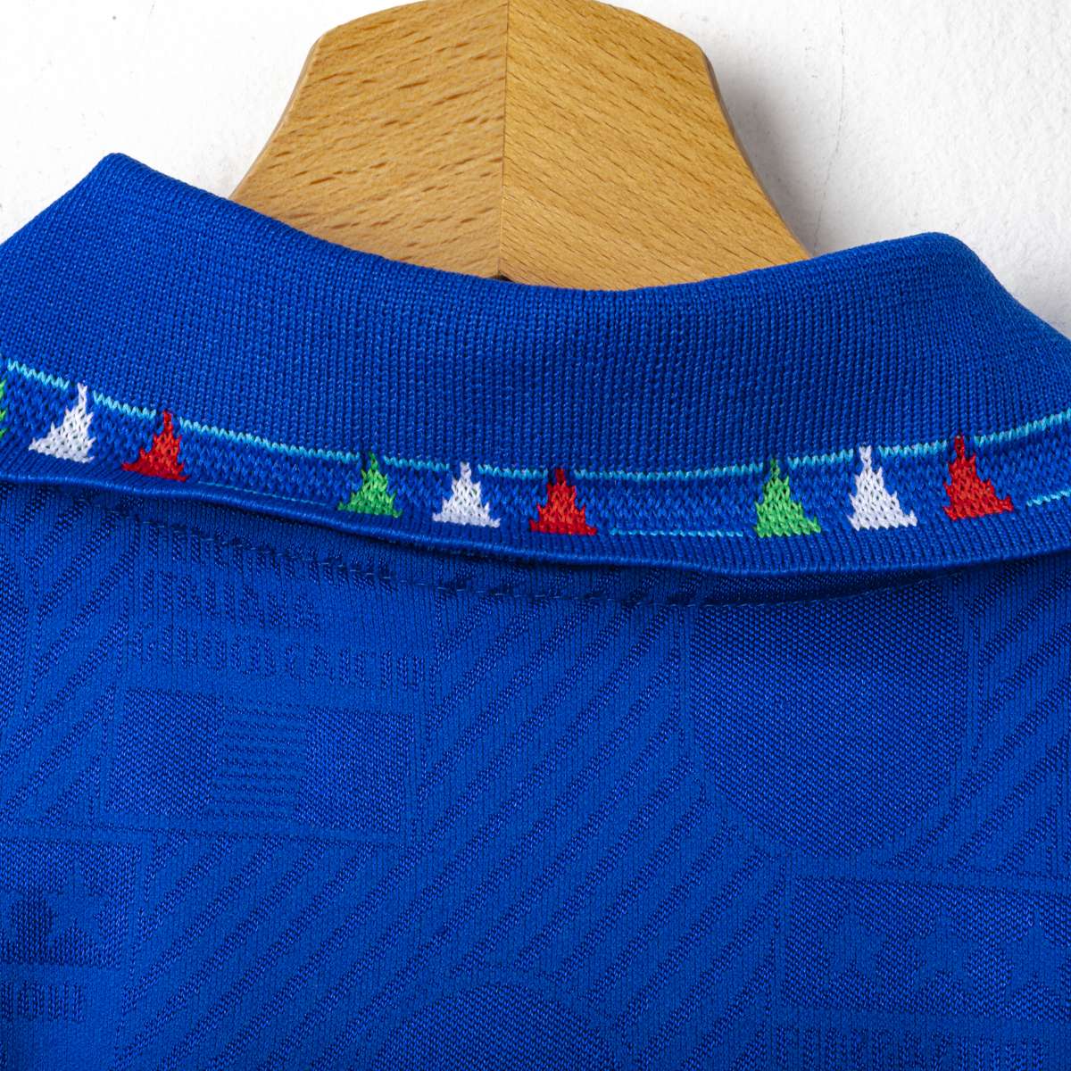 Maglia home della Nazionale Italiana del Mondiale USA 1994. Presenta la classica colorazione azzurra con trama jacquard tono su tono. Colletto a polo con chiusura a bottone. Logo Federazione Italiana Giuoco Calcio cucito ed il Numero 5 applicato sul fronte in materiale vellutato. Nome MALDINI e numero 5 applicati sul retro in flock. Etichetta interna Diadora FIGC. Vestibilità regolare. Misure indicative: altezza 78 cm, larghezza torace 46,5 cm.
