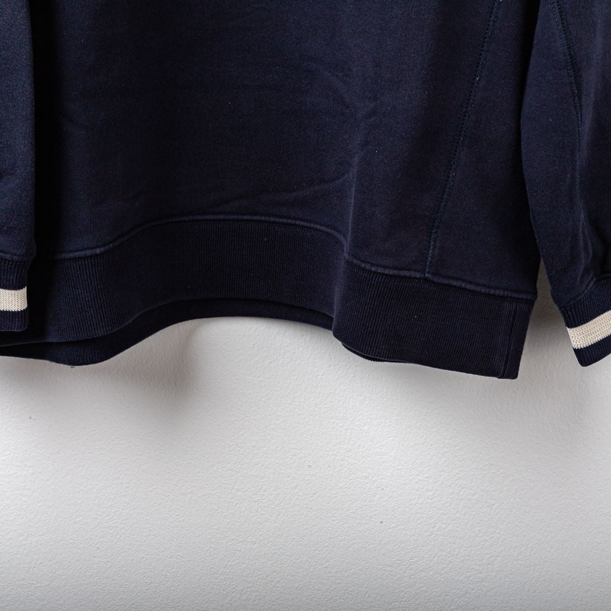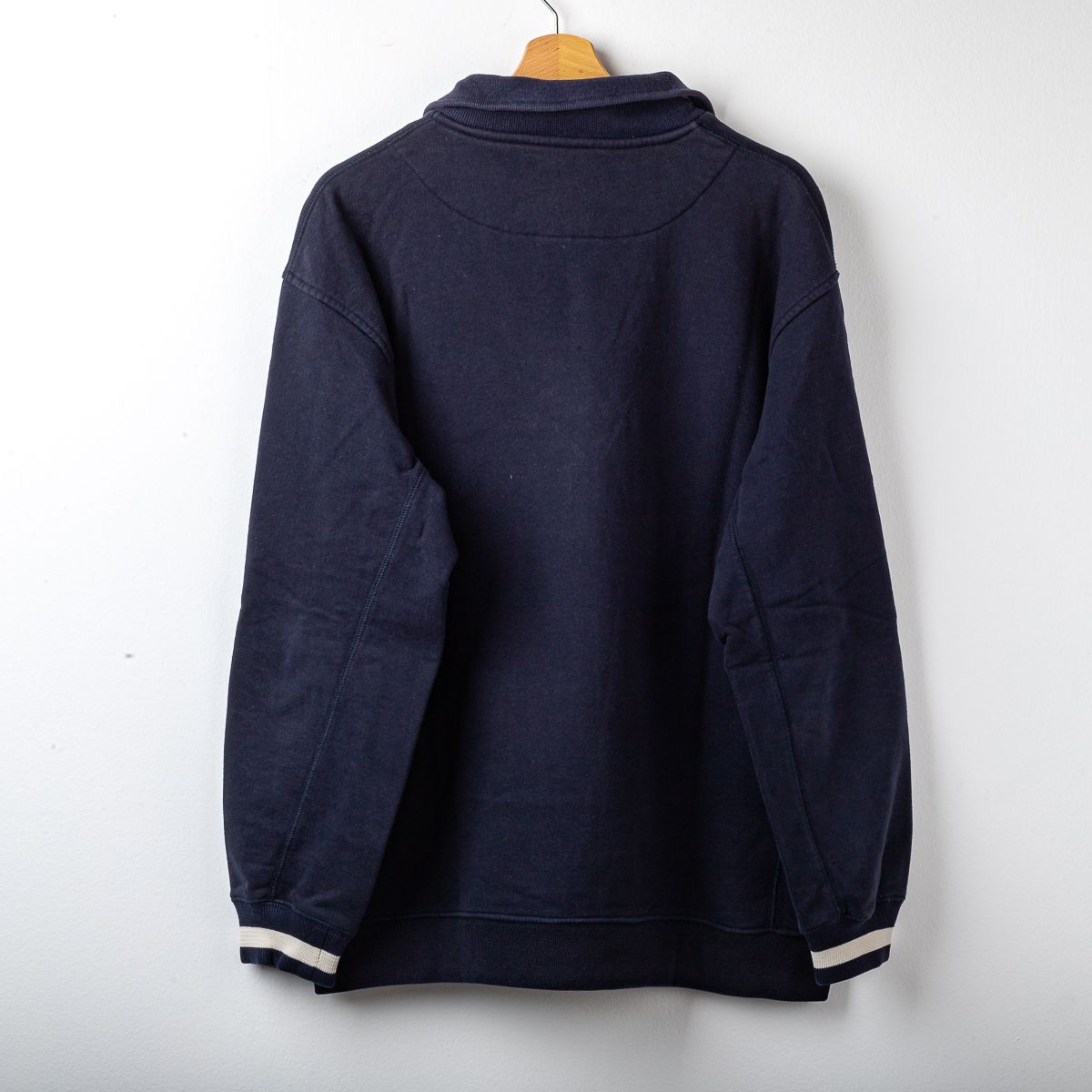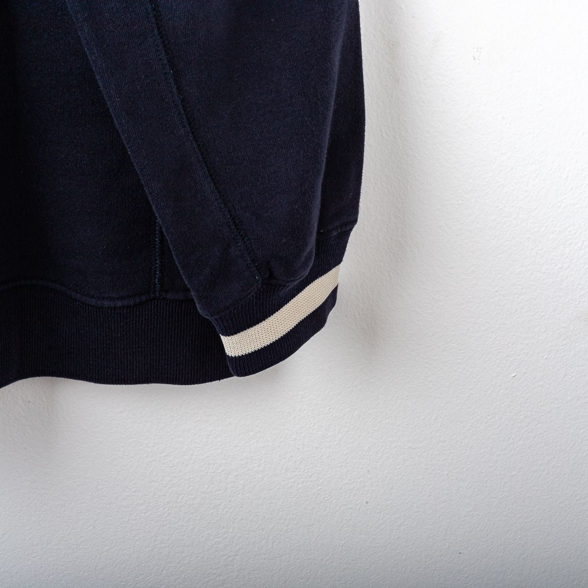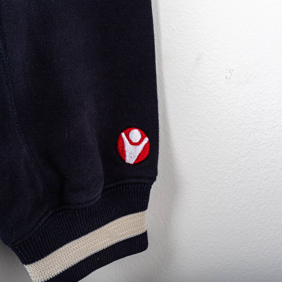 Giacca ufficiale del Bologna F.C. stagione 2005/2006, prodotta da Macron. Modello di colore blu navy con chiusura a mezza zip frontale e colletto alto. Sul fronte sono applicati il logo Macron ricamato, lo stemma Bologna F.C. ricamato lato cuore e la patch sponsor Euro Ponteggi ricamata al centro. Presente la scritta “Bologna F.C. 1909” ricamata in bianco con profili rossi. Polsini elasticizzati con dettaglio a contrasto. Tessuto felpato ideale per allenamento e rappresentanza. Taglia da etichetta XL.