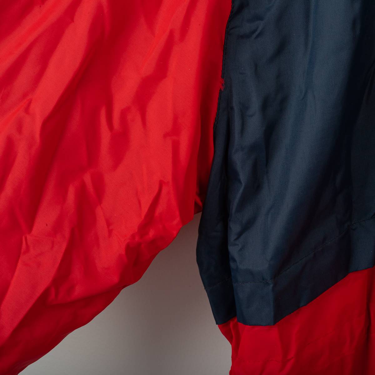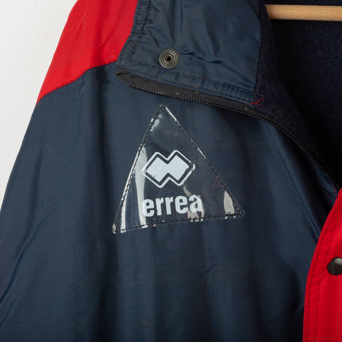 Giaccone invernale del Cagliari Calcio stagione 1994/1995 prodotto da Errea. Modello panchina imbottito, realizzato in nylon rosso e blu navy con pannelli a contrasto. Chiusura frontale con zip coperta da patta e bottoni a pressione, tasche anteriori con pattina, polsini elastici e coulisse regolabile sul fondo. Colletto alto con cappuccio ripiegato all’interno tramite zip. Sul petto logo Errea applicato e stemma Cagliari Calcio ricamato lato cuore, affiancato patch sponsor “Pecorino Sardo”. Sul retro scritta Errea e grande logo “Pecorino Sardo” stampati. Interno con fodera in caldo cotone tipo pile per una migliore protezione dal freddo. Taglia XL, produzione Made in Italy.