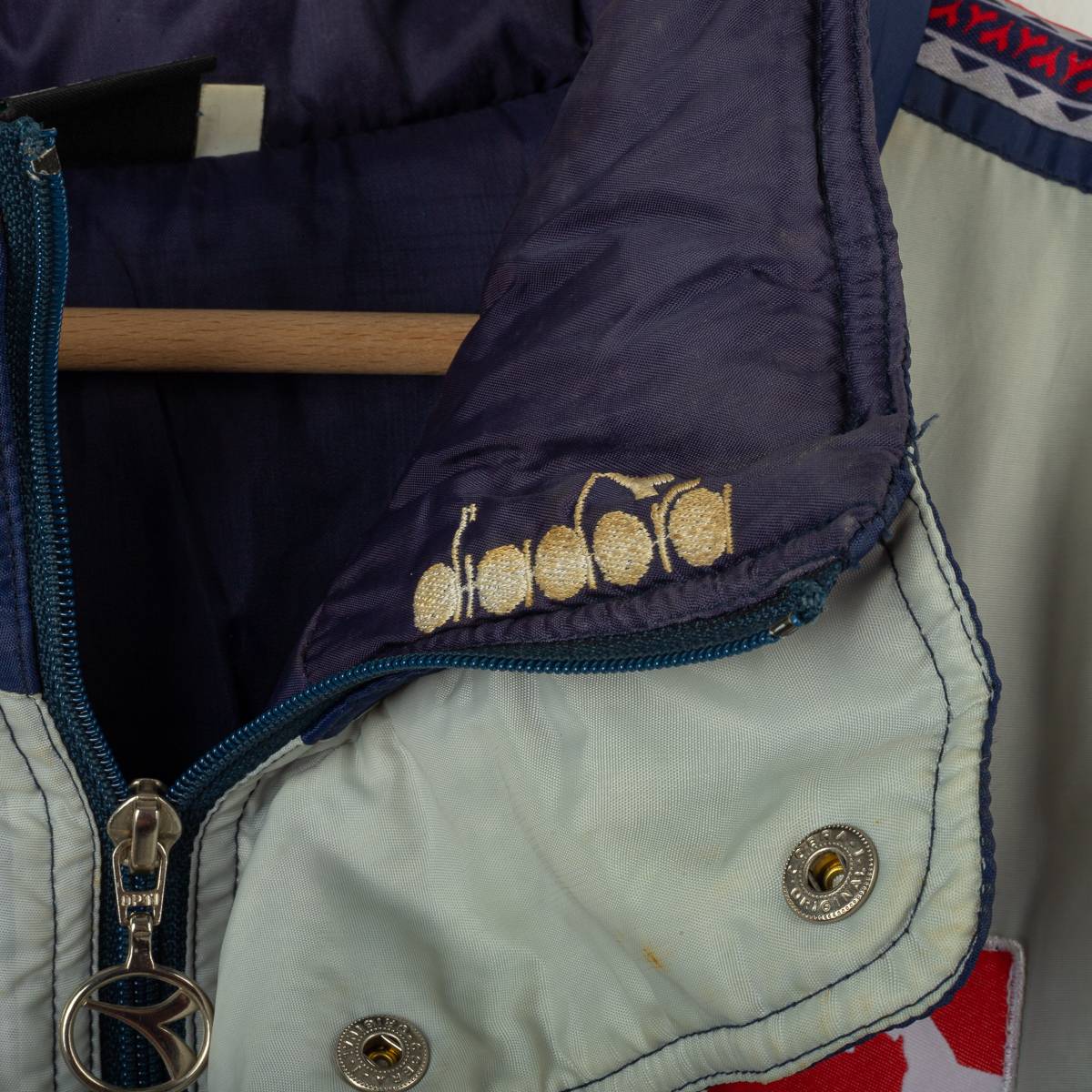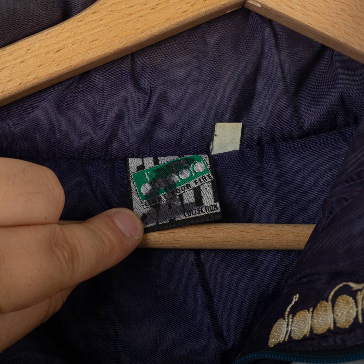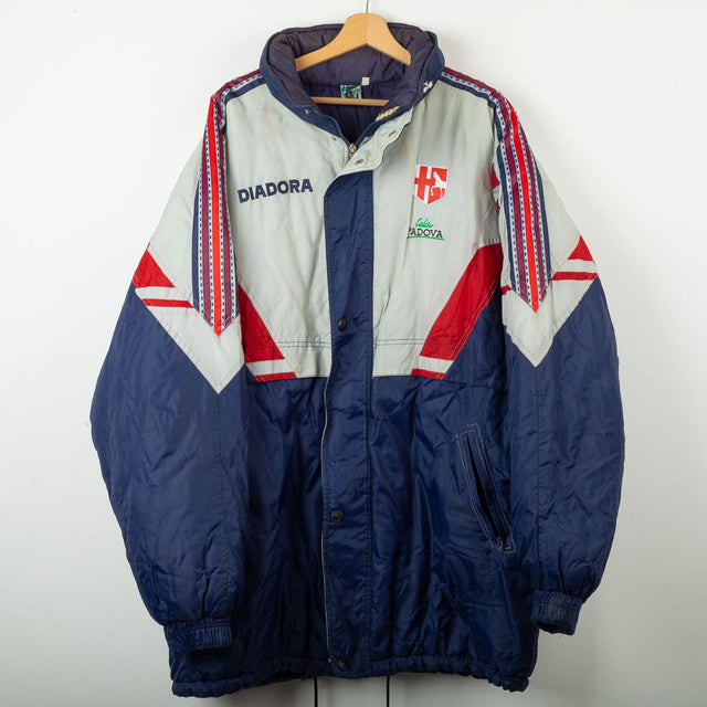 Giaccone invernale del Calcio Padova stagione 1996/1997 prodotto da Diadora. Modello panchina imbottito, realizzato in nylon blu navy con ampi inserti grigio chiaro e dettagli rossi sulle maniche e sulle spalle. Chiusura con zip e bottoni a pressione, tasche laterali con zip, polsini elastici e coulisse regolabile sul fondo. Logo Diadora ricamato sul petto destro e stemma del Padova applicato lato cuore con ricamo “Calcio Padova”. Sul retro maxi logo Diadora e sponsor “Millionaire Market” stampati, con naturale usura della stampa dovuta al tempo. Colletto alto imbottito per una maggiore protezione dal freddo. Taglia XL, vestibilità ampia.