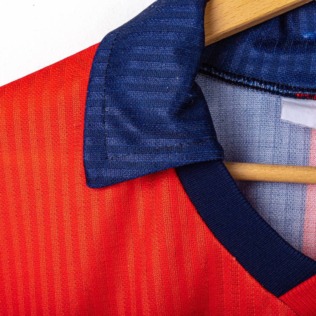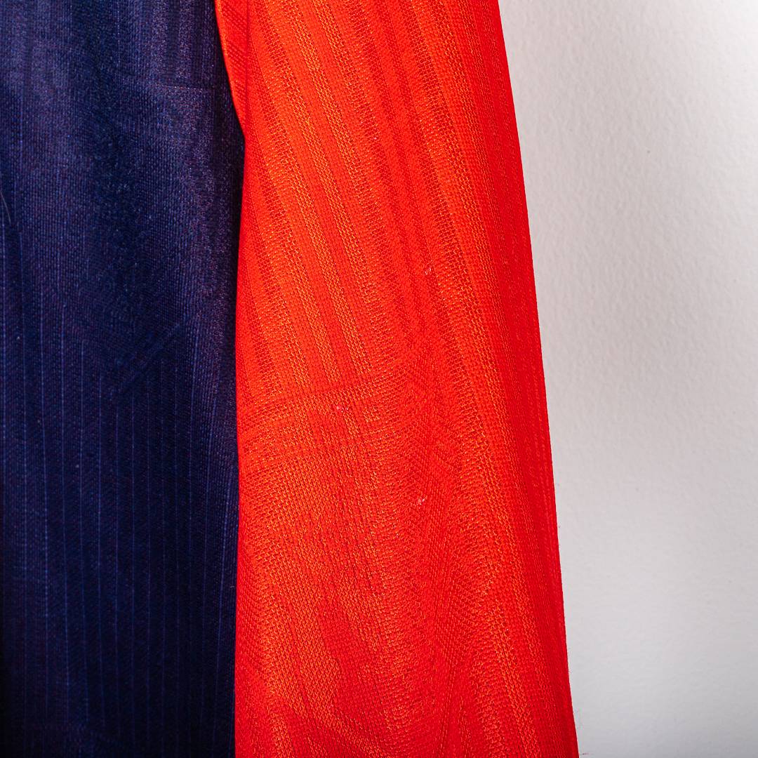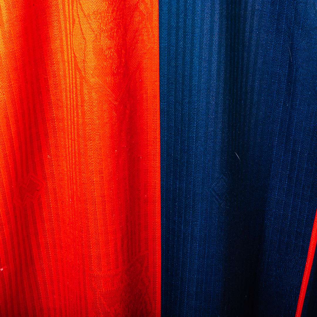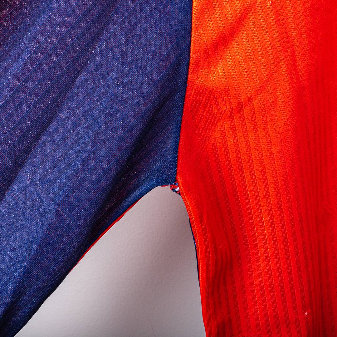 Maglia home del Genoa CFC stagione 1990/1991, prodotta da Erreà. Modello storico a maniche lunghe nei tradizionali colori rossoblù con divisione verticale frontale e colletto a polo blu. Sul fronte sono applicati lo sponsor commerciale mita stampato e lo stemma ufficiale del Genoa CFC lato cuore, con logo Erreà applicato lato opposto. Tessuto con trama verticale tono su tono, tipica delle produzioni Erreà dei primi anni ’90.
