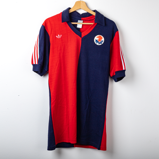 Maglia Genoa a maniche corte con i tradizionali colori rosso-blu. Sul fronte troviamo i loghi verniciati, leggermente sbiaditi, di Adidas e del Genoa. Sul retro, cucito in bianco, c'è il numero 10.