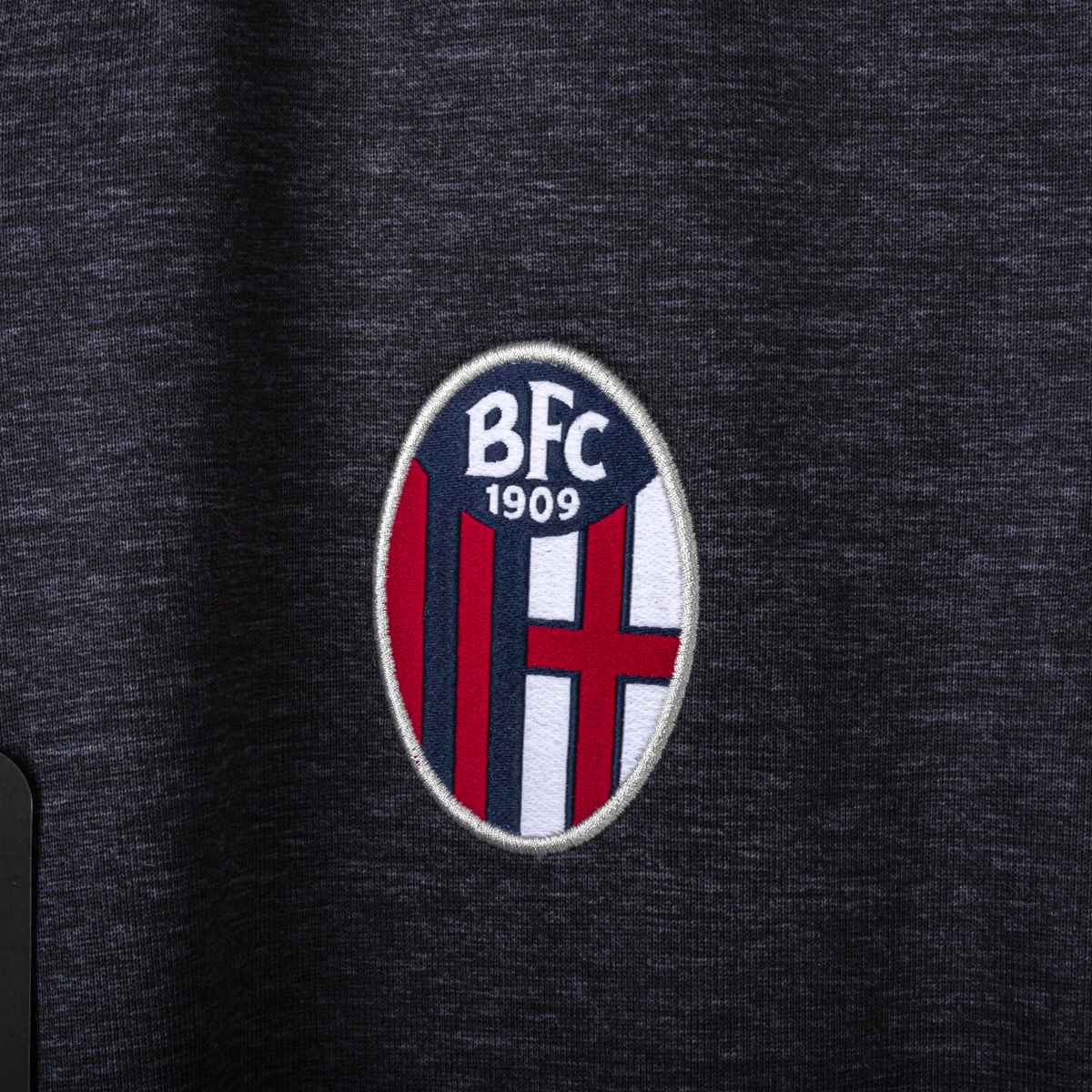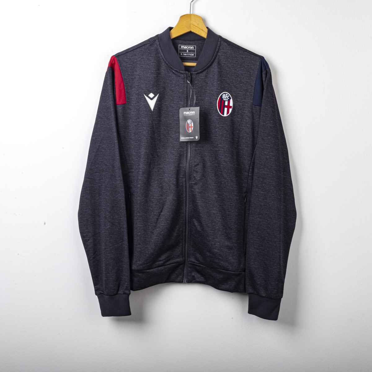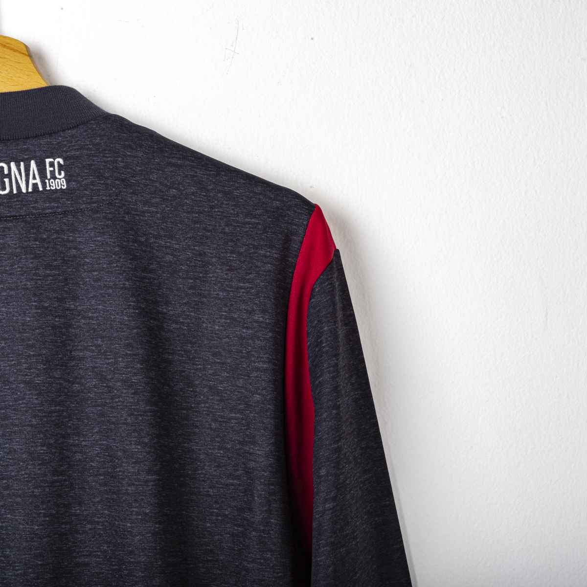 Sponsor Tecnico Macron ricamato. Logo del Bologna ricamato lato cuore. La Giacca presenta il cartellino del produttore. Prodotto nuovo. Sul retro del collo è presente la scritta Bologna Fc 1909 ricamata in bianco.