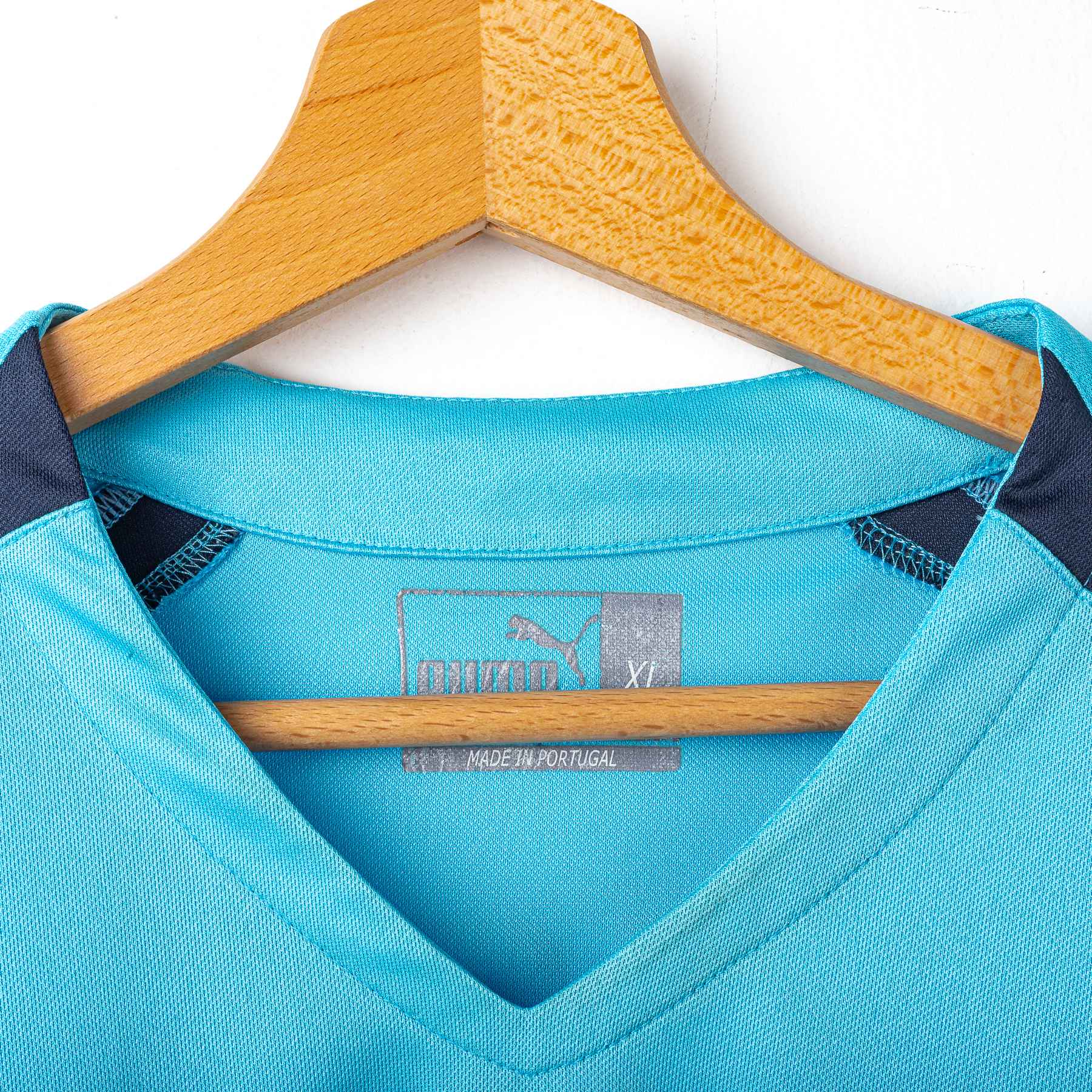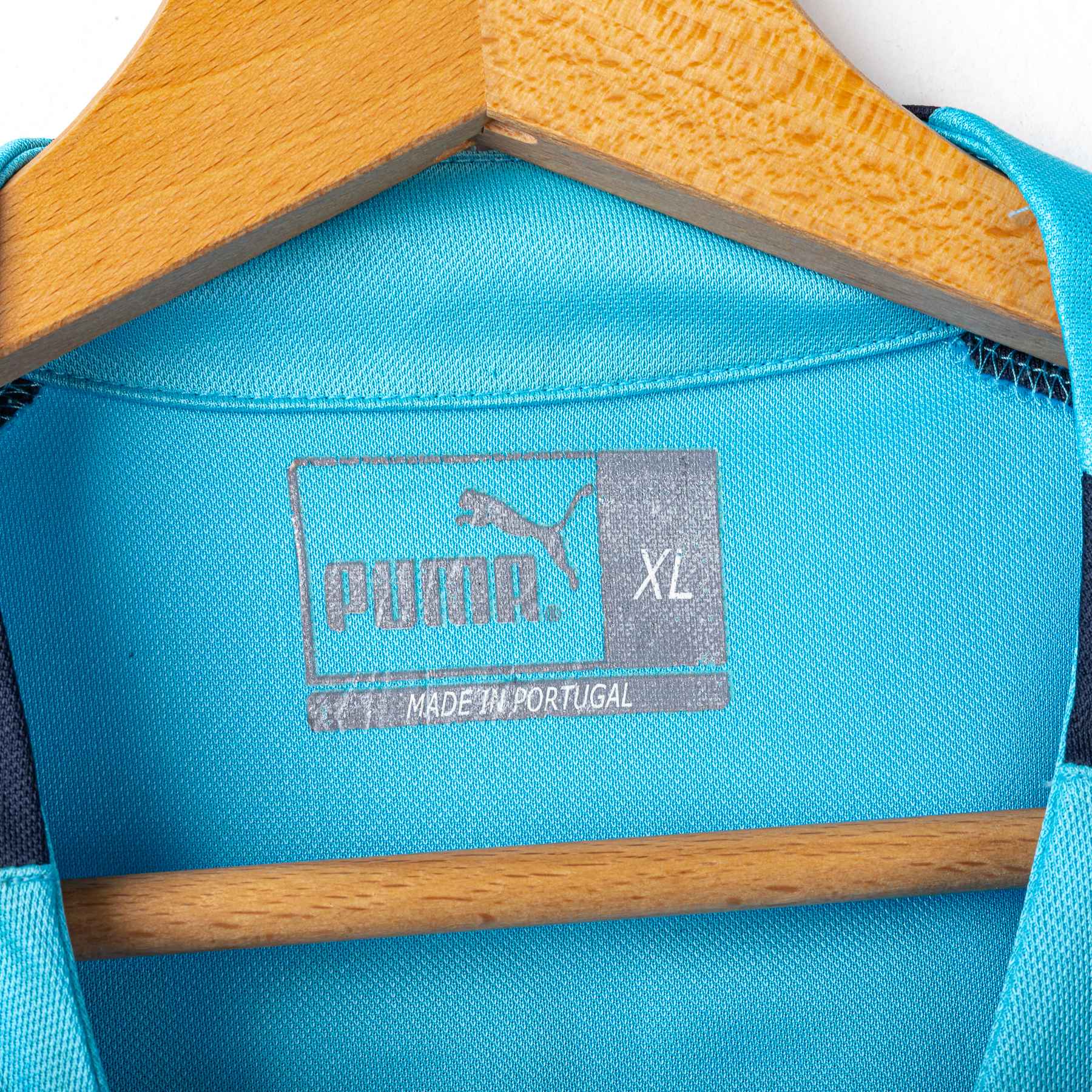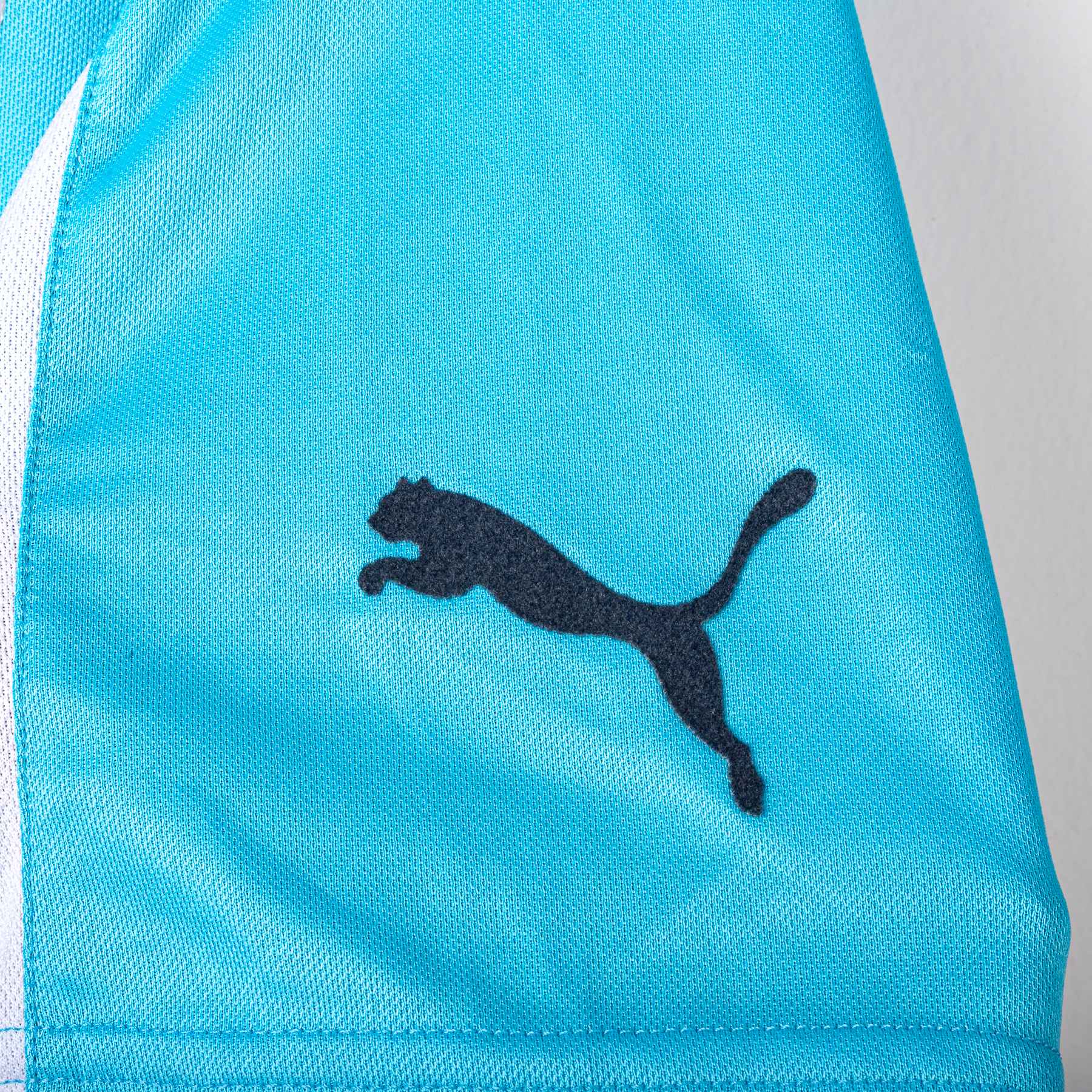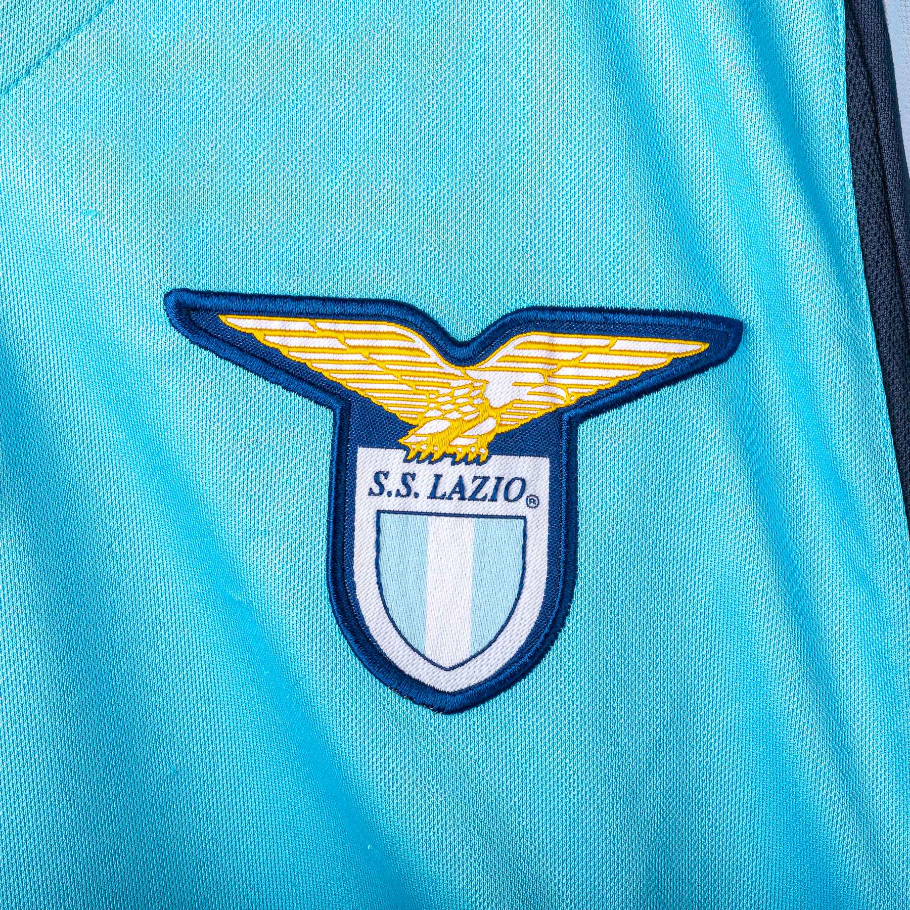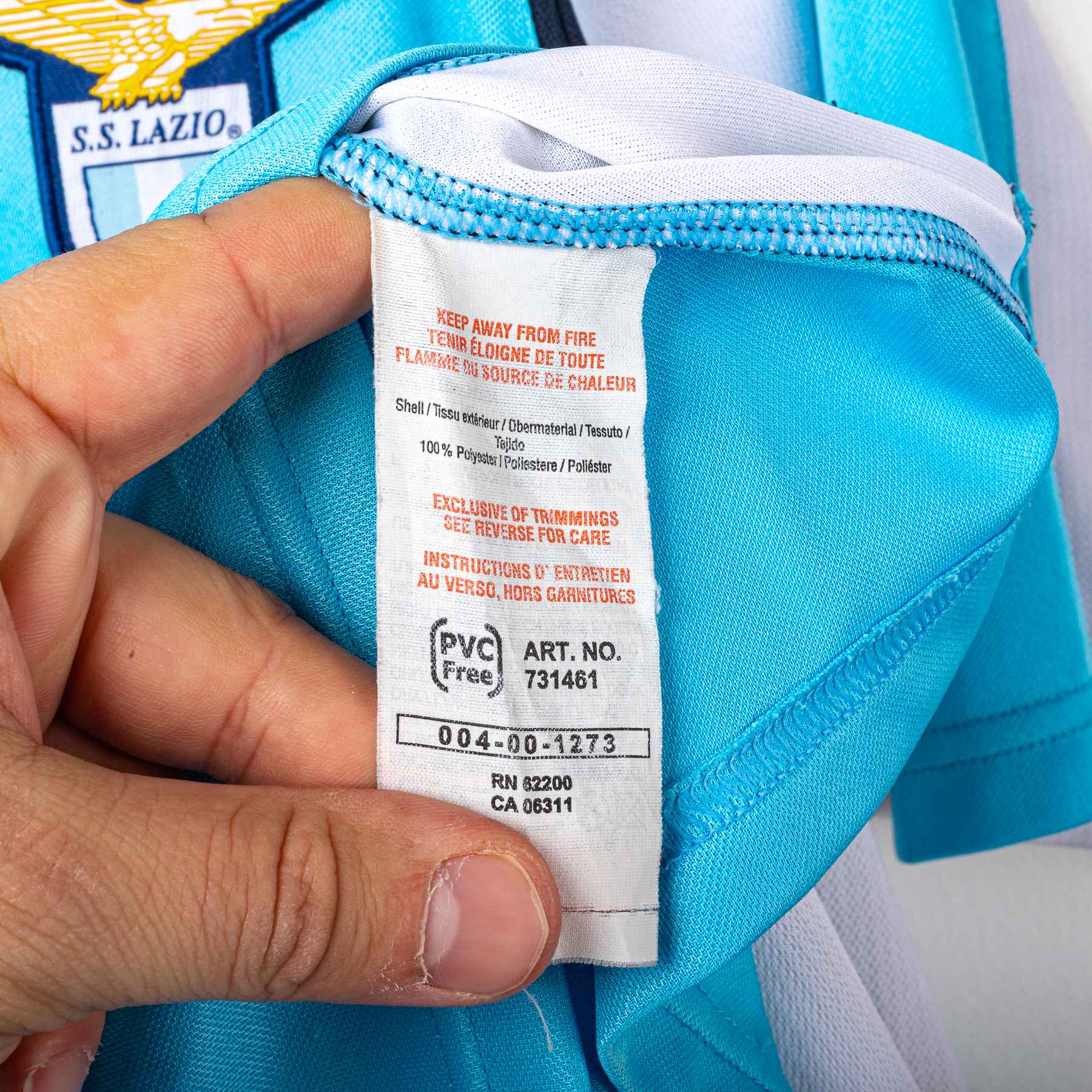 Maglia home della S.S. Lazio stagione 2004/2005, realizzata da Puma. Base celeste con inserti bianchi sui fianchi e dettagli blu scuro a contrasto lungo le maniche e le cuciture, per un look moderno ma fedele ai colori sociali biancocelesti. Sul petto spiccano lo stemma ricamato della S.S. Lazio lato cuore, il logo Puma in flock nero sul lato opposto e la coccarda tricolore ricamata al centro a celebrare la Coppa Italia vinta. Sponsor principale “PARMACOTTO” applicato a stampa gommata giallo/nera in posizione centrale. Sul retro, personalizzazione DI CANIO 9. Etichette interne originali Puma con indicazione 100% polyester, PVC free, made in Portugal, taglia XL.