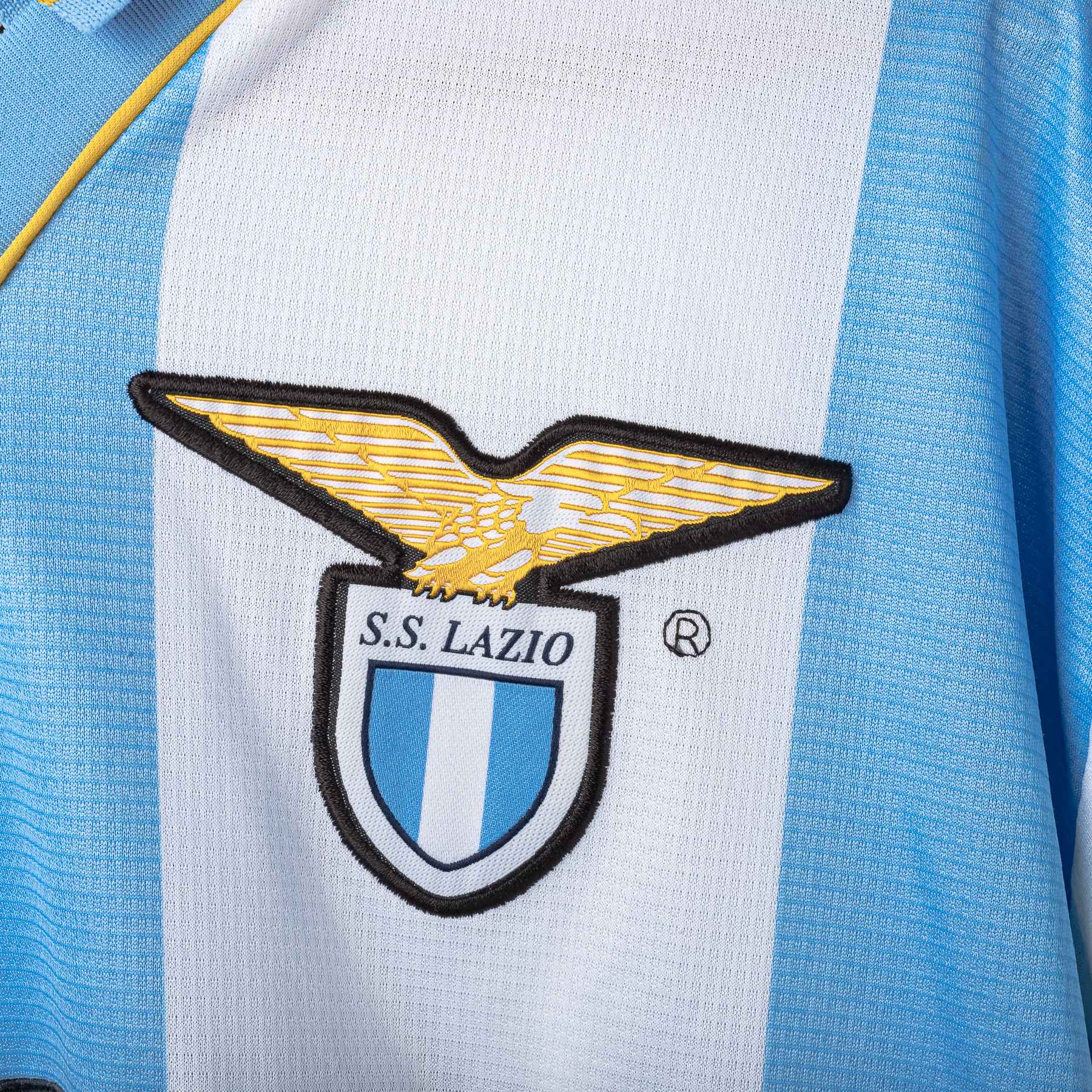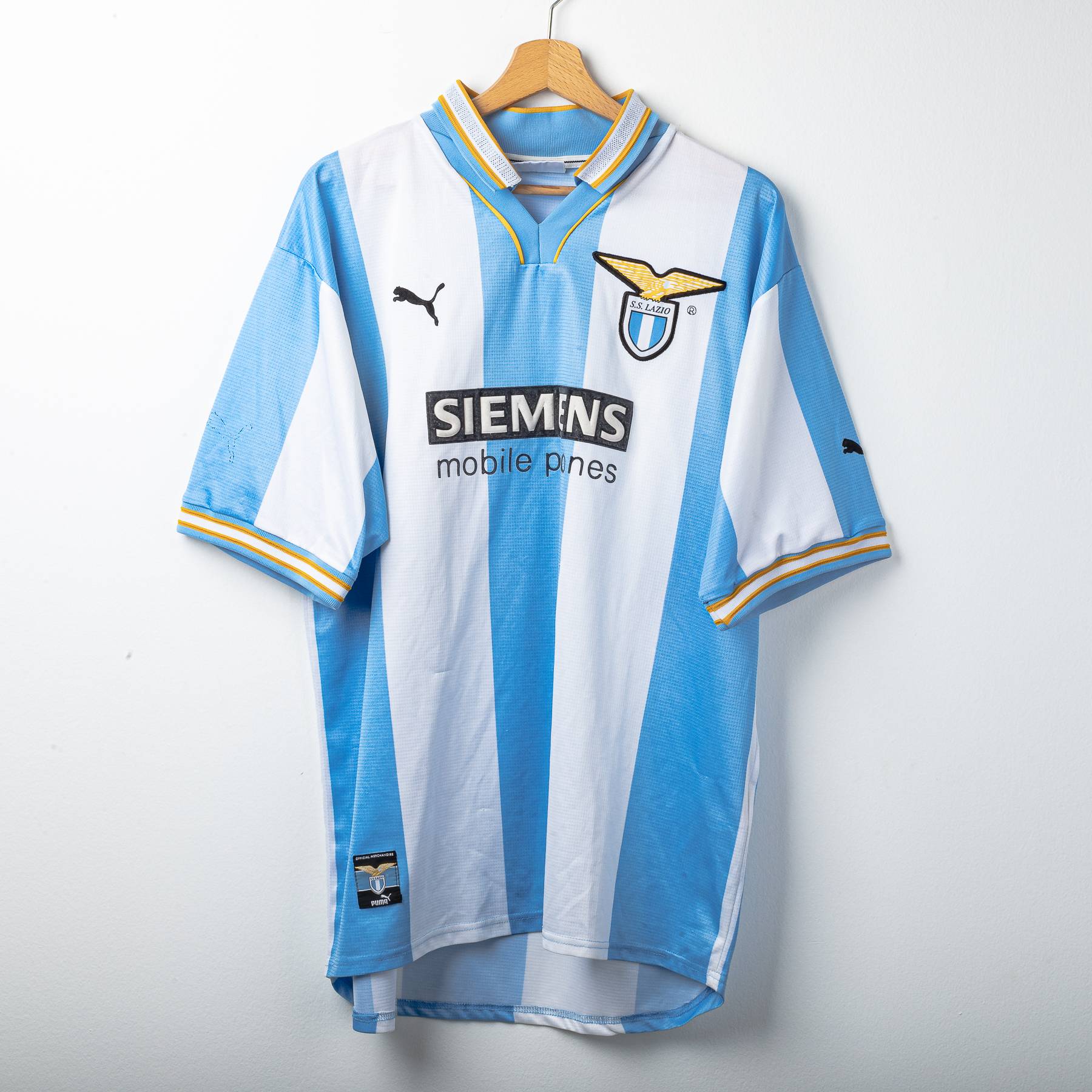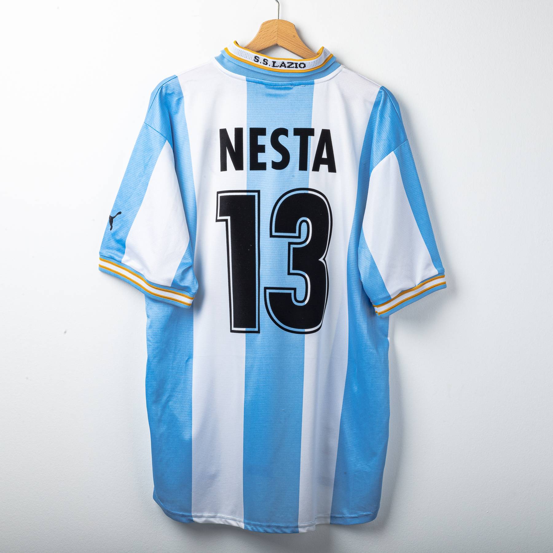 Maglia speciale della Lazio stagione 1999/2000, realizzata da Puma. Design a larghe strisce verticali bianco-celesti ispirato all’Argentina, con dettagli gialli su colletto e bordo maniche. Stemma S.S. Lazio ricamato sul petto sinistro, logo Puma nero ricamato sul petto destro. Sponsor “Siemens mobile phones” applicato in flock nero e bianco sul fronte. Colletto a V sovrapposto in maglia elasticizzata. Sul retro personalizzazione NESTA 13. Patch “Official Licensed Product” Puma cucita sul fondo frontale. Etichetta taglia XL presente all’interno del colletto.
