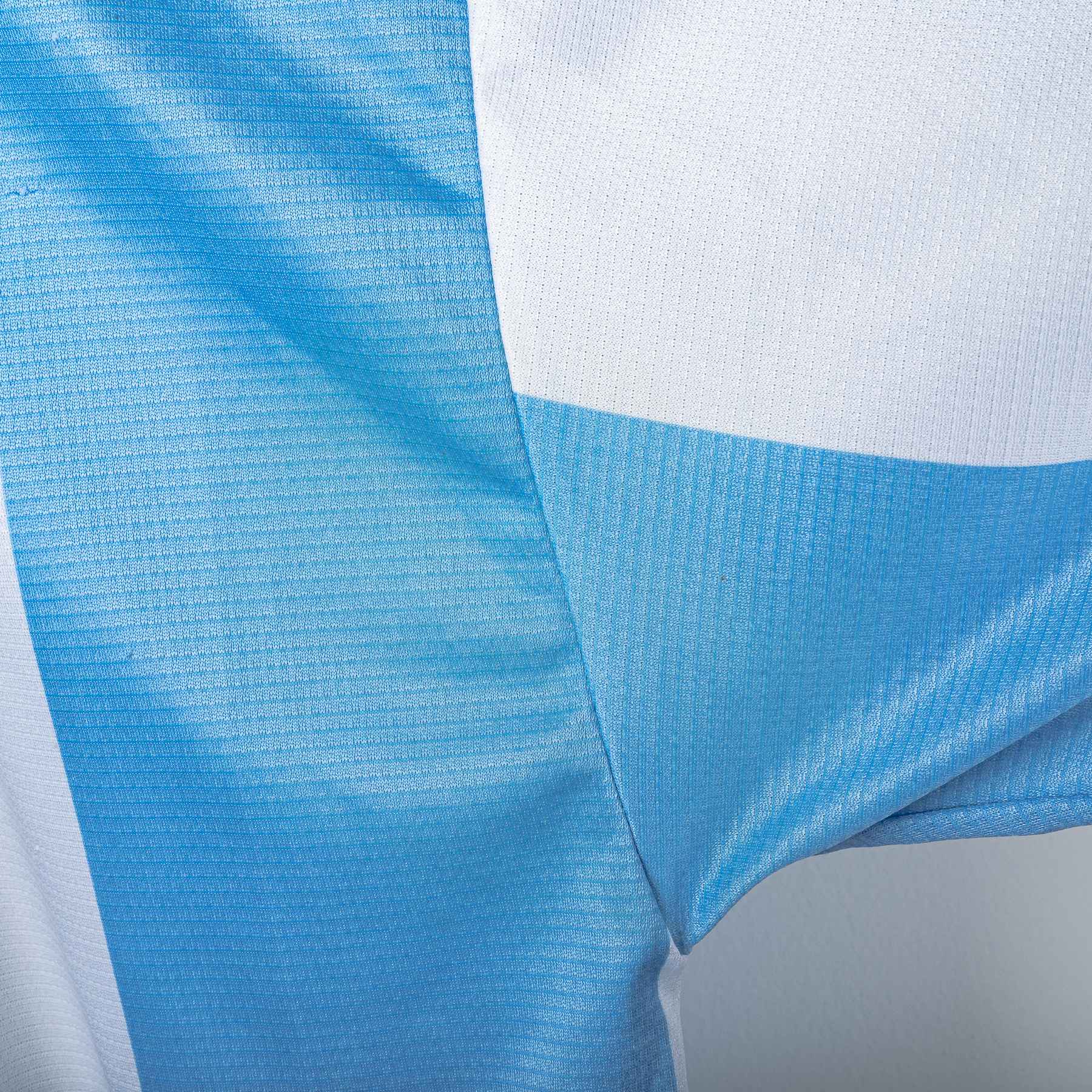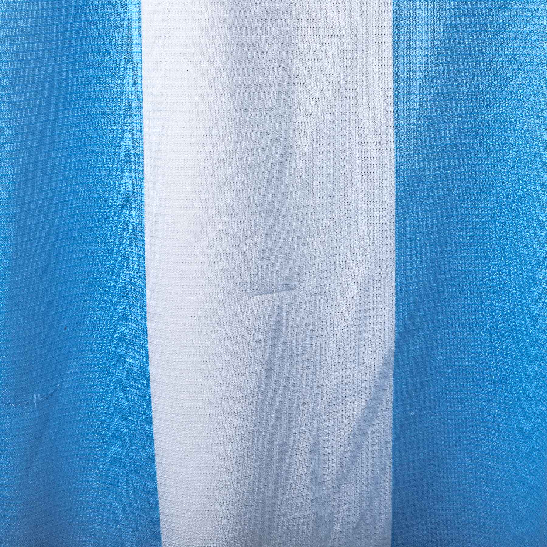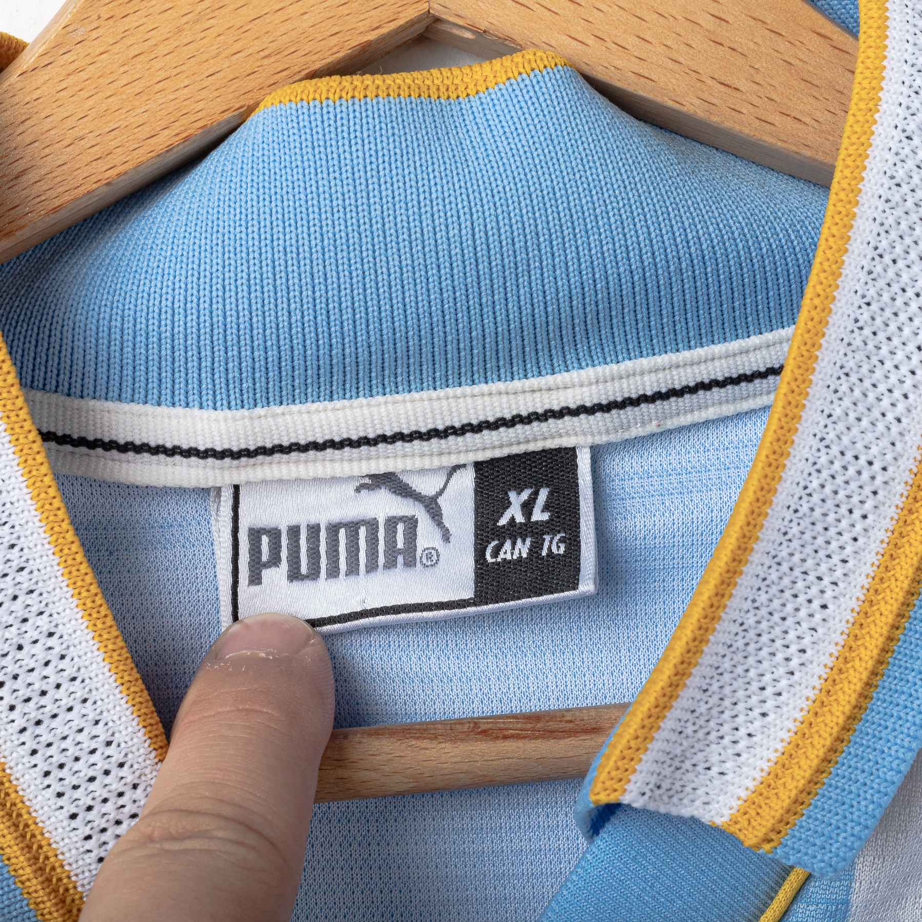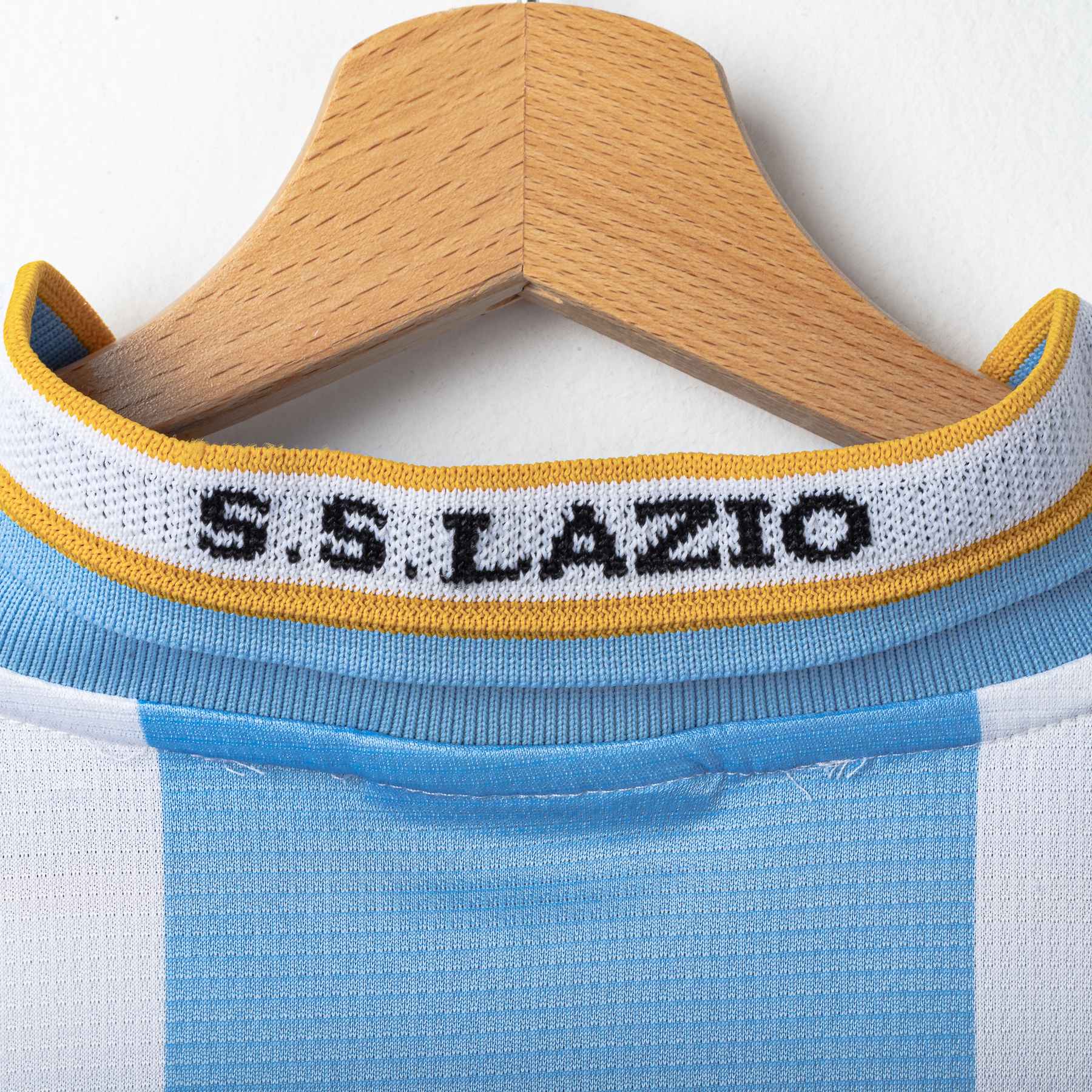 Maglia speciale della Lazio stagione 1999/2000, realizzata da Puma. Design a larghe strisce verticali bianco-celesti ispirato all’Argentina, con dettagli gialli su colletto e bordo maniche. Stemma S.S. Lazio ricamato sul petto sinistro, logo Puma nero ricamato sul petto destro. Sponsor “Siemens mobile phones” applicato in flock nero e bianco sul fronte. Colletto a V sovrapposto in maglia elasticizzata. Sul retro personalizzazione NESTA 13. Patch “Official Licensed Product” Puma cucita sul fondo frontale. Etichetta taglia XL presente all’interno del colletto.