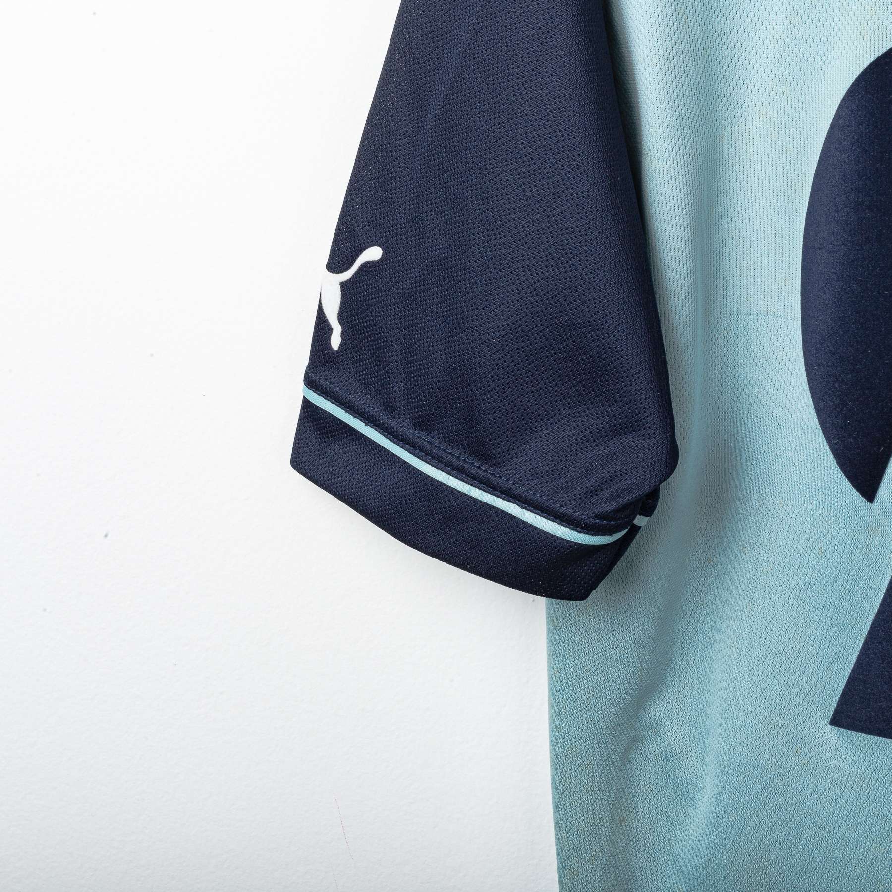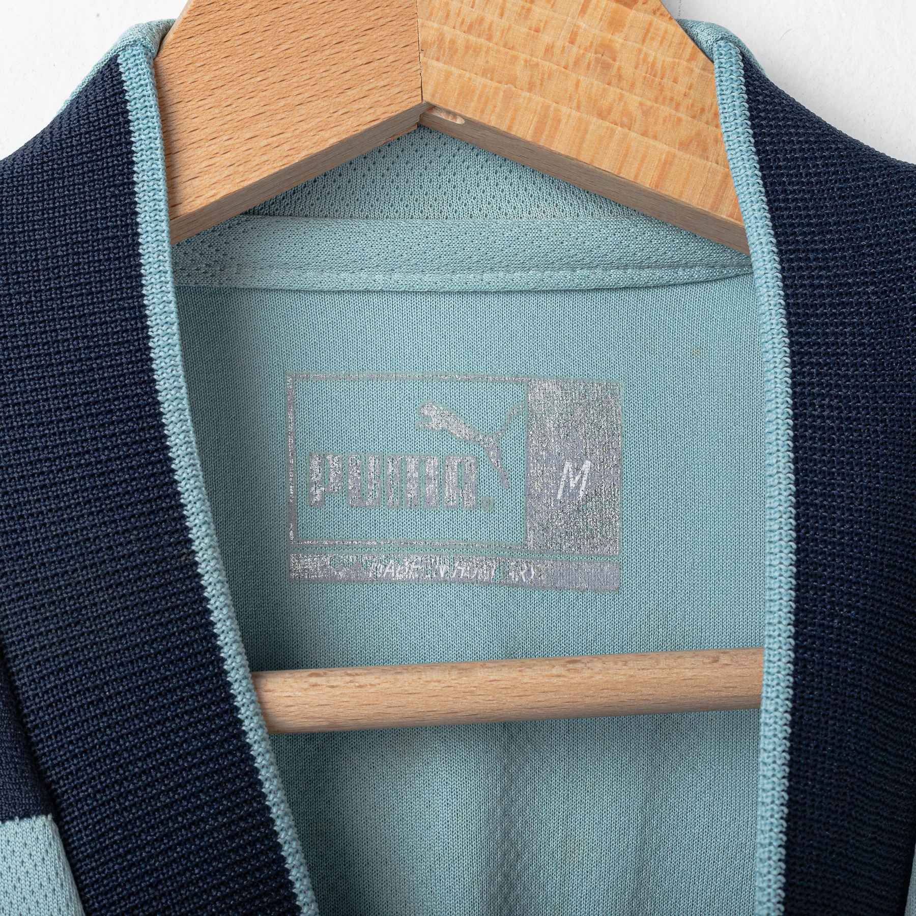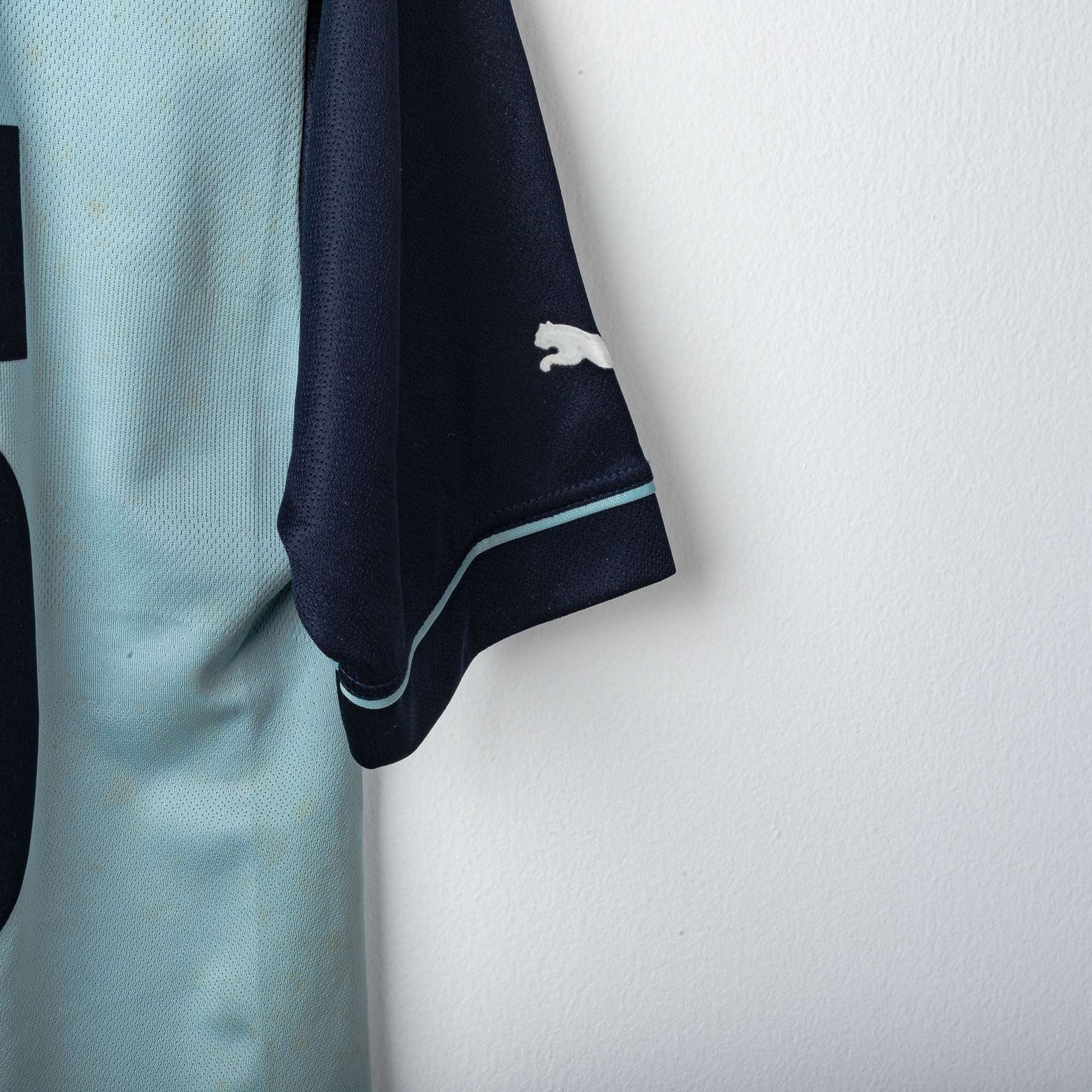 Maglia speciale della Lazio stagione 2002/2003, realizzata da Puma. Colore azzurro pastello con maniche blu navy e dettagli in azzurro chiaro sui bordi, design minimal e moderno, tipico delle prime produzioni Puma per il club biancoceleste. Stemma S.S. Lazio ricamato sul petto sinistro e logo Puma applicato in flock sul petto destro e sulle maniche. Colletto a V bicolore con inserto elasticizzato. Sul retro personalizzazione CHIESA 25 in blu navy, font ufficiale Serie A 2002/03. Etichetta taglia M stampata all’interno del colletto e patch “Official Licensed Product” Puma cucita sul fondo. Maglia originale Puma, versione speciale utilizzata come terza divisa durante la stagione 2002/03, indossata da Enrico Chiesa nel periodo post-Coppa Italia.
