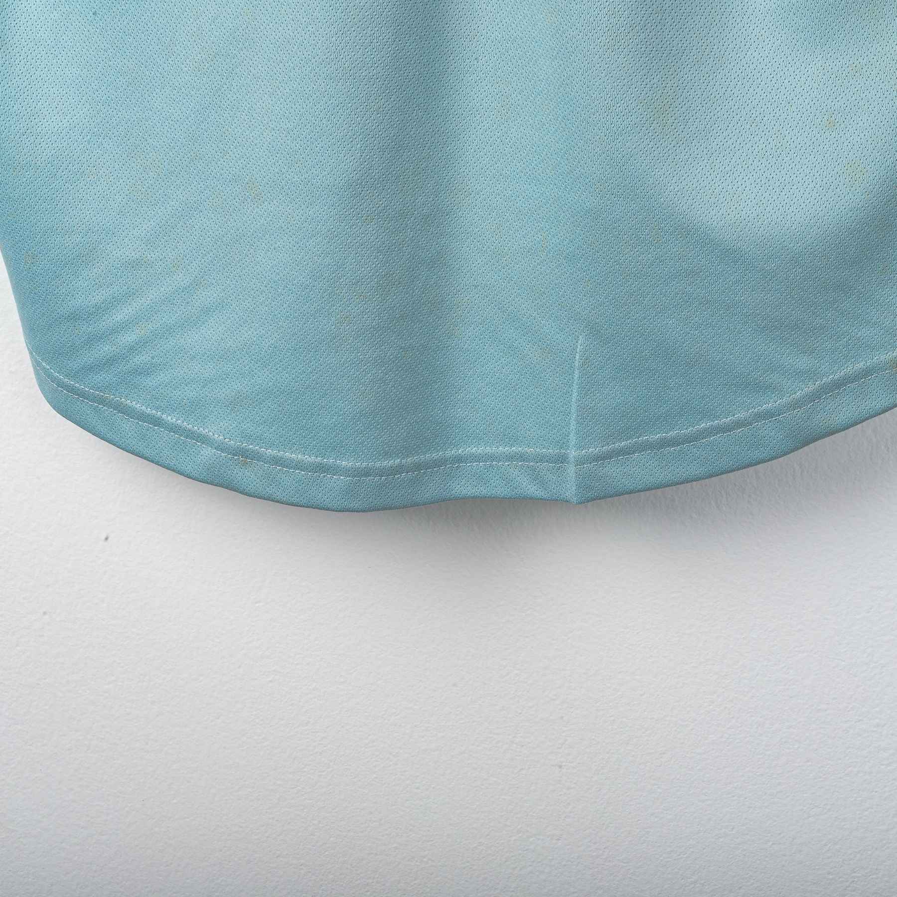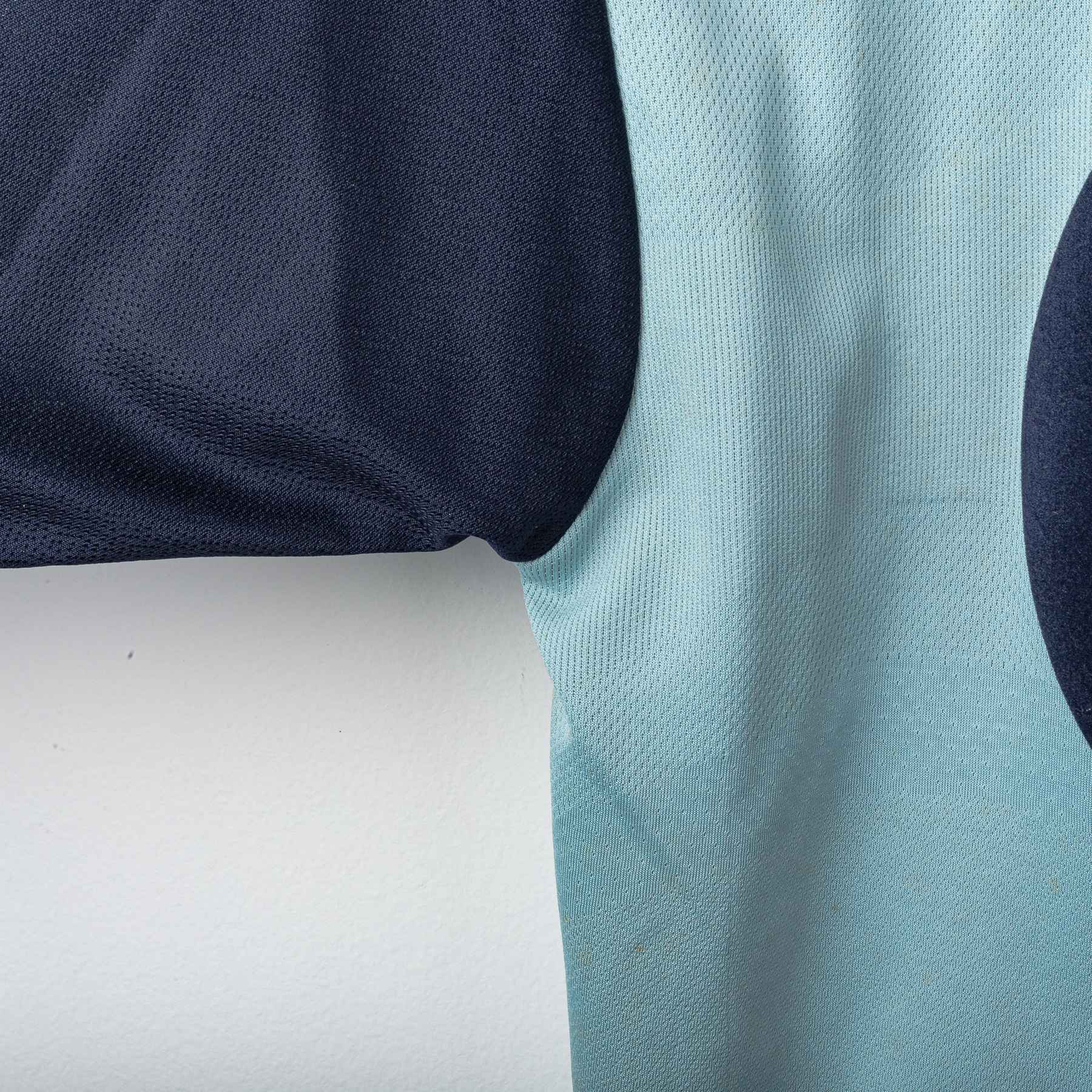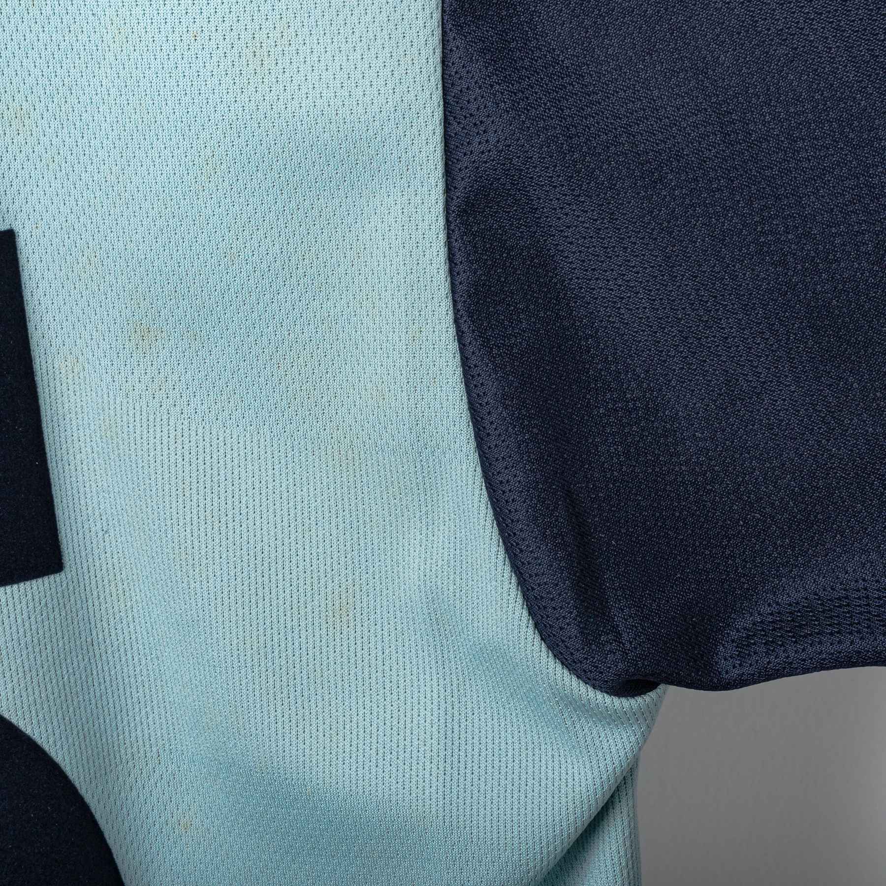 Maglia speciale della Lazio stagione 2002/2003, realizzata da Puma. Colore azzurro pastello con maniche blu navy e dettagli in azzurro chiaro sui bordi, design minimal e moderno, tipico delle prime produzioni Puma per il club biancoceleste. Stemma S.S. Lazio ricamato sul petto sinistro e logo Puma applicato in flock sul petto destro e sulle maniche. Colletto a V bicolore con inserto elasticizzato. Sul retro personalizzazione CHIESA 25 in blu navy, font ufficiale Serie A 2002/03. Etichetta taglia M stampata all’interno del colletto e patch “Official Licensed Product” Puma cucita sul fondo. Maglia originale Puma, versione speciale utilizzata come terza divisa durante la stagione 2002/03, indossata da Enrico Chiesa nel periodo post-Coppa Italia.