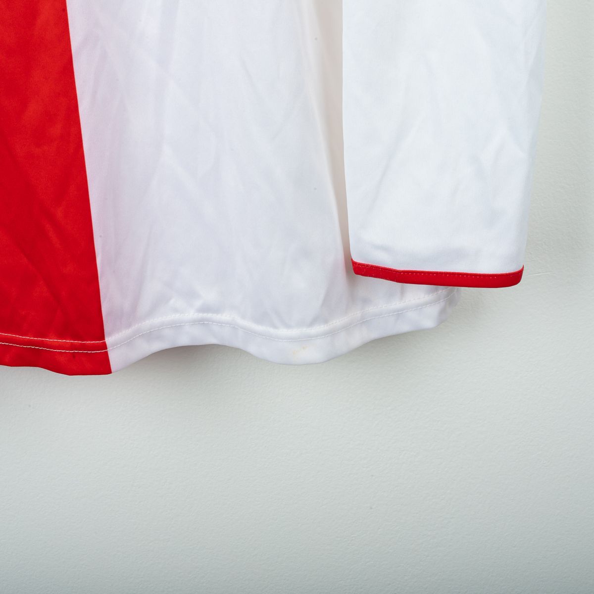 Maglia home del Rimini Calcio stagione 2007/2008, prodotta da Macron. Modello a manica lunga con iconico design biancorosso a riquadri, ispirato alla tradizione del club. Colletto girocollo con profilo rosso e inserti in mesh traspirante sulle spalle. Sul fronte sono applicati lo sponsor Banca di Rimini in stampa e il logo Macron ricamato, mentre lo stemma Rimini Calcio è cucito lato cuore. Patch ufficiale Lega Calcio Serie B TIM cucita sulla manica. Sul retro personalizzazione ufficiale Ricchiuti 10 in stampa. Taglia da etichetta L. Tessuto 100% poliestere.