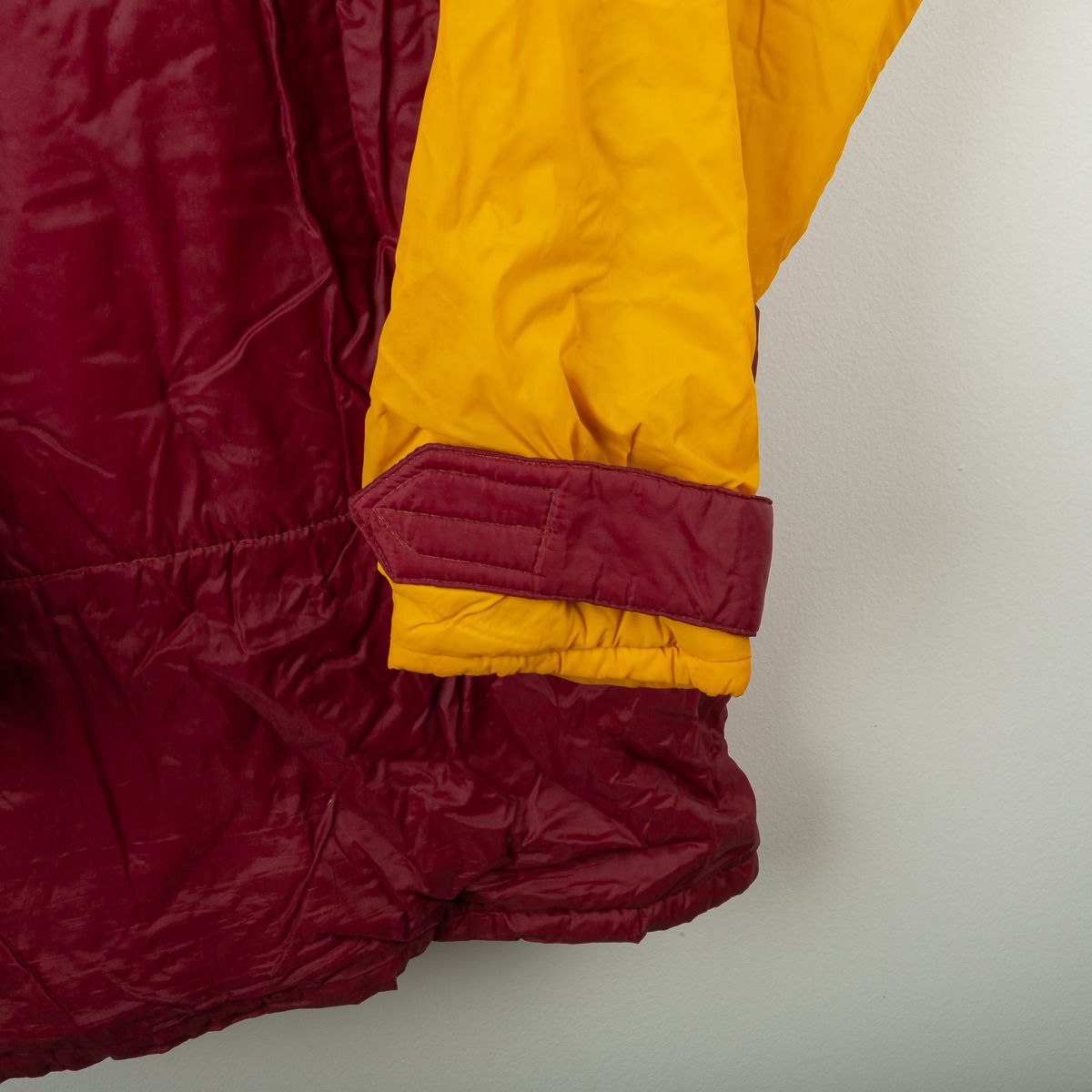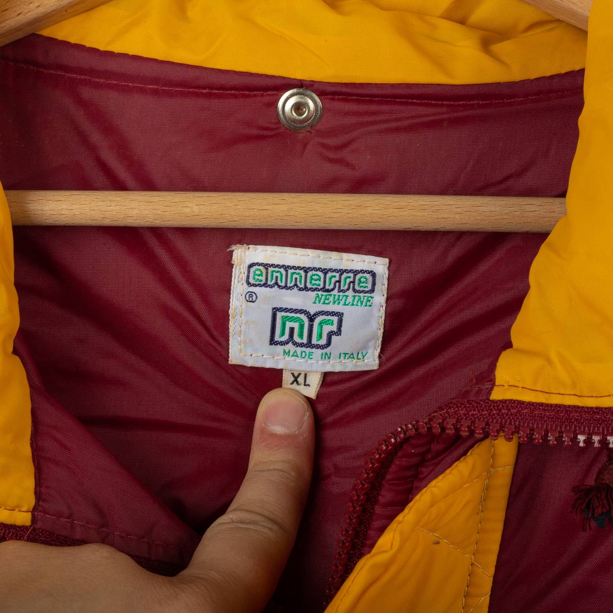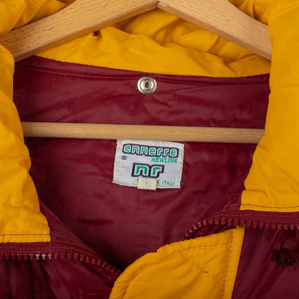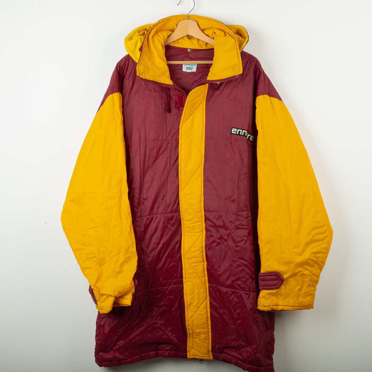 Giaccone lungo invernale della AS Roma stagione 1986/1987 prodotto da Ennerre. Modello panchina imbottito, caratterizzato dai classici colori giallorossi: corpo bordeaux e maniche gialle, con cappuccio integrato. Realizzato in nylon leggero con imbottitura termica, presenta chiusura frontale con zip coperta da patta e velcro, polsini regolabili e tasche laterali. Sul petto logo Ennerre applicato, in pieno stile anni ’80. Capo molto raro e rappresentativo dell’era Ennerre, con vestibilità ampia e taglio extra-lungo pensato per la panchina. Taglia XL, produzione Made in Italy.