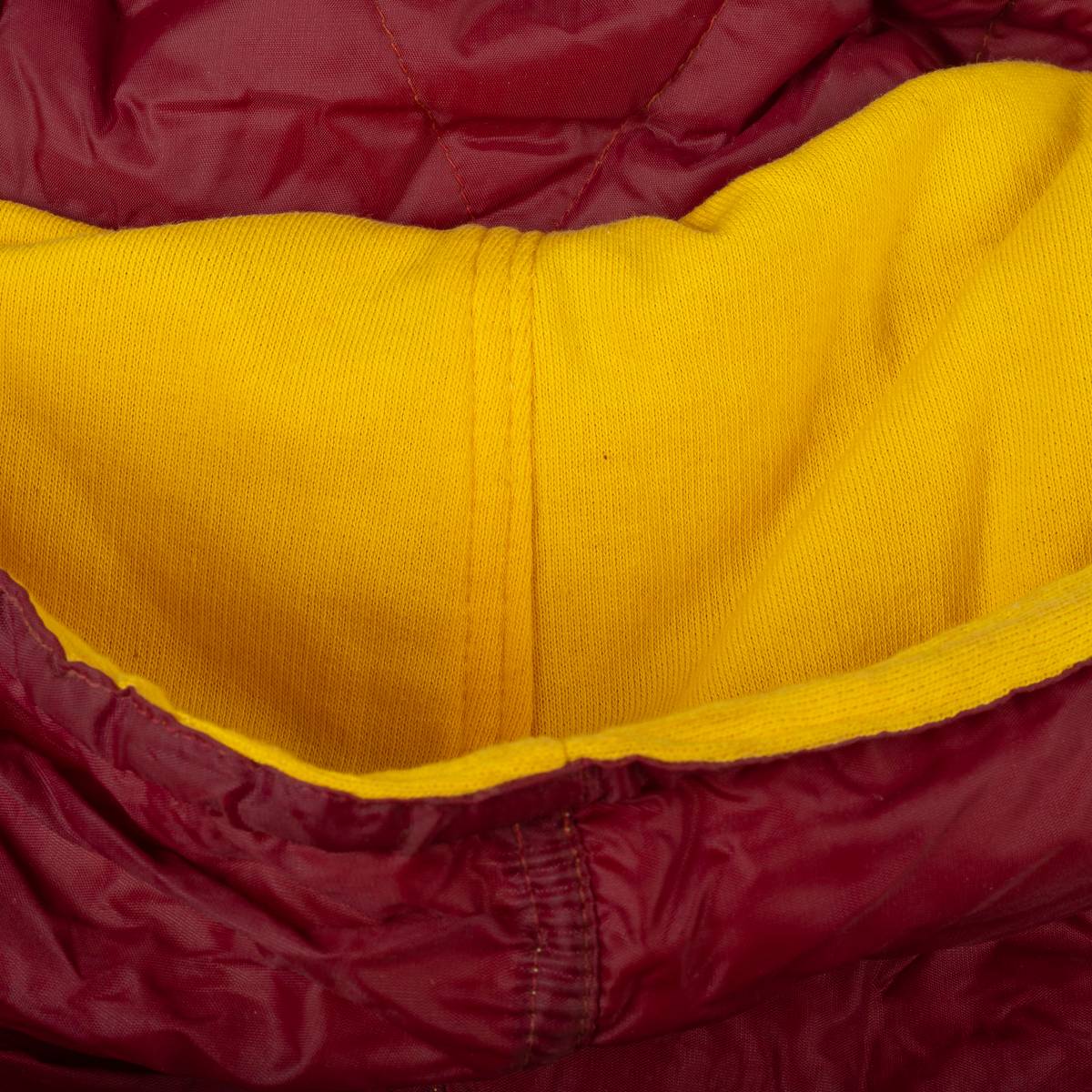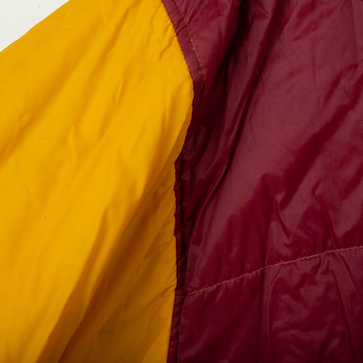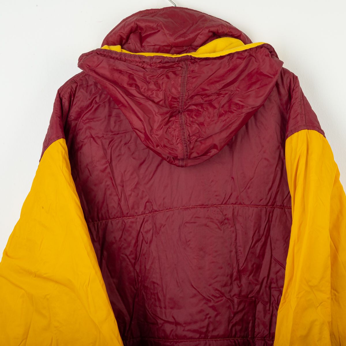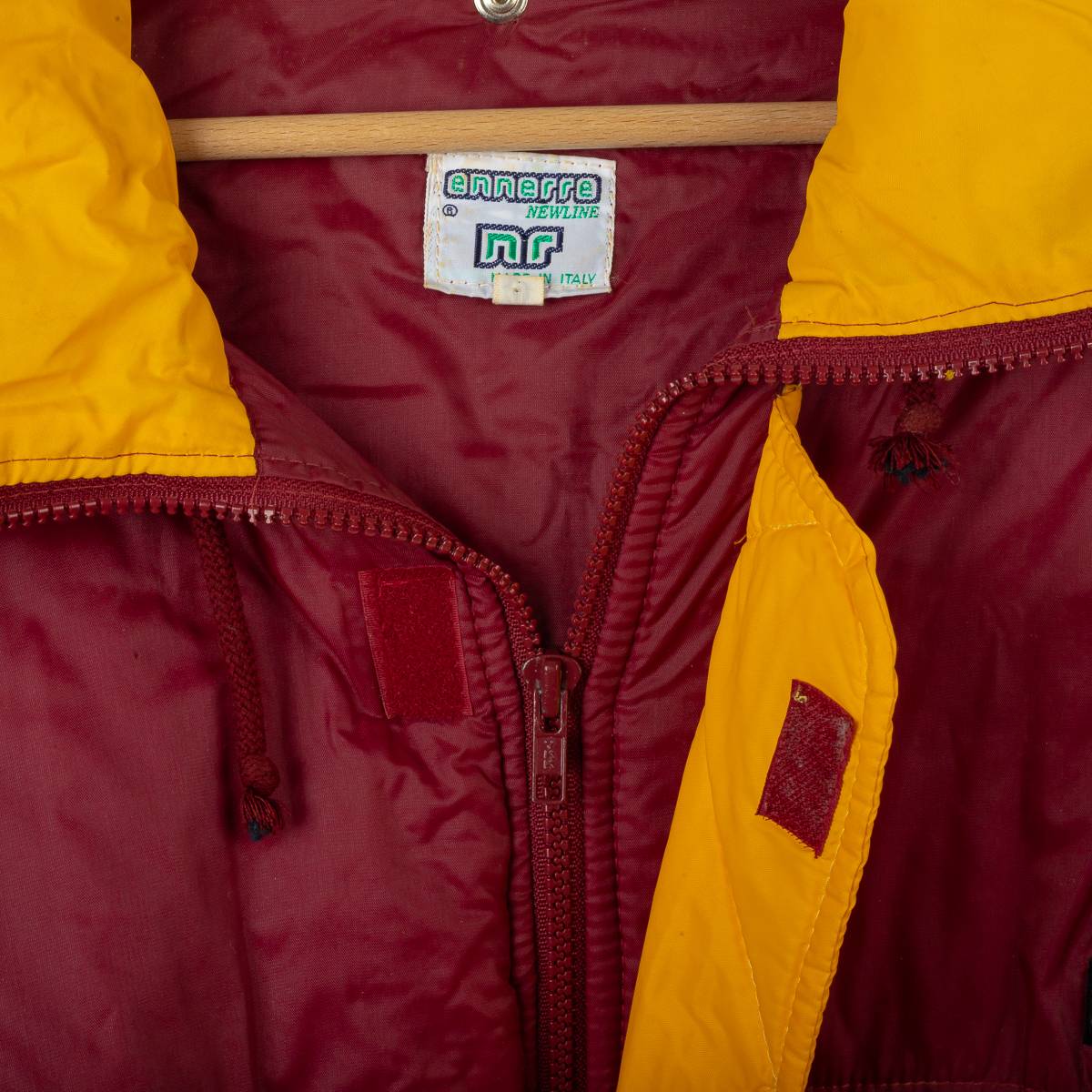 Giaccone lungo invernale della AS Roma stagione 1986/1987 prodotto da Ennerre. Modello panchina imbottito, caratterizzato dai classici colori giallorossi: corpo bordeaux e maniche gialle, con cappuccio integrato. Realizzato in nylon leggero con imbottitura termica, presenta chiusura frontale con zip coperta da patta e velcro, polsini regolabili e tasche laterali. Sul petto logo Ennerre applicato, in pieno stile anni ’80. Capo molto raro e rappresentativo dell’era Ennerre, con vestibilità ampia e taglio extra-lungo pensato per la panchina. Taglia XL, produzione Made in Italy.