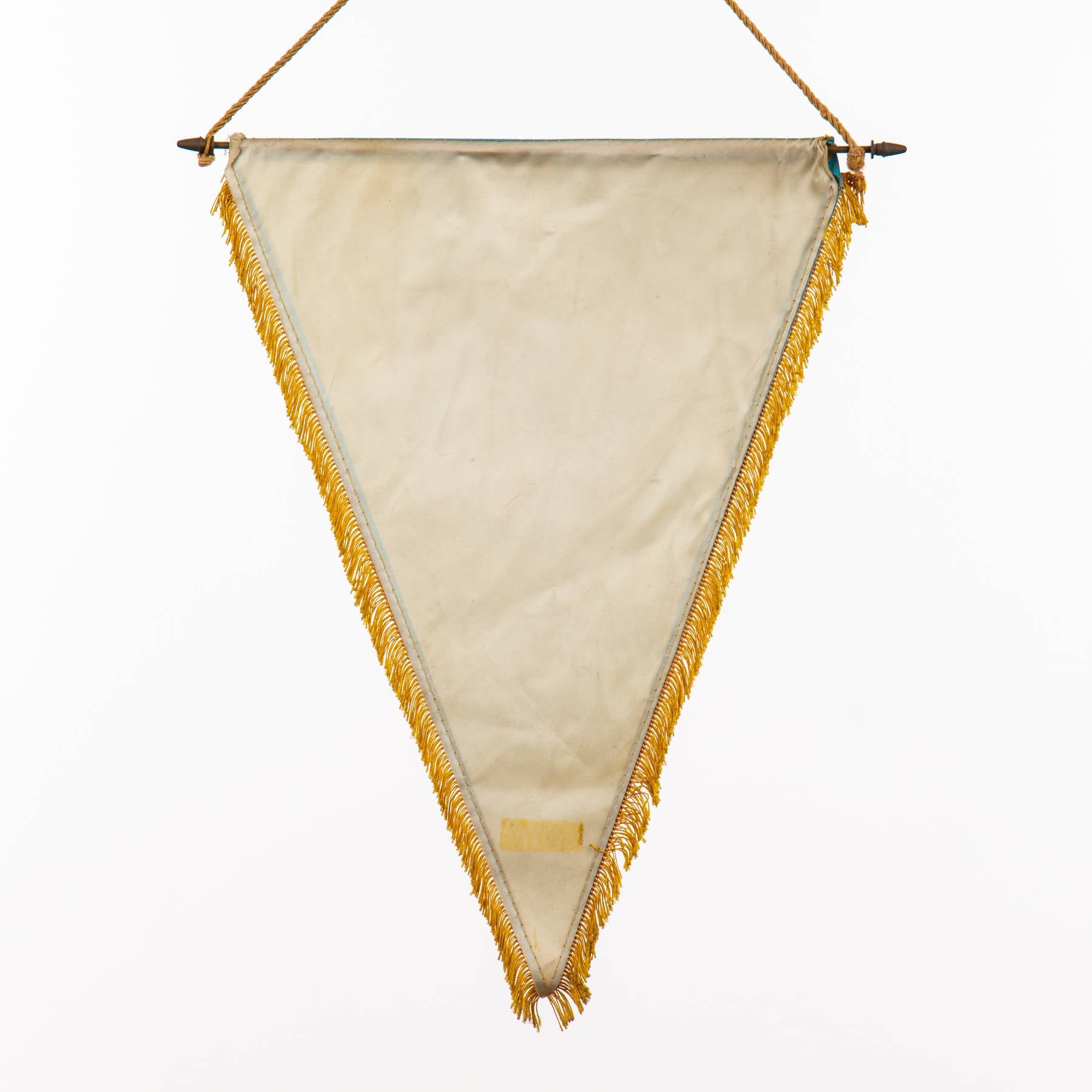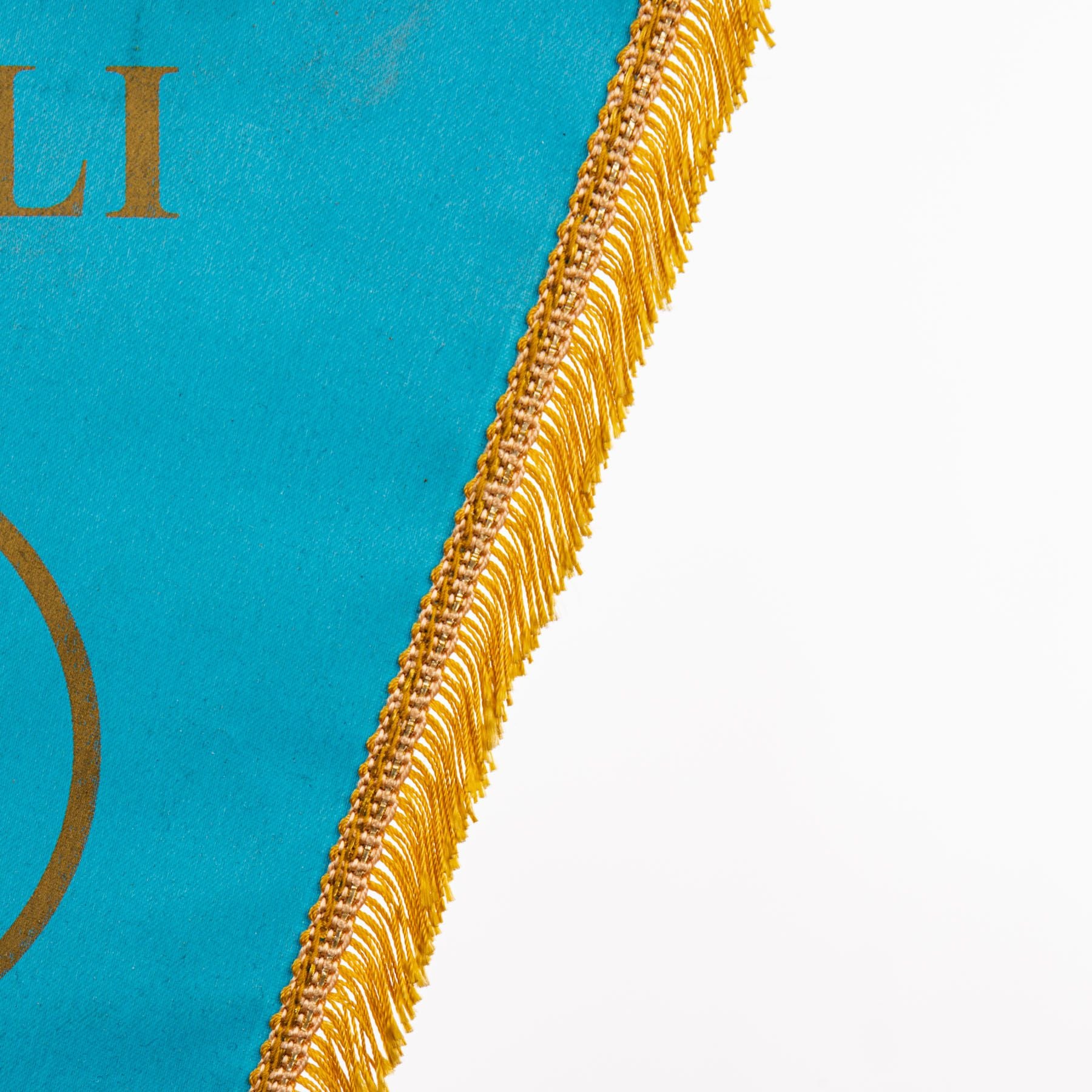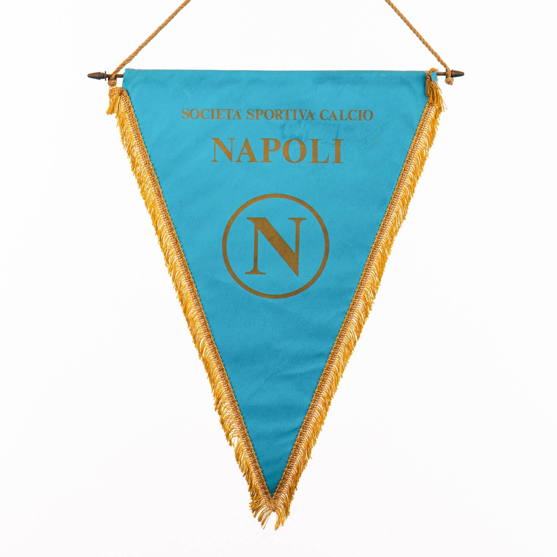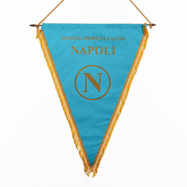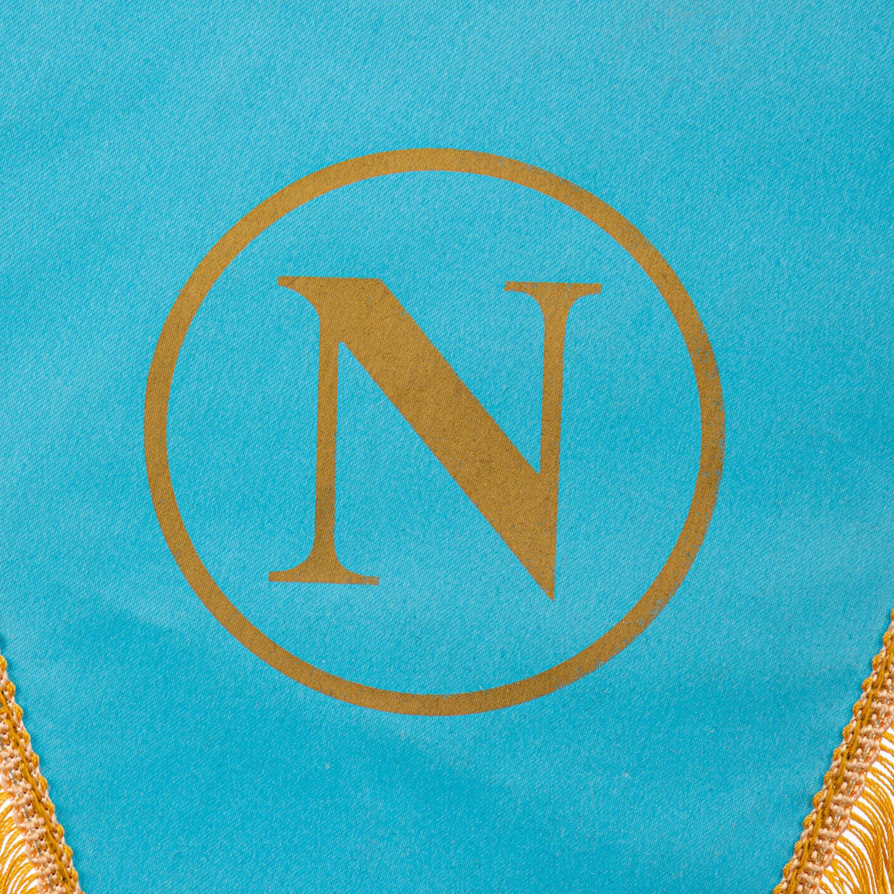 Il gagliardetto presenta la classica forma triangolare con frange dorate lungo il bordo e asta superiore con cordoncino per l’esposizione. Il fronte è nel tradizionale colore azzurro del Napoli e riporta la scritta SOCIETÀ SPORTIVA CALCIO NAPOLI in caratteri dorati. Al centro è presente lo storico stemma circolare con la lettera N, simbolo identitario del club partenopeo.