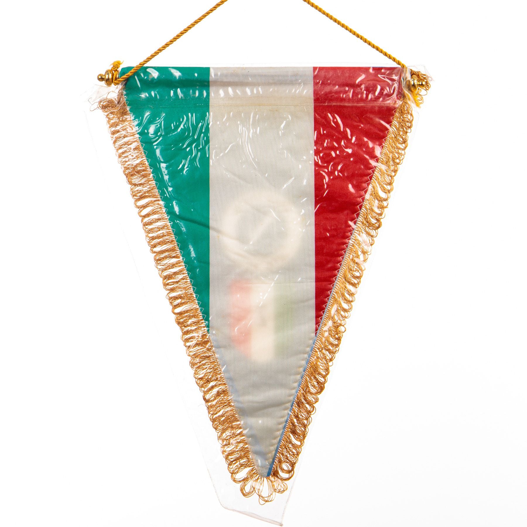 Il gagliardetto presenta la classica forma triangolare con frange dorate lungo il bordo e cordoncino superiore per l’esposizione. Il fondo è nel tradizionale colore azzurro della squadra con la scritta NAPOLI nella parte superiore.