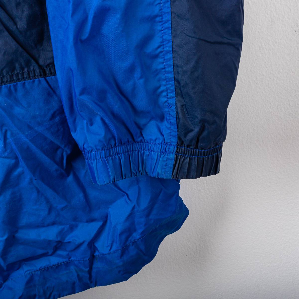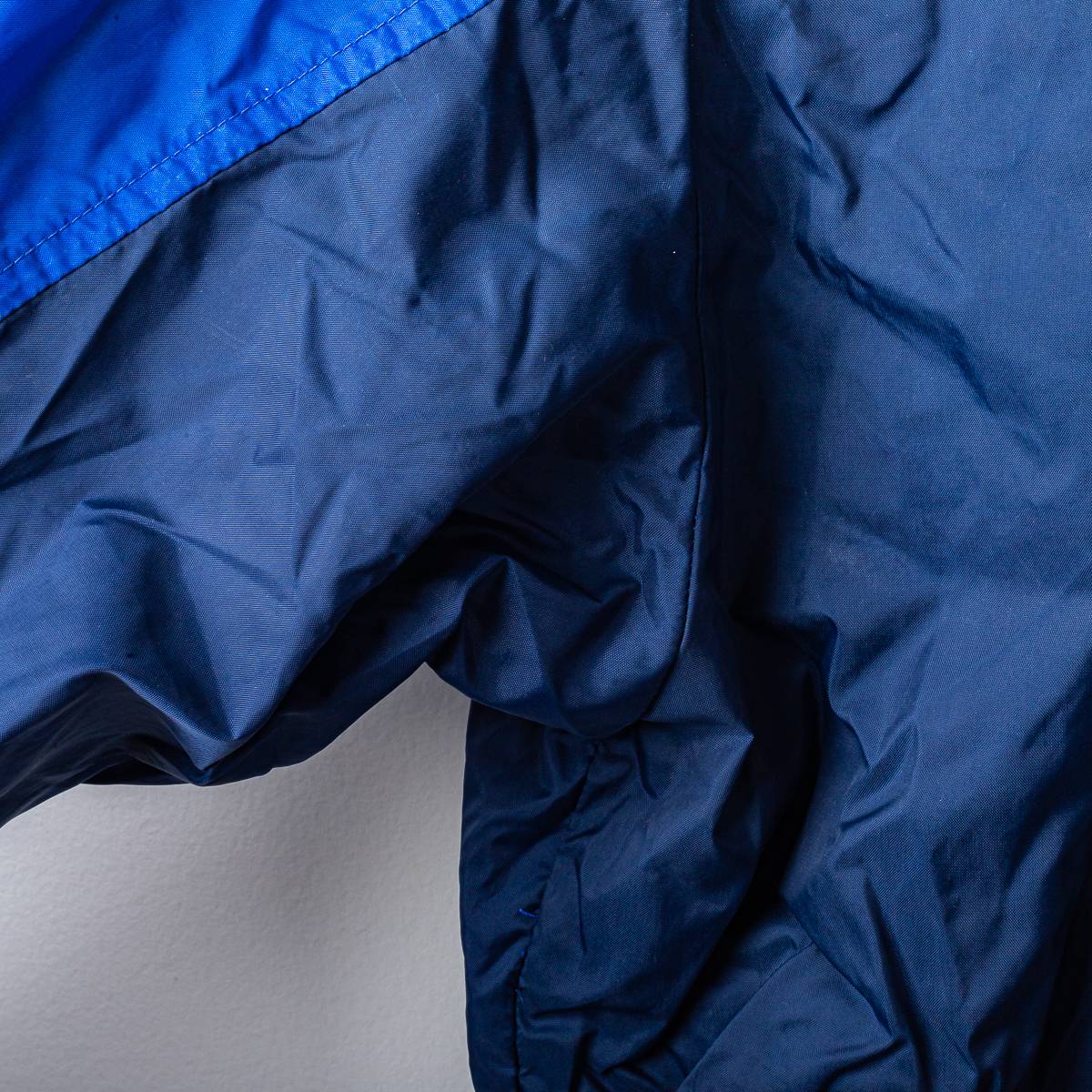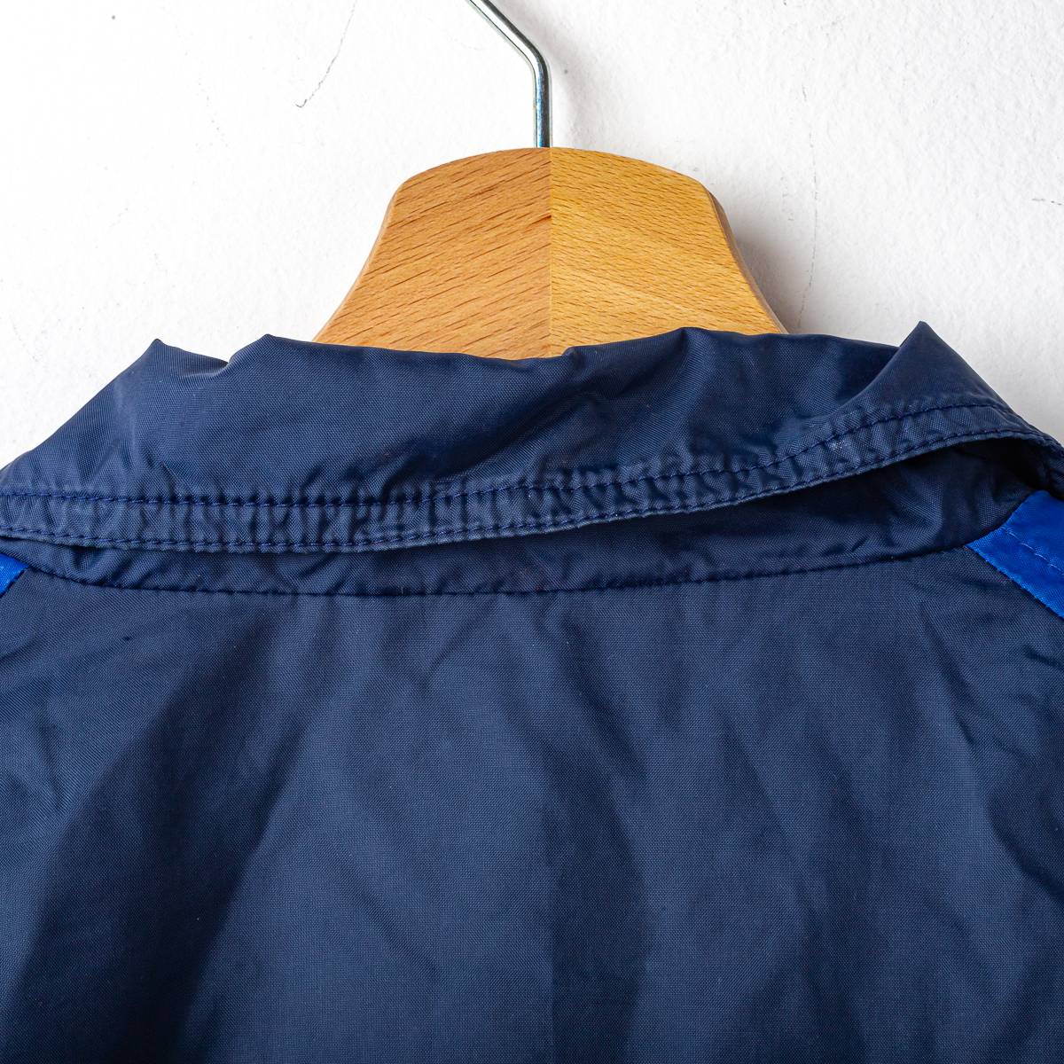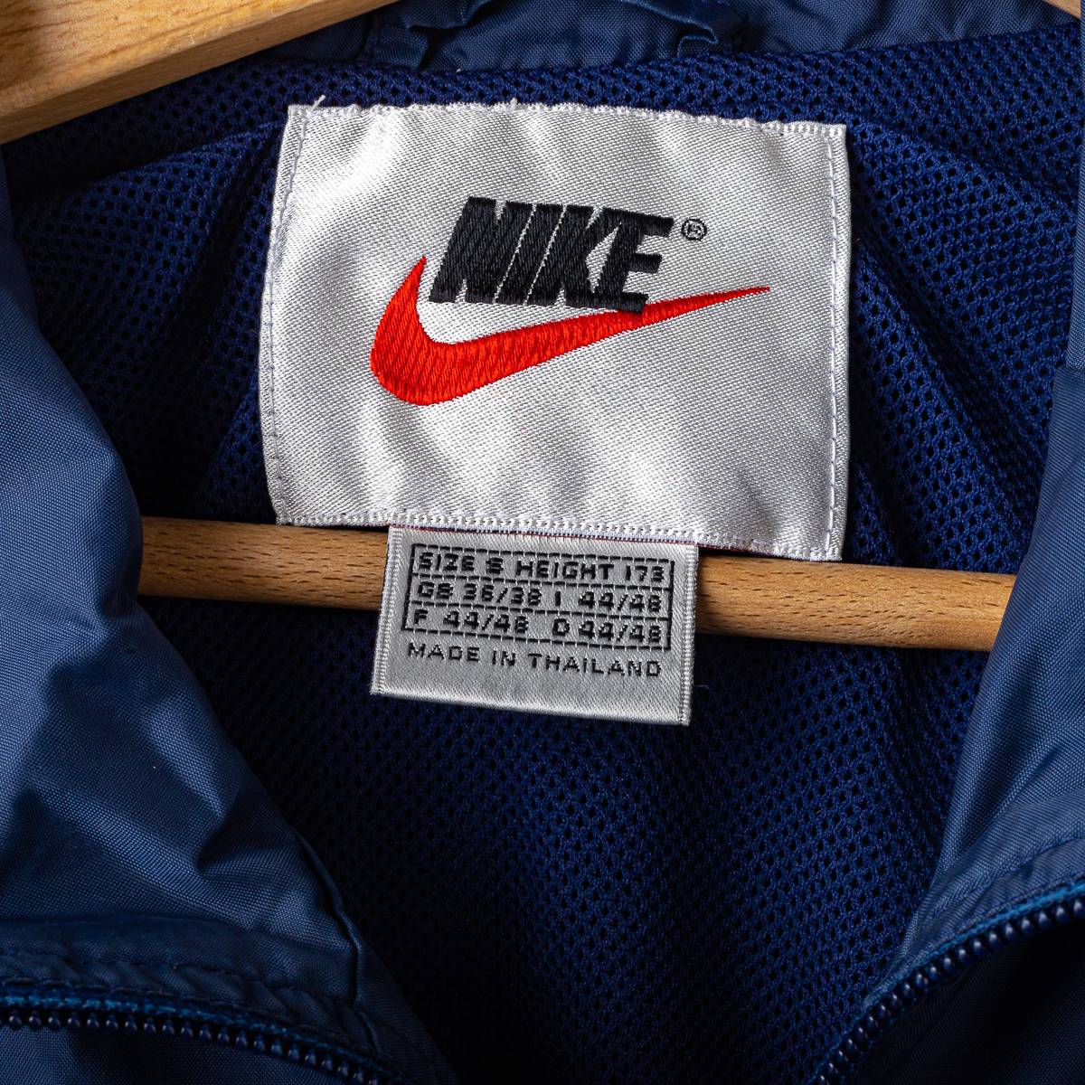 Giacca ufficiale della S.S.C. Napoli stagione 1998/1999, prodotta da Nike. Modello in nylon di colore blu navy con inserti azzurro Napoli lungo le maniche e sui pannelli laterali. Chiusura frontale full zip, collo alto e fondo regolabile con cordino. Sul fronte sono applicati lo swoosh Nike ricamato lato destro e lo stemma circolare S.S.C. Napoli ricamato lato cuore. Logo Nike stampato sulla manica. Interno foderato in mesh traspirante. Tessuto esterno 100% nylon con fodera interna in poliestere. Produzione Made in Thailand. Taglia da etichetta L.