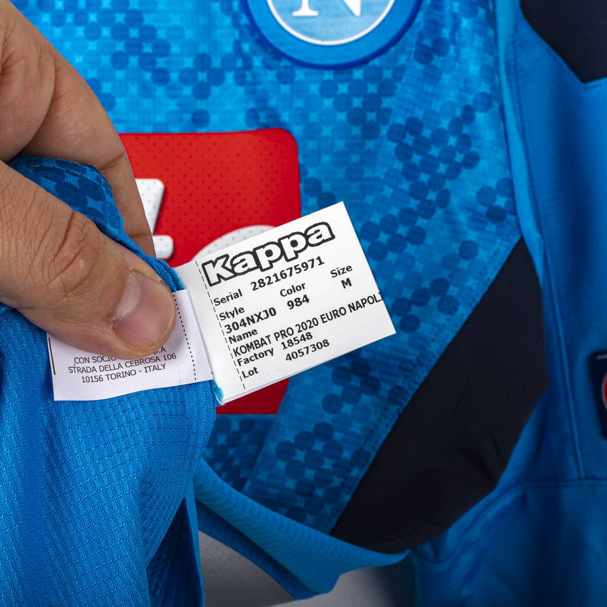 Maglia home ufficiale SSC Napoli stagione 2019/2020, versione manica lunga, prodotta da Kappa e utilizzata nelle competizioni UEFA. Logo Kappa applicato su petto e spalle. Logo SSC Napoli applicato lato cuore. Sponsor commerciale “Lete” stampato centralmente. Patch UEFA Champions League su manica e patch “Respect” su manica opposta. Sul retro presenti nome “INSIGNE” e numero 24 applicati in stampa argentata con logo SSC Napoli alla base della numerazione.