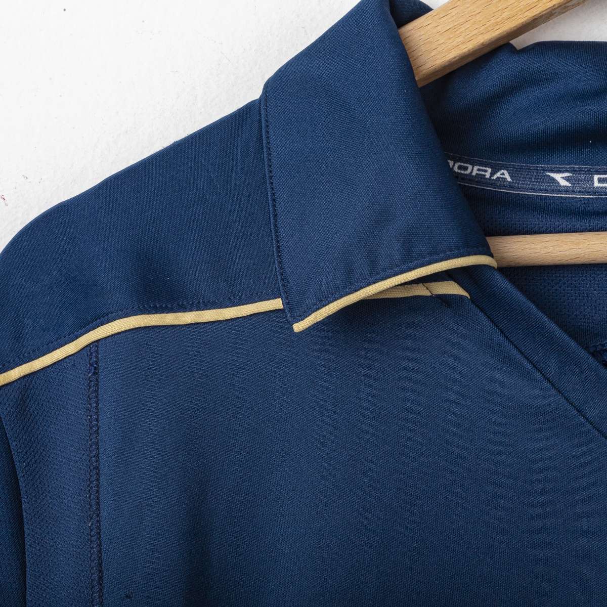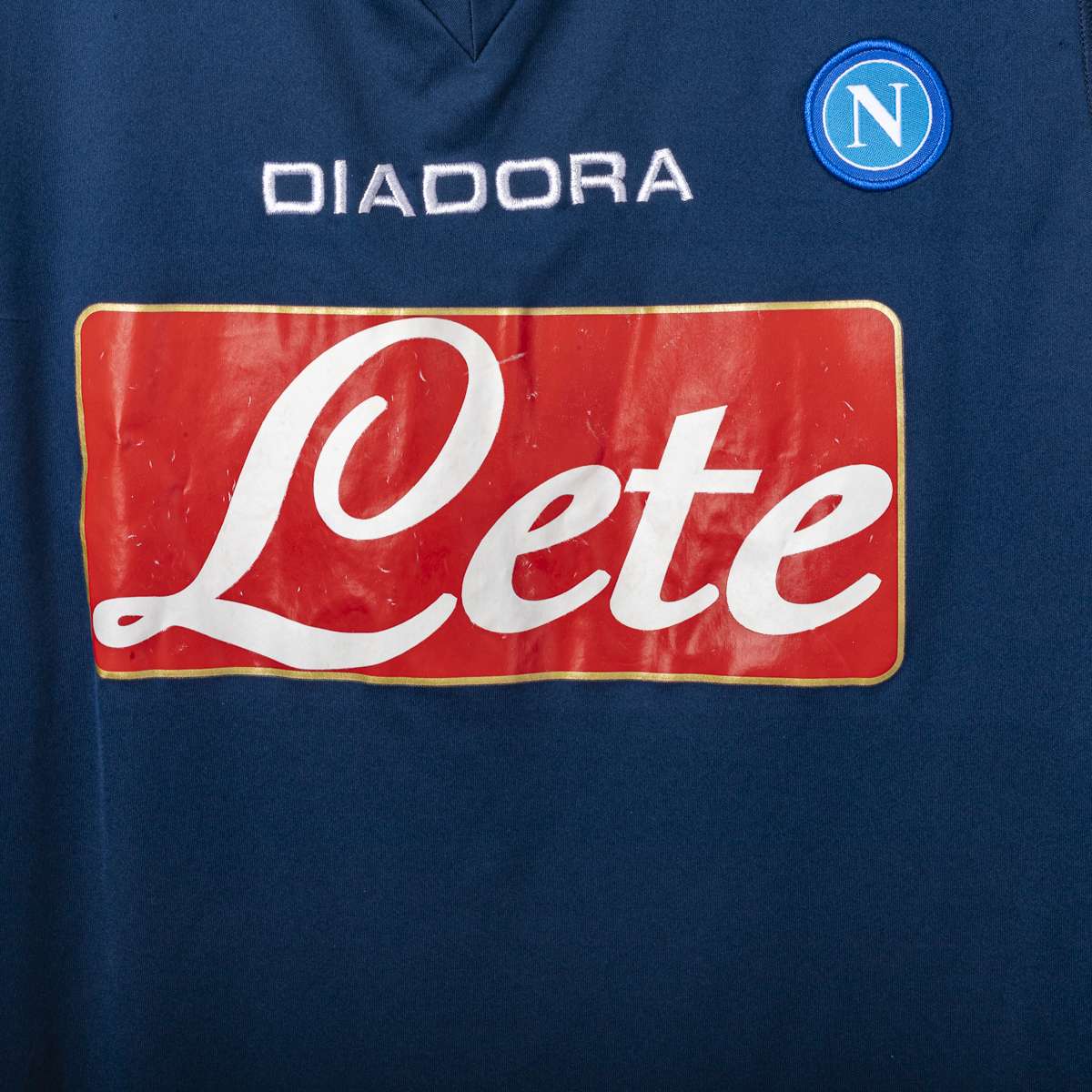 Maglia third ufficiale SSC Napoli stagione 2008/2009, prodotta da Diadora. Design blu navy con profili oro. Logo Diadora ricamato sul petto. Logo SSC Napoli ricamato lato cuore. Sponsor commerciale Lete. Sul retro presenti nome “Lavezzi” e numero 7 applicati in stampa colore oro. Taglia L. Tessuto 100% Poliestere.