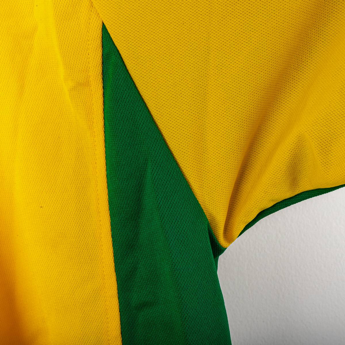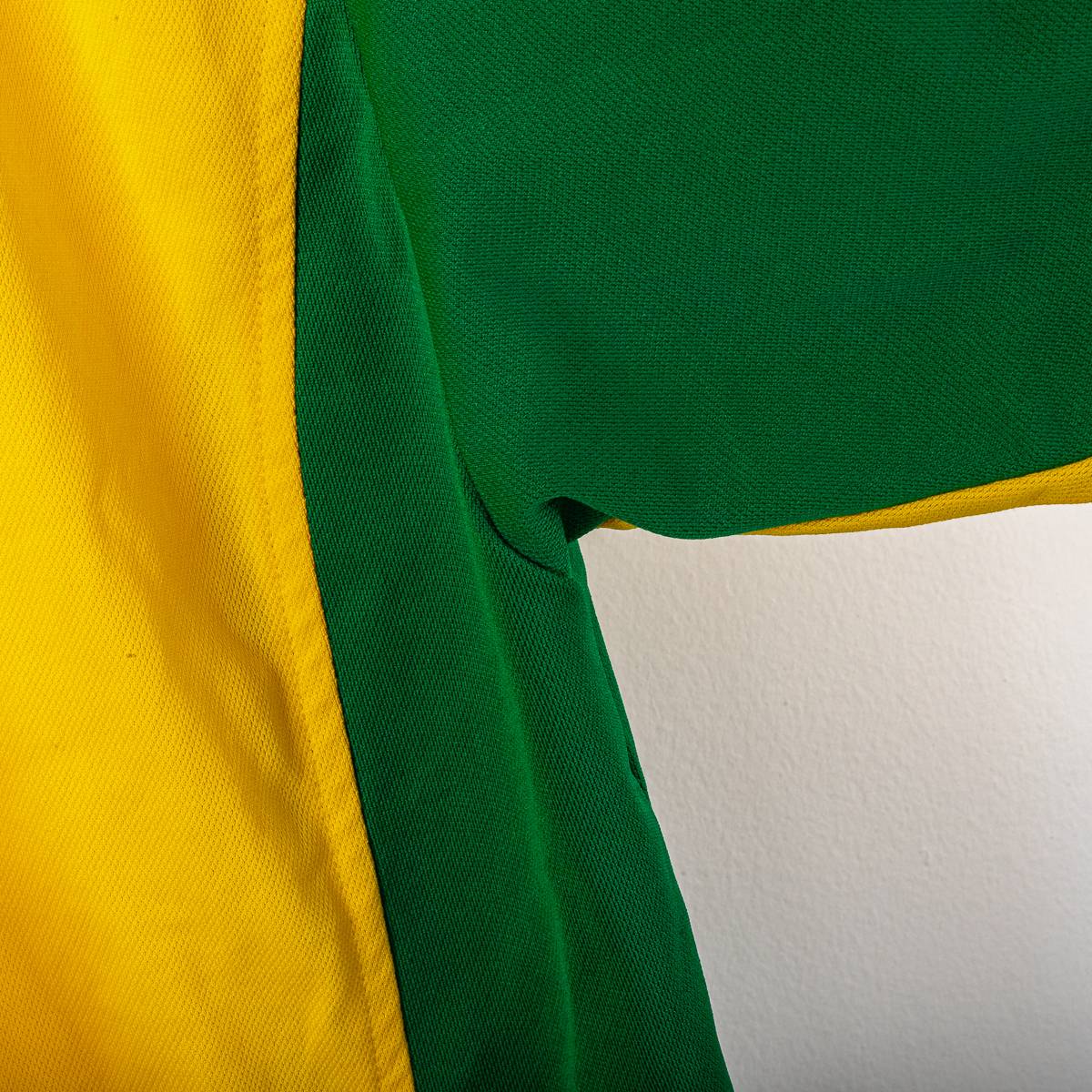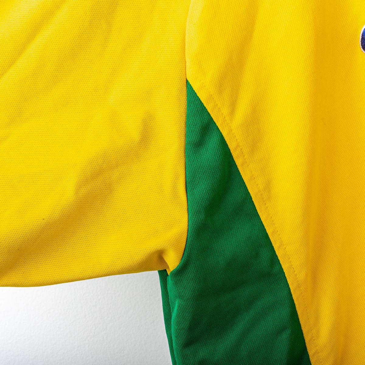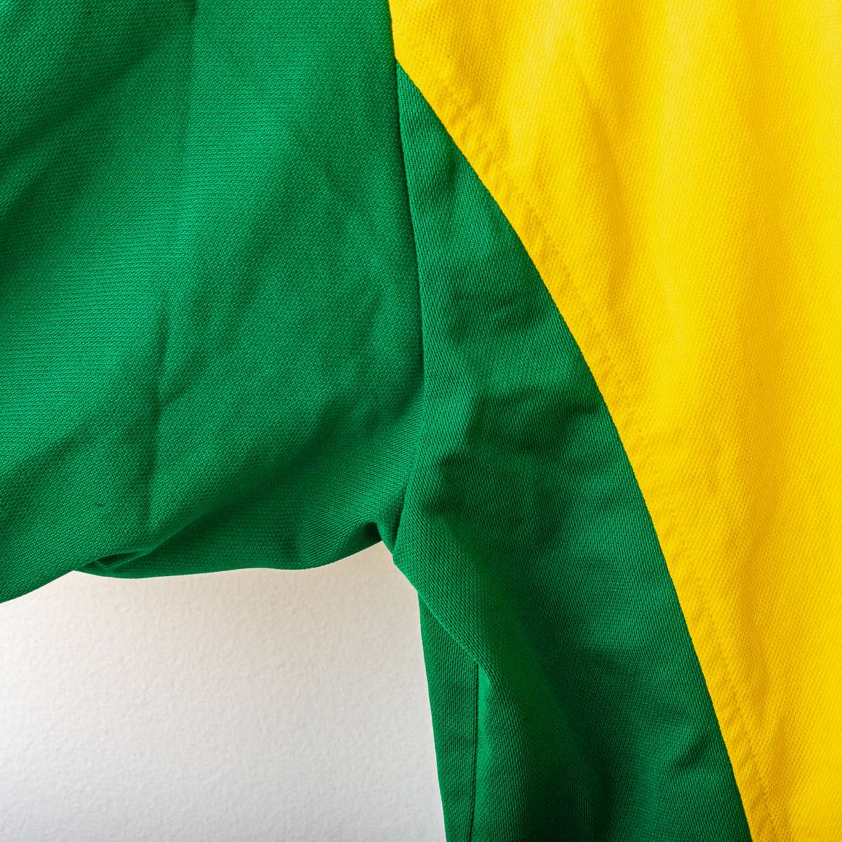 Maglia training della Nazionale brasiliana, stagione 1998, prodotta da Nike. Modello di colore giallo con inserti verde Brasile su maniche e spalle, design a manica raglan e colletto girocollo con bordo verde.