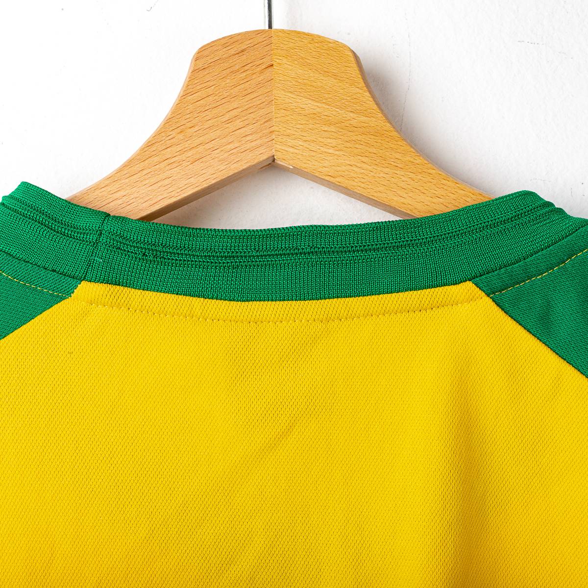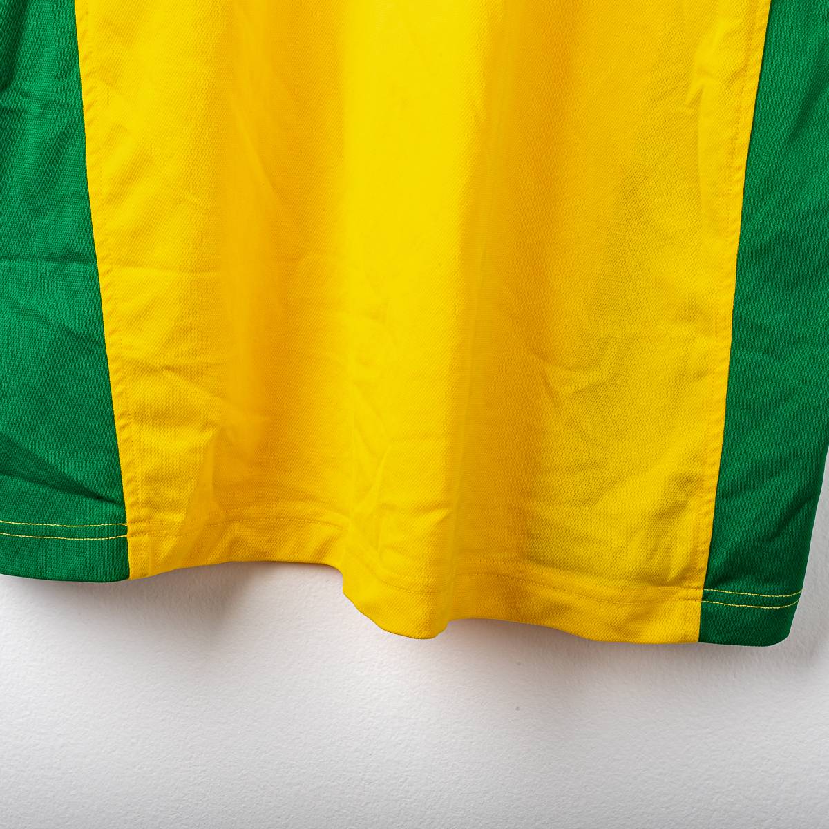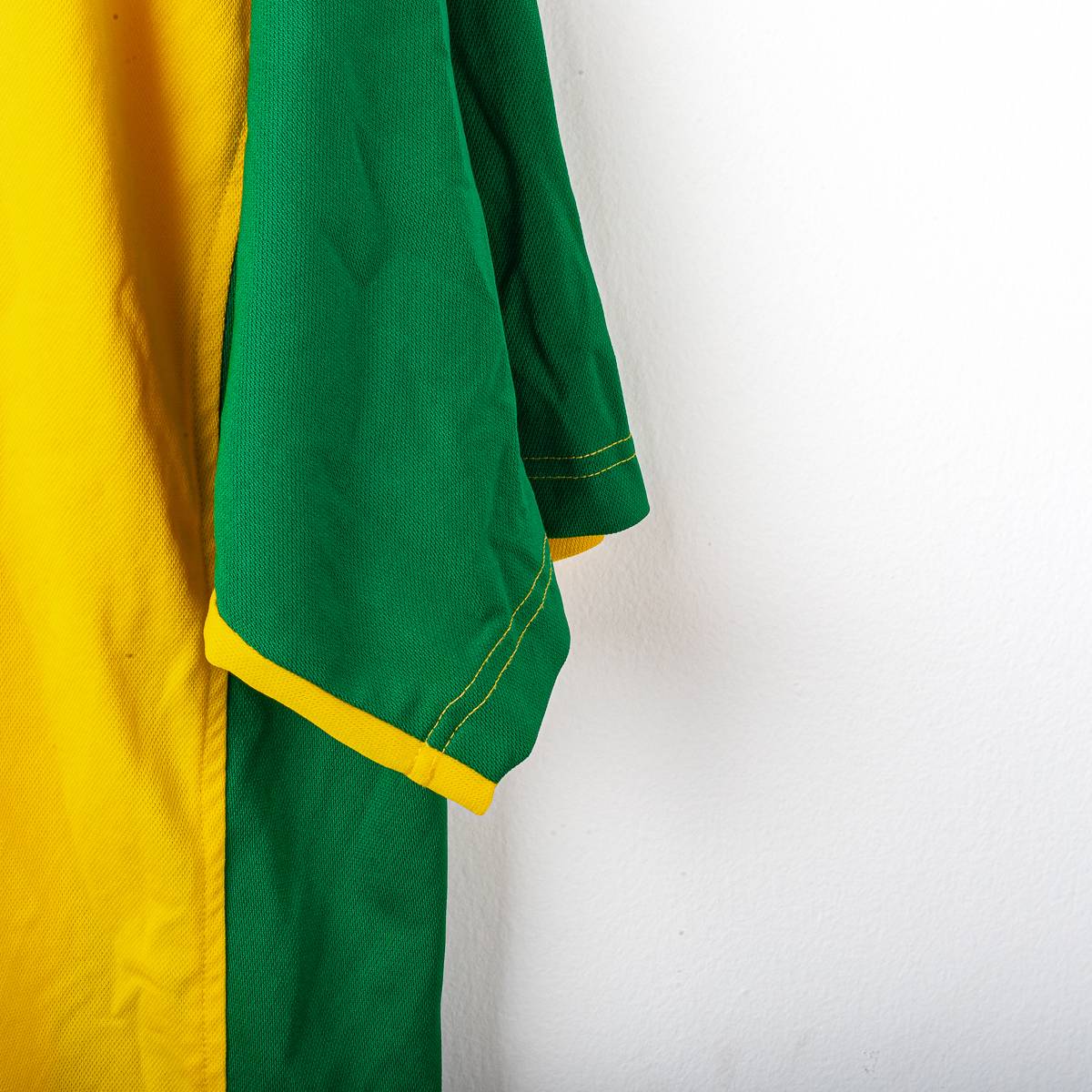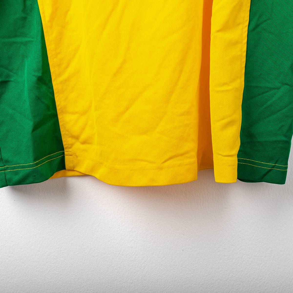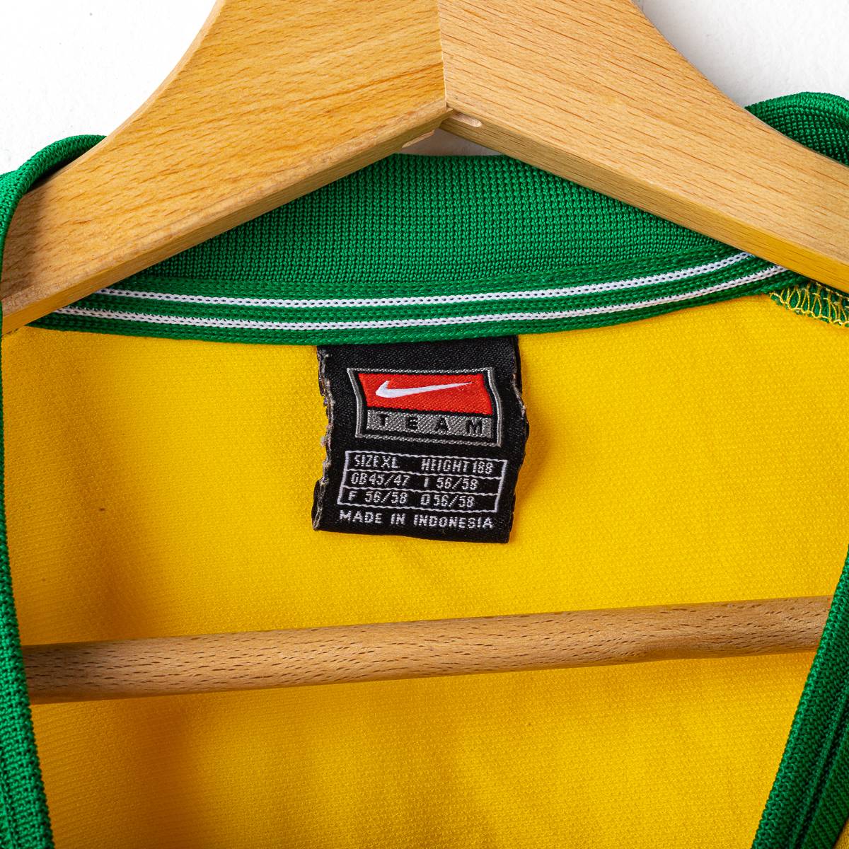 Maglia training della Nazionale brasiliana, stagione 1998, prodotta da Nike. Modello di colore giallo con inserti verde Brasile su maniche e spalle, design a manica raglan e colletto girocollo con bordo verde.
