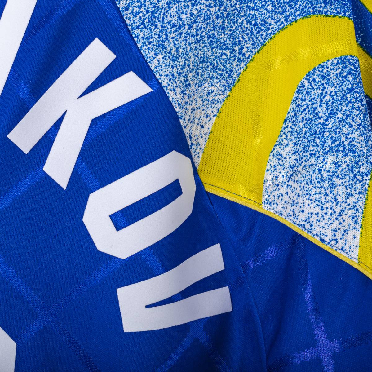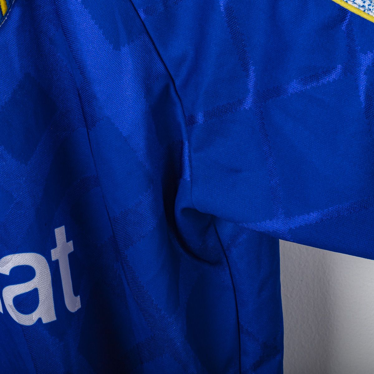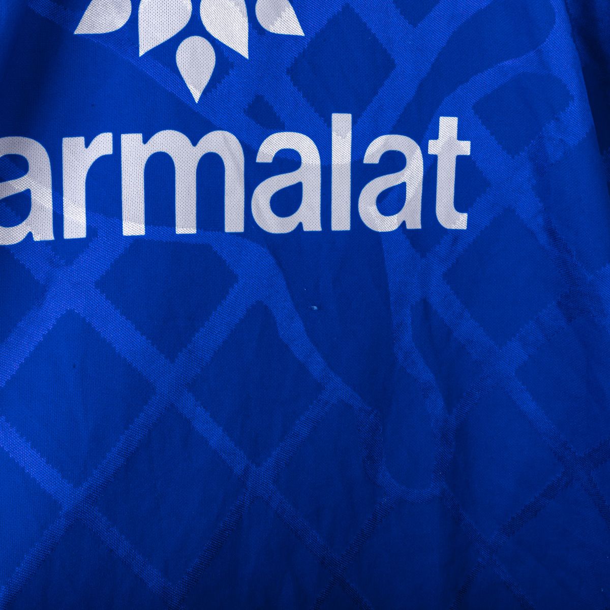 Maglia third del Parma A.C. stagione 1995/1996 realizzata da Puma. Colore principale blu con grafica geometrica tono su tono e inserti gialli e azzurri su spalle e maniche con pattern speckled. Colletto a polo giallo con dettagli a contrasto. Logo Puma in flock (effetto vellutato) lato petto e stemma Parma A.C. applicato tramite patch cucita lato cuore. Sponsor Parmalat in stampa sul fronte con logo grafico centrale stampato. Nome Stoichkov e numero 8 sul retro in stile ufficiale della stagione. Taglia L.