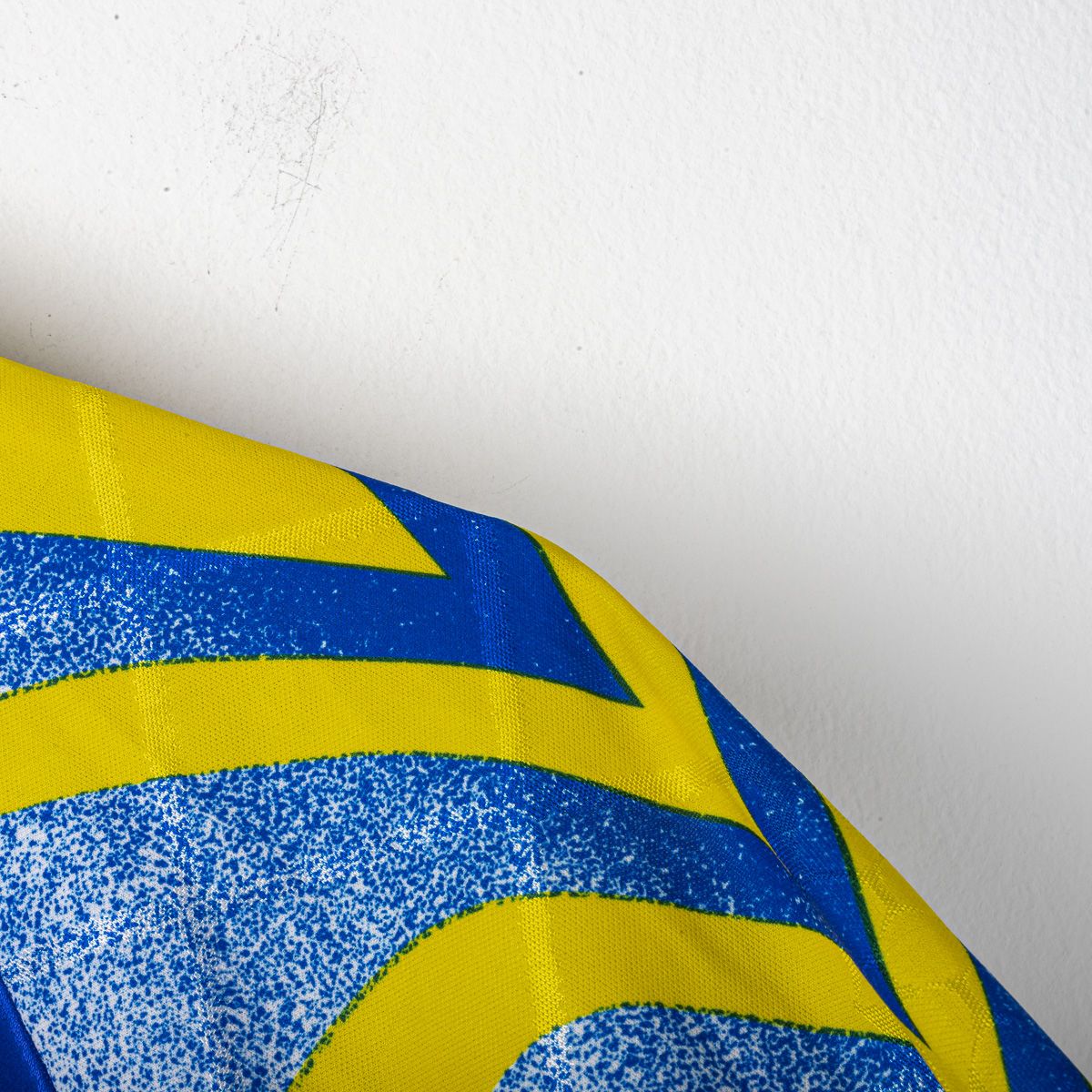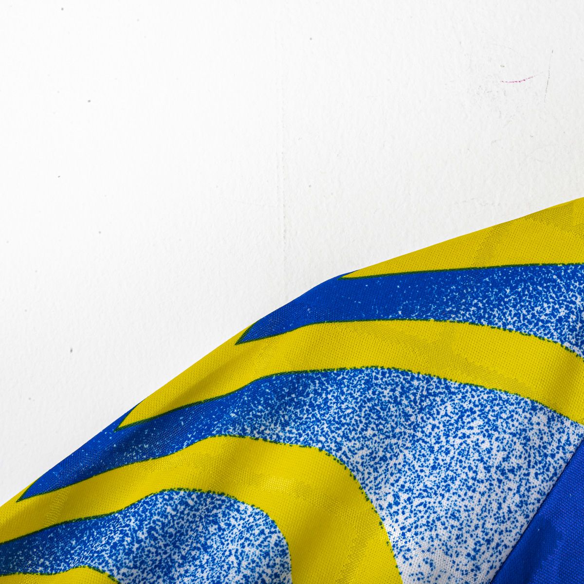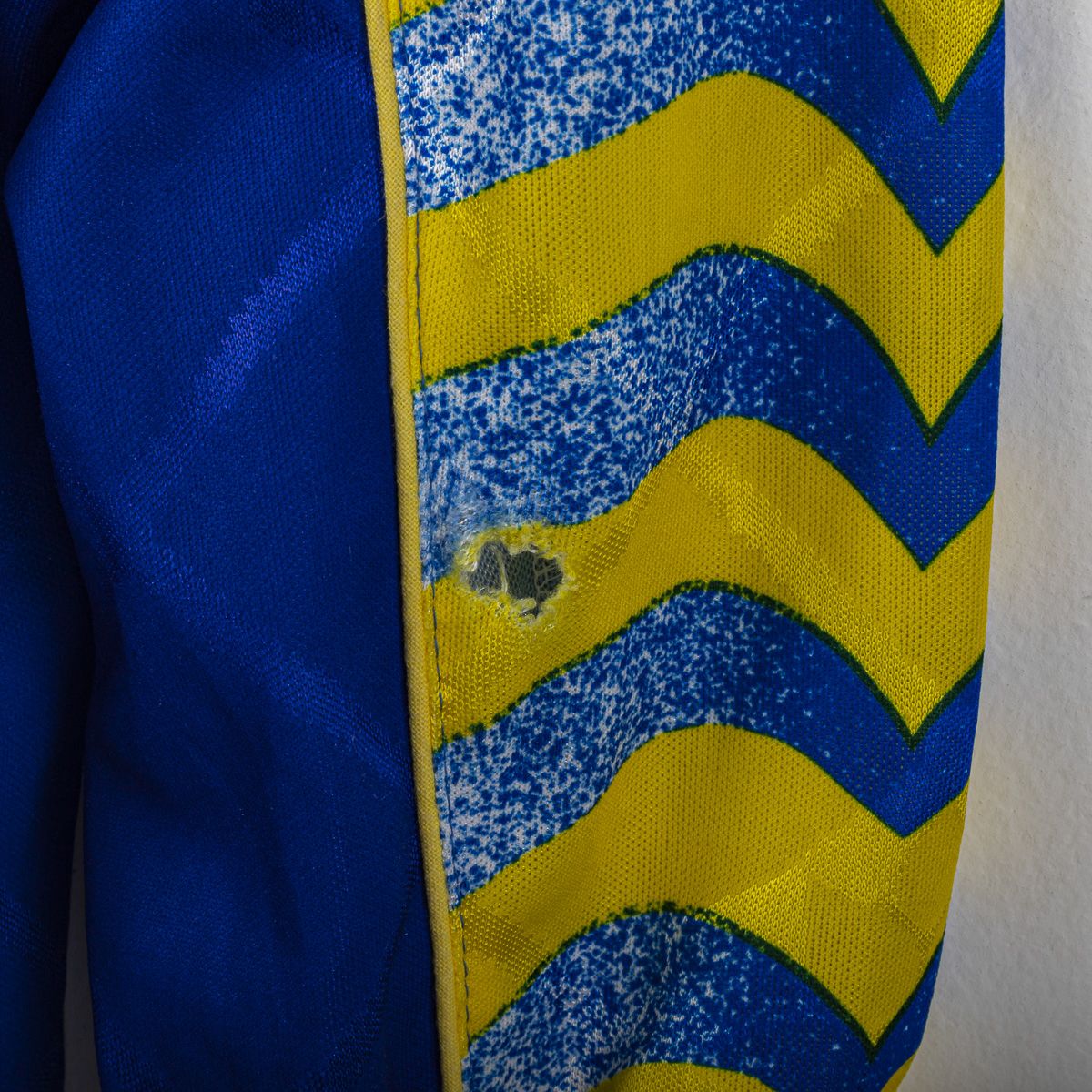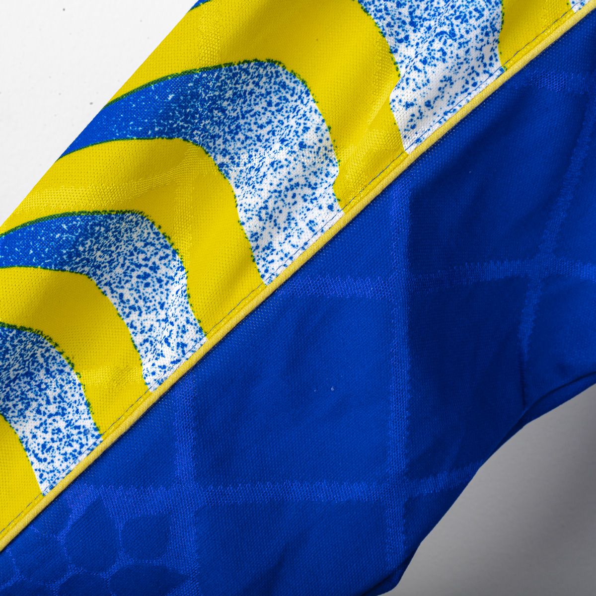 Maglia third del Parma A.C. stagione 1995/1996 realizzata da Puma. Colore principale blu con grafica geometrica tono su tono e inserti gialli e azzurri su spalle e maniche con pattern speckled. Colletto a polo giallo con dettagli a contrasto. Logo Puma in flock (effetto vellutato) lato petto e stemma Parma A.C. applicato tramite patch cucita lato cuore. Sponsor Parmalat in stampa sul fronte con logo grafico centrale stampato. Nome Stoichkov e numero 8 sul retro in stile ufficiale della stagione. Taglia L.