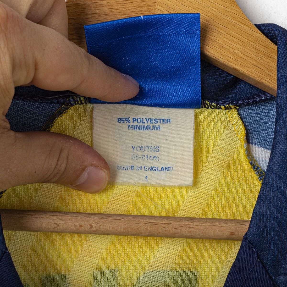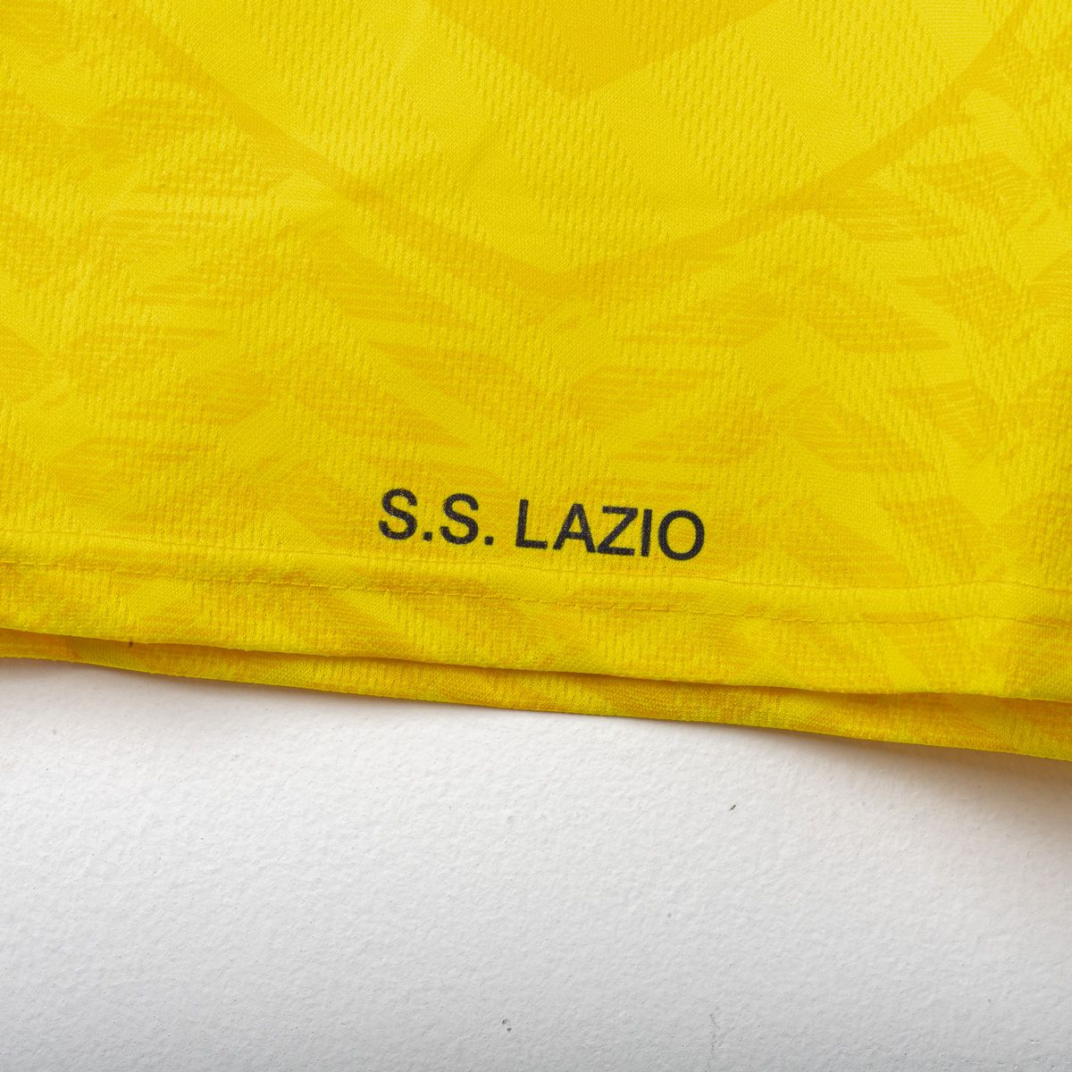 La divisa presenta una base gialla con dettagli blu sulle spalle e sul colletto. Sul petto sono applicati il logo Umbro, lo stemma della S.S. Lazio con l’aquila e lo sponsor commerciale Cirio, storico marchio presente sulle maglie biancocelesti in quel periodo.