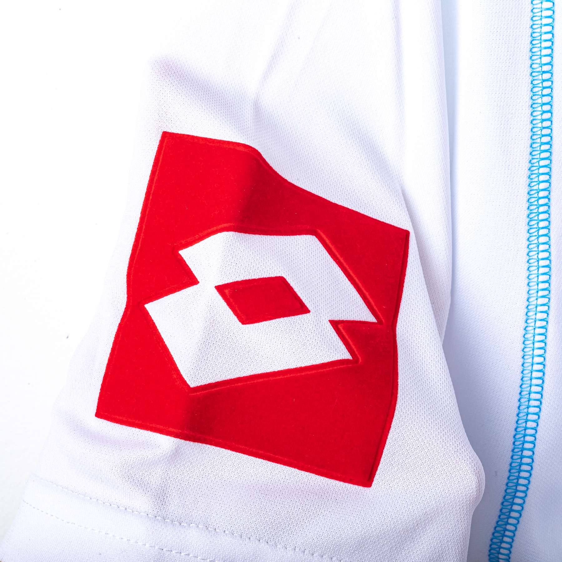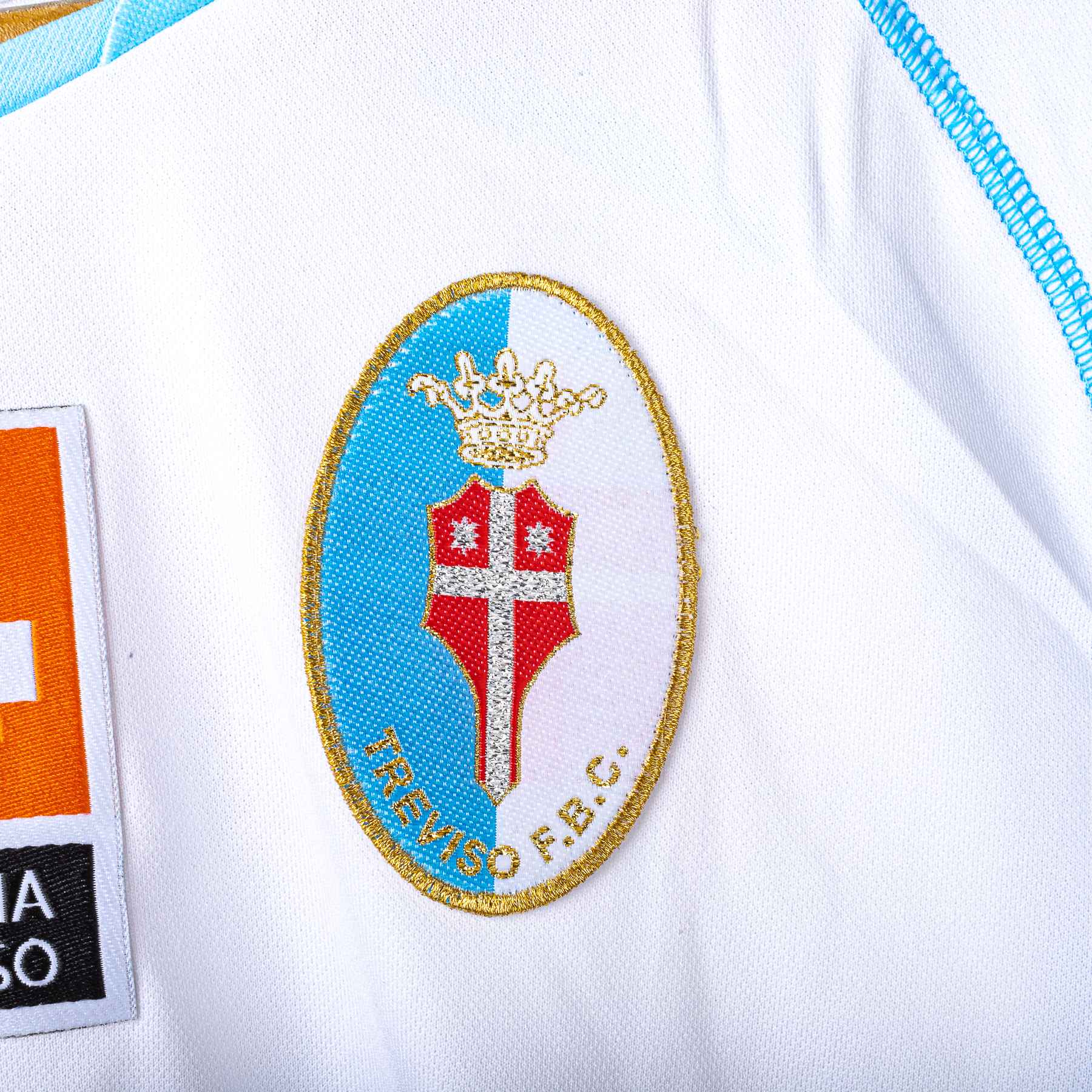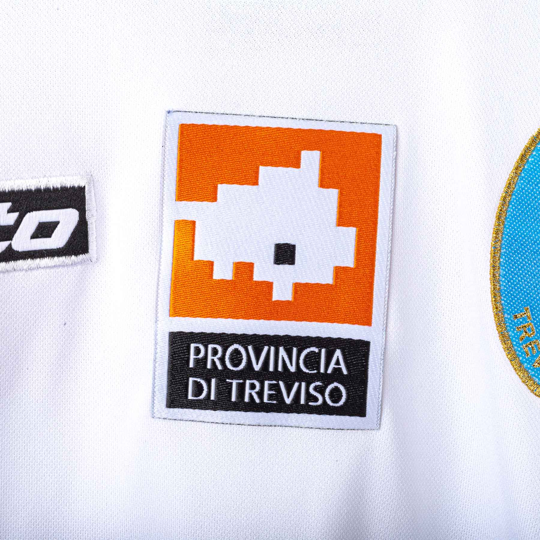 Maglia home del Treviso FBC per la stagione 2005/2006, realizzata da Lotto in occasione dell’unica storica annata del club in Serie A. Modello a base bianca con dettagli celesti lungo cuciture e pannelli laterali, design moderno con costruzione leggera in poliestere e inserti elasticizzati per migliorare comfort e traspirazione durante il gioco. Colletto a girocollo rinforzato, patch ufficiale “Lega Calcio Serie A” sulla manica destra e loghi Lotto in flock rosso applicati sulle maniche e sul petto.