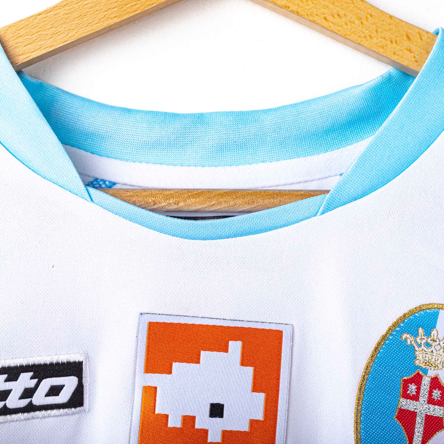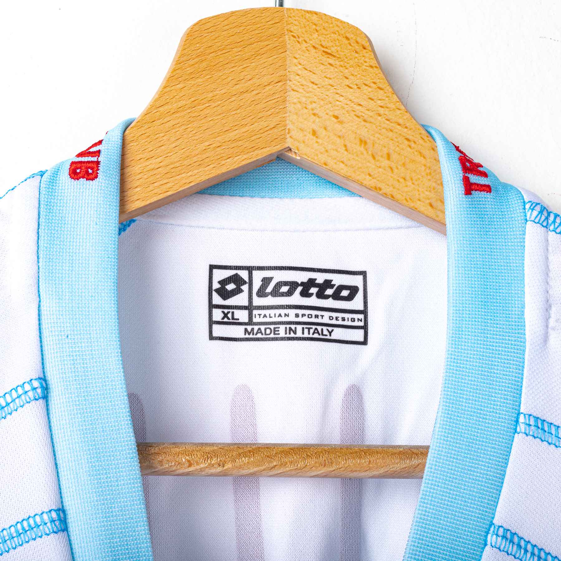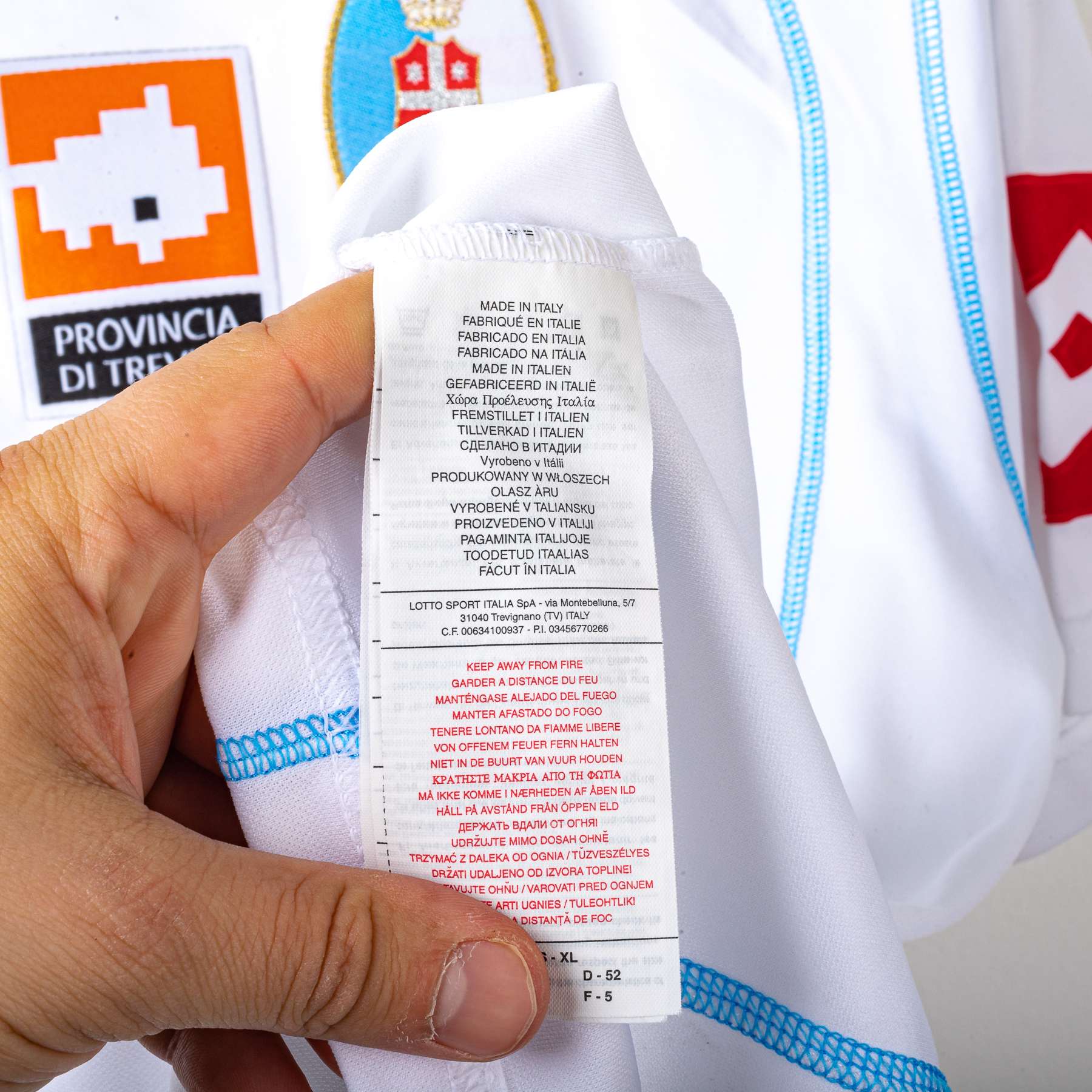 Maglia home del Treviso FBC per la stagione 2005/2006, realizzata da Lotto in occasione dell’unica storica annata del club in Serie A. Modello a base bianca con dettagli celesti lungo cuciture e pannelli laterali, design moderno con costruzione leggera in poliestere e inserti elasticizzati per migliorare comfort e traspirazione durante il gioco. Colletto a girocollo rinforzato, patch ufficiale “Lega Calcio Serie A” sulla manica destra e loghi Lotto in flock rosso applicati sulle maniche e sul petto.