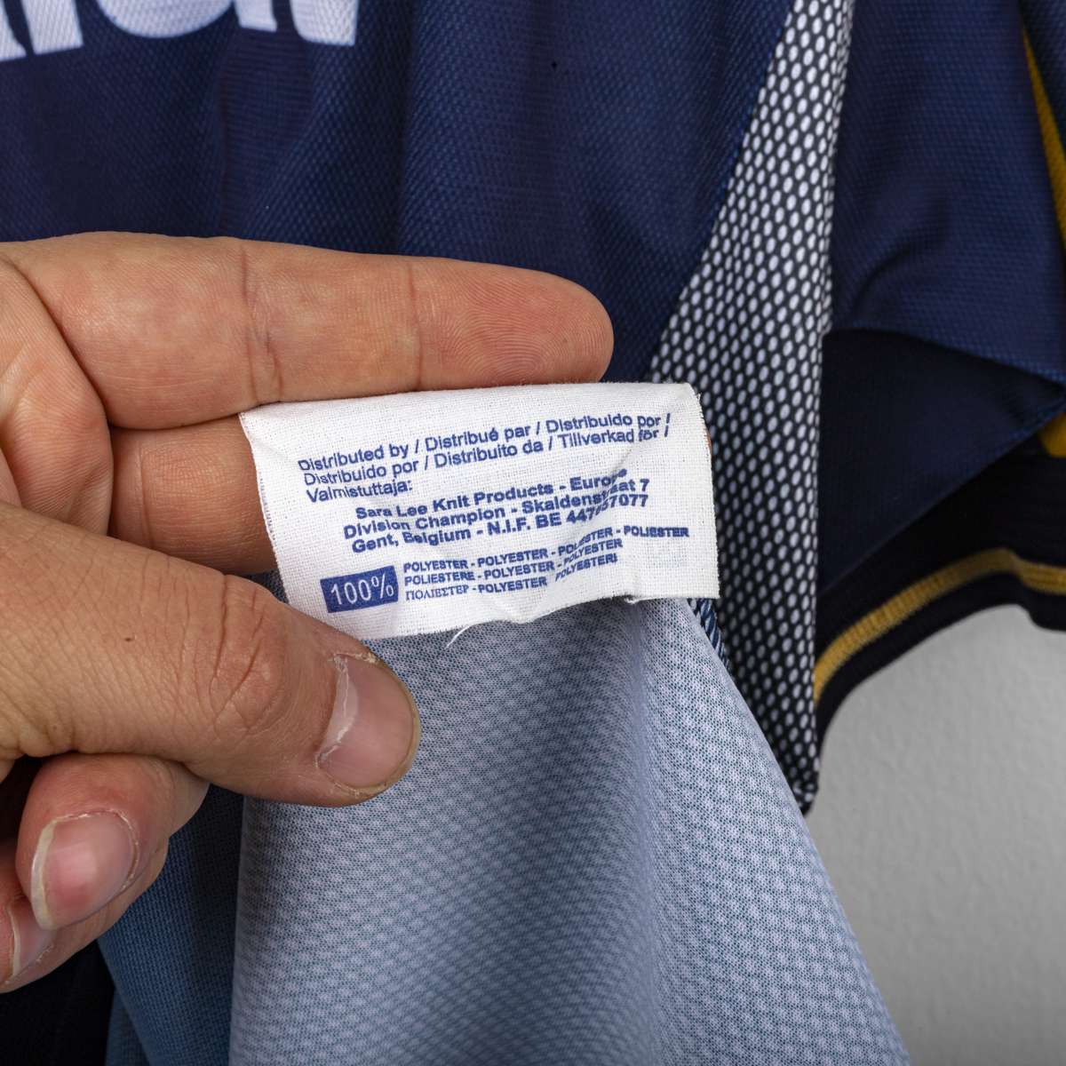 Parma A.C. third shirt from the 2000/2001 season, produced by Champion. The shirt is dark blue. Parma crest applied on the left chest. Parmalat sponsor applied in white print in the center. “Parma A.C.” detail embroidered on the back of the collar. The name THURAM and number 21 are applied in blue plastic with a gold outline on the back. Original Champion internal label. Made in Italy. Size XL.