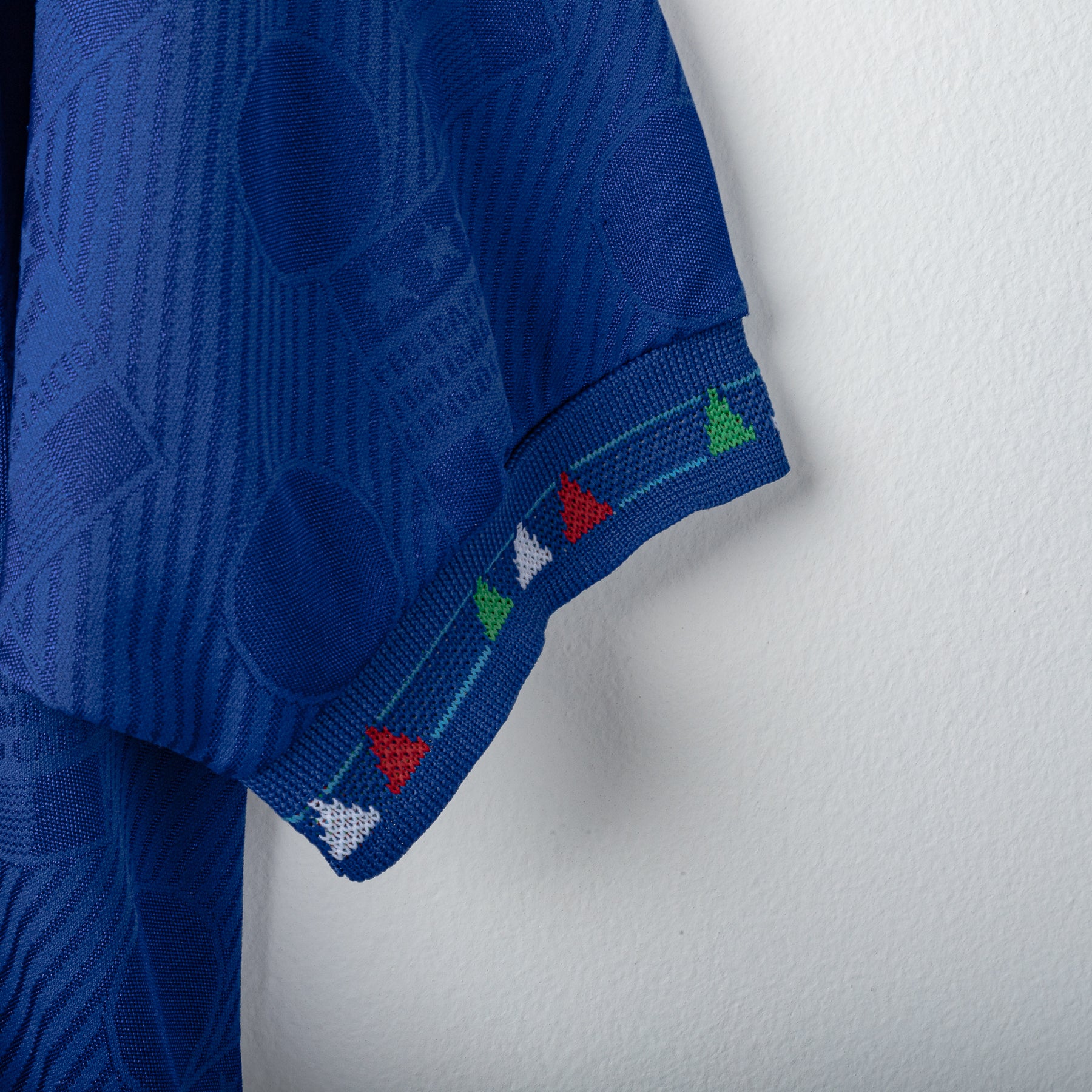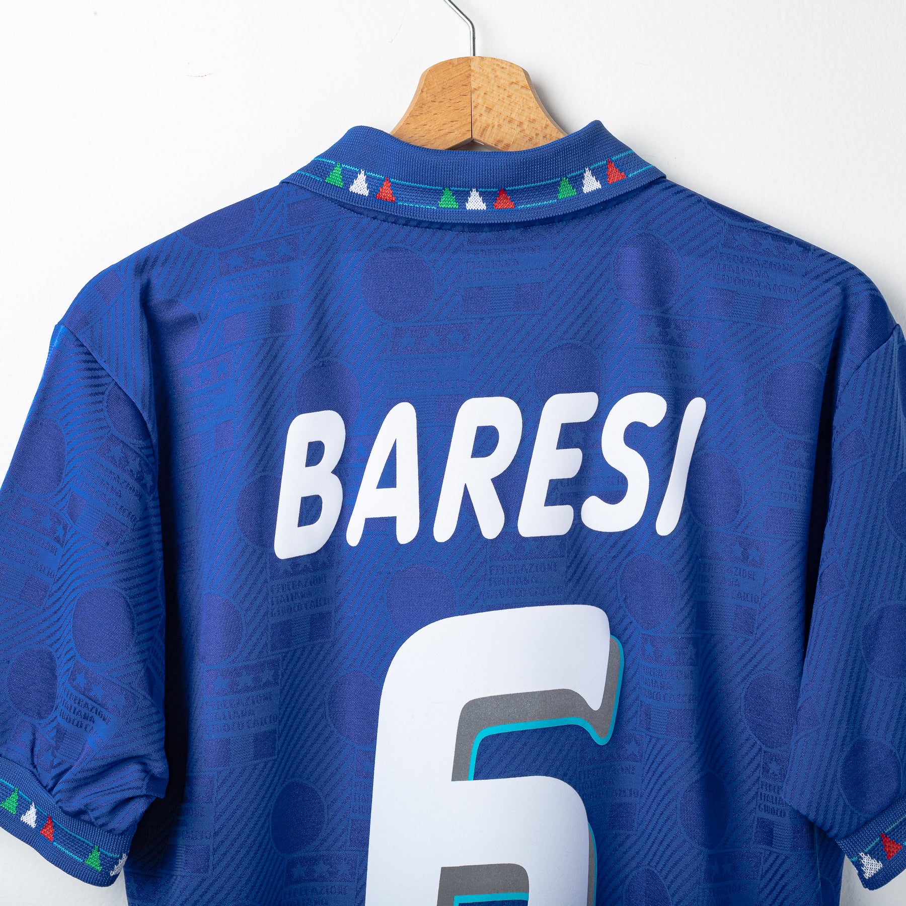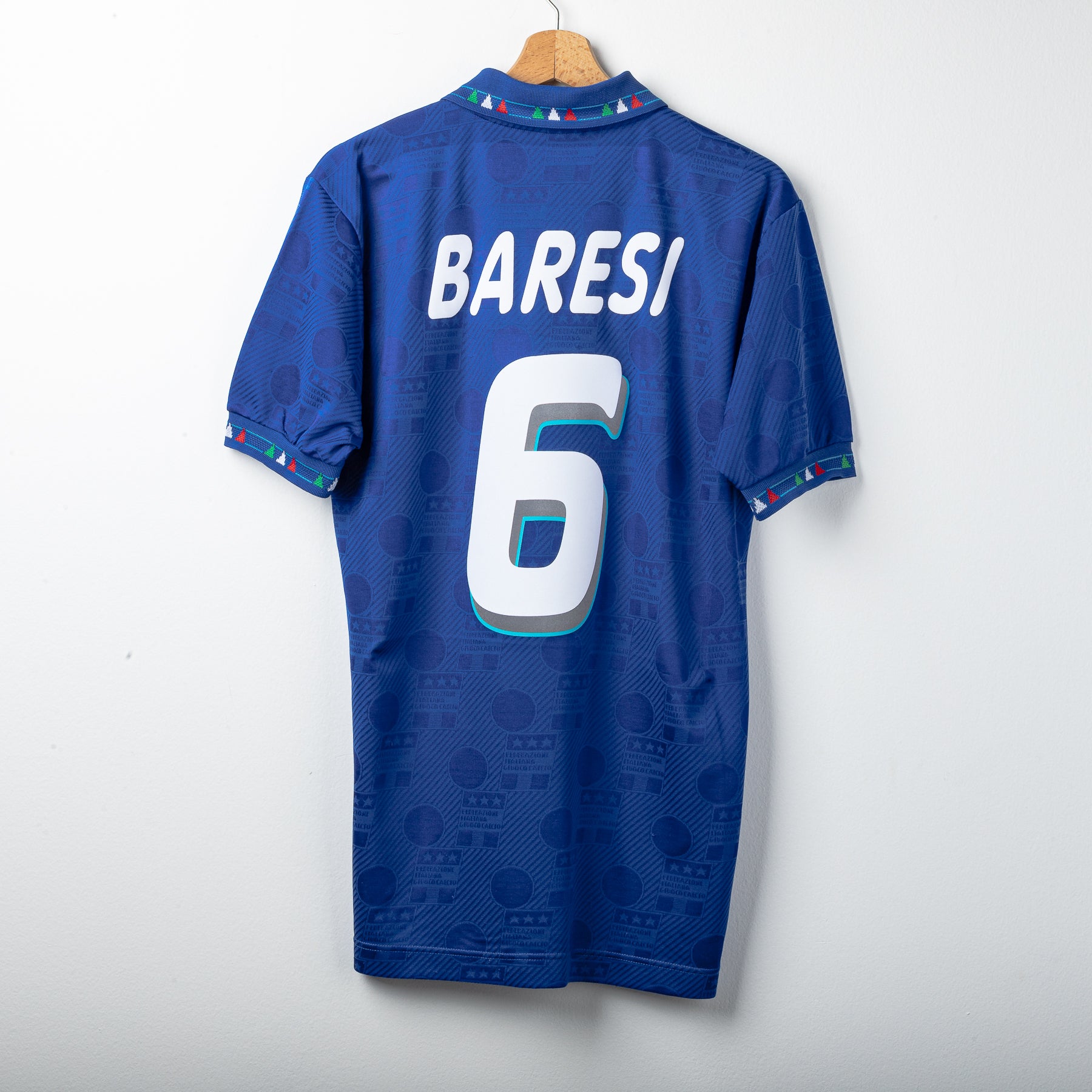 Maglia home della Nazionale italiana utilizzata ai Mondiali USA 1994, prodotta da Diadora. Classico azzurro con grafica jacquard tono su tono dedicata alla FIGC su tutto il tessuto. Colletto a polo in maglia con abbottonatura frontale e bordi decorati da motivo geometrico tricolore, ripreso anche sui polsini. Sul petto patch FIGC con tre stelle ricamata e cucita. Numero 6 frontale in stampa gommata bianca con contorno grigio e profilo verde; sul retro personalizzazione ufficiale Baresi 6 in grande formato. Tessuto 100% poliestere Made in Italy, leggero e traspirante. Maglia originale Diadora della Nazionale italiana a USA 94, resa iconica dalla storica personalizzazione di Franco Baresi, con lievi segni di utilizzo dovuti al tempo.