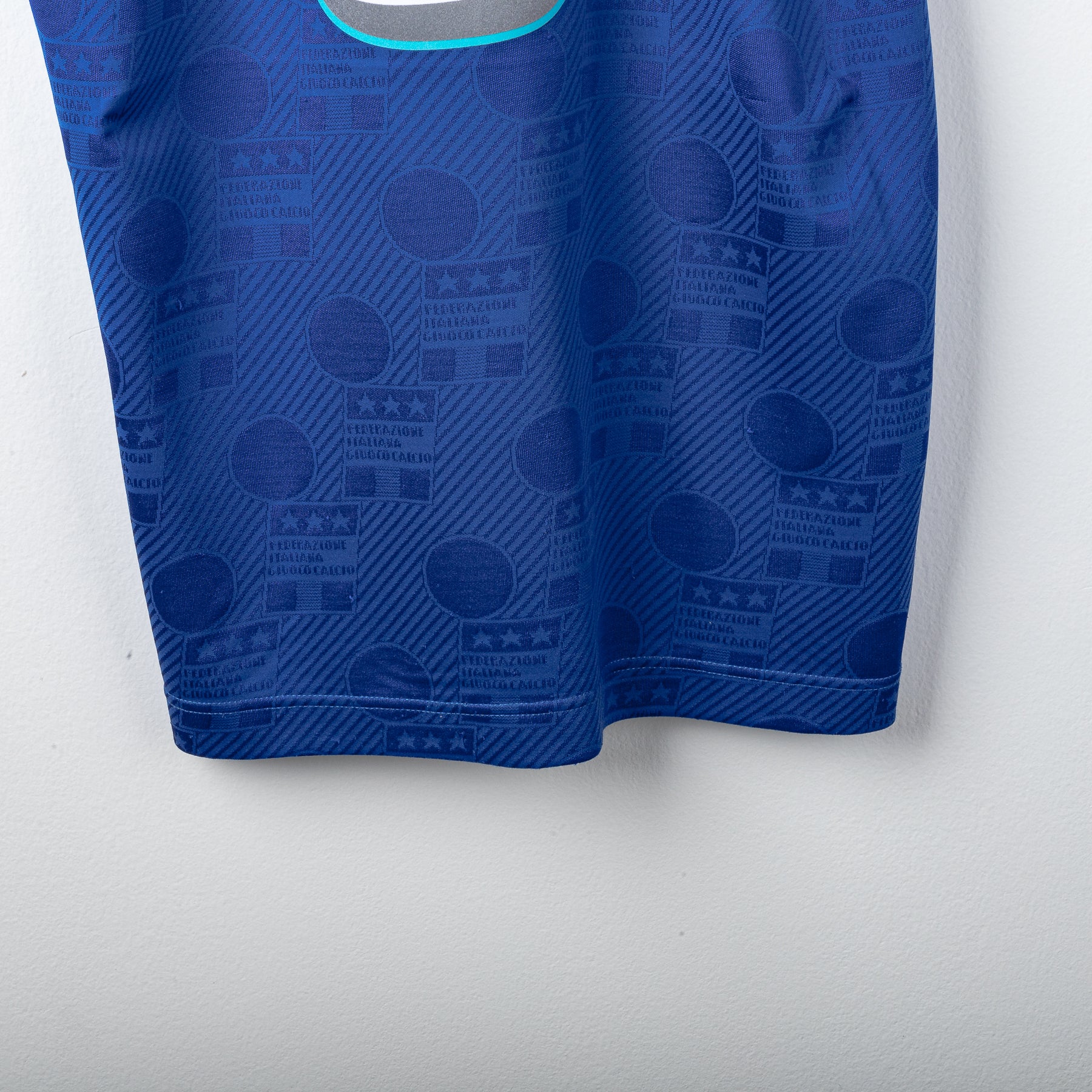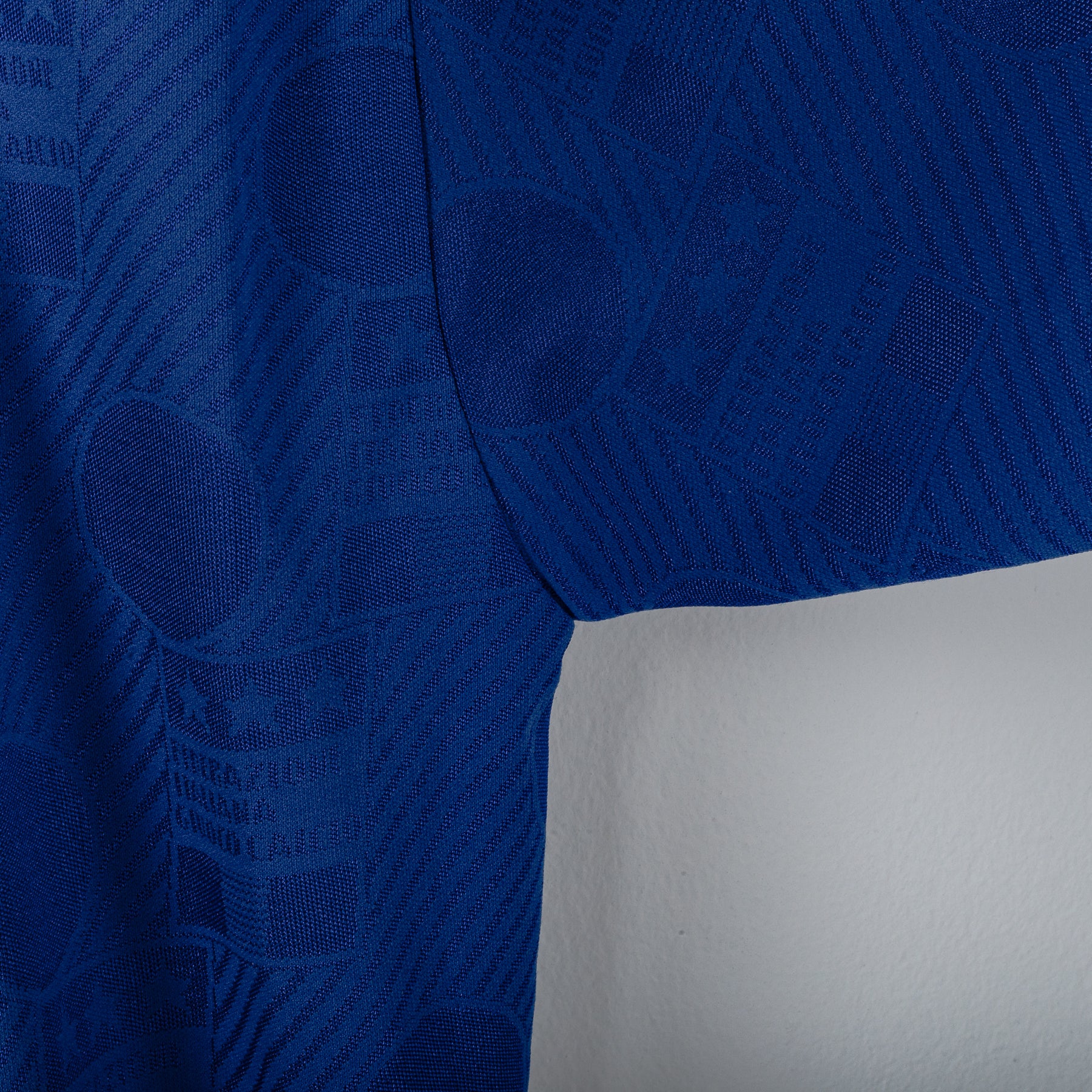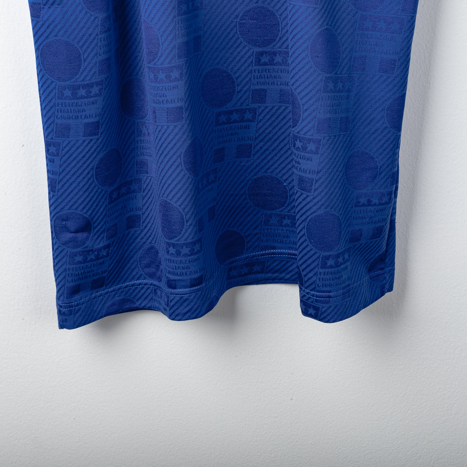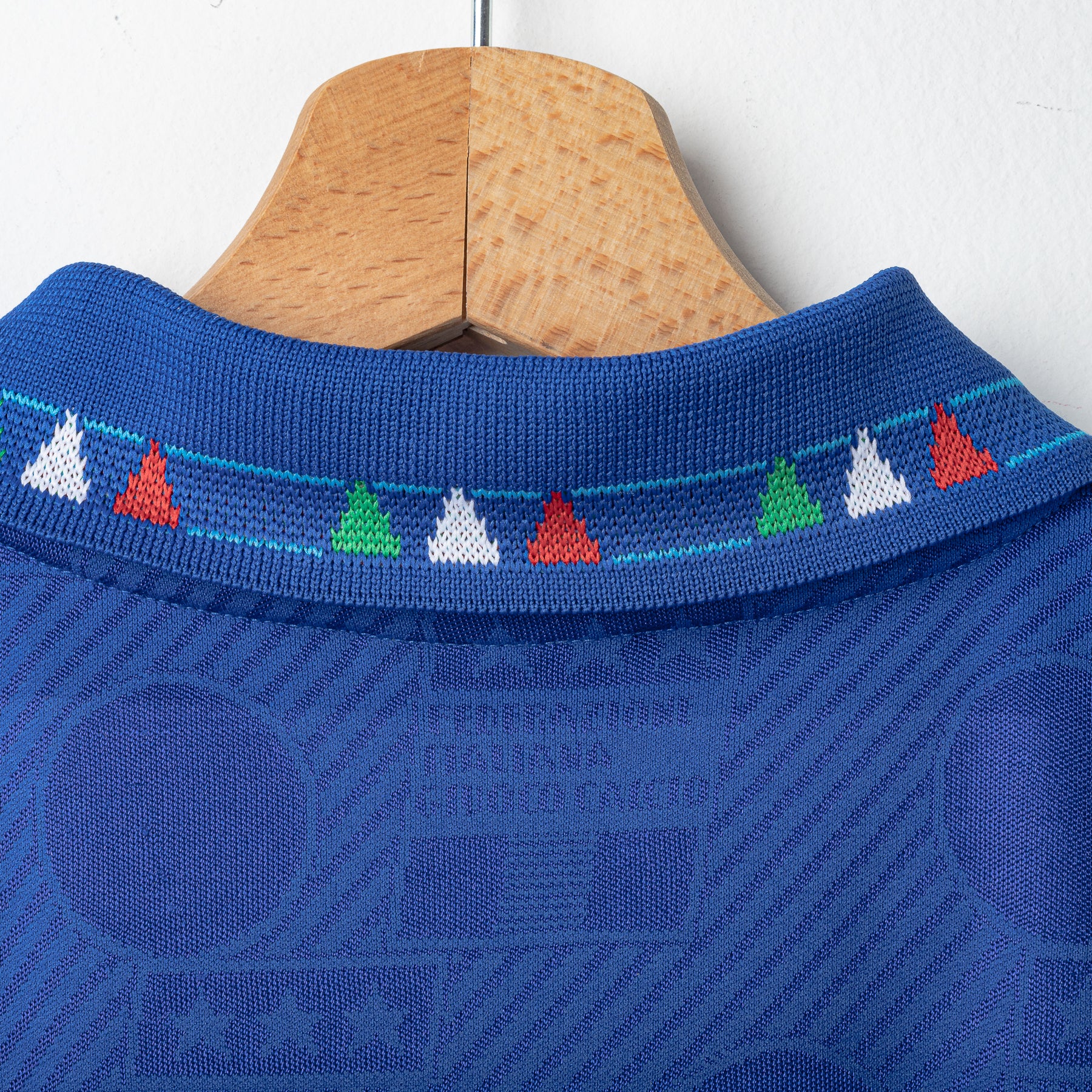 Maglia home della Nazionale italiana utilizzata ai Mondiali USA 1994, prodotta da Diadora. Classico azzurro con grafica jacquard tono su tono dedicata alla FIGC su tutto il tessuto. Colletto a polo in maglia con abbottonatura frontale e bordi decorati da motivo geometrico tricolore, ripreso anche sui polsini. Sul petto patch FIGC con tre stelle ricamata e cucita. Numero 6 frontale in stampa gommata bianca con contorno grigio e profilo verde; sul retro personalizzazione ufficiale Baresi 6 in grande formato. Tessuto 100% poliestere Made in Italy, leggero e traspirante. Maglia originale Diadora della Nazionale italiana a USA 94, resa iconica dalla storica personalizzazione di Franco Baresi, con lievi segni di utilizzo dovuti al tempo.
