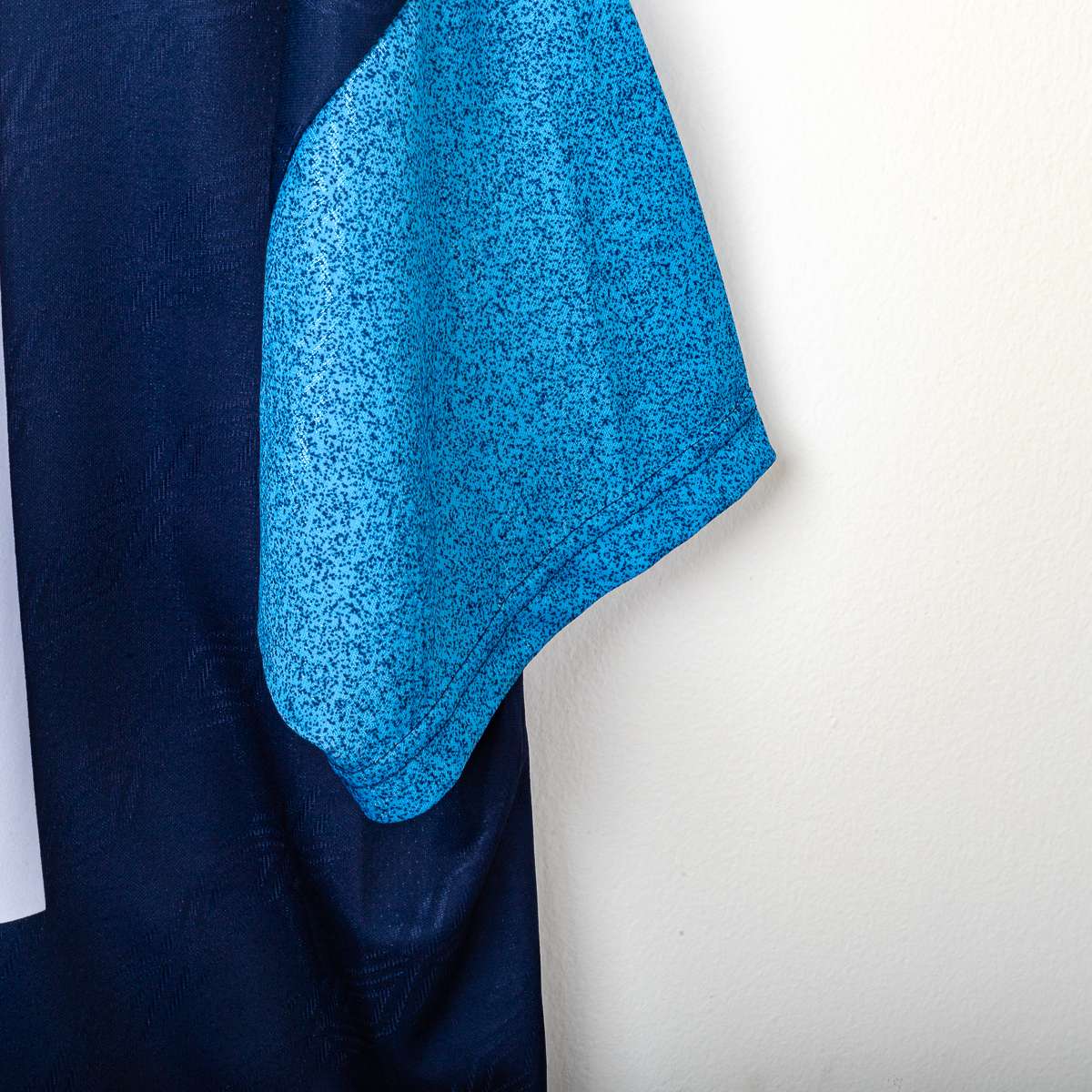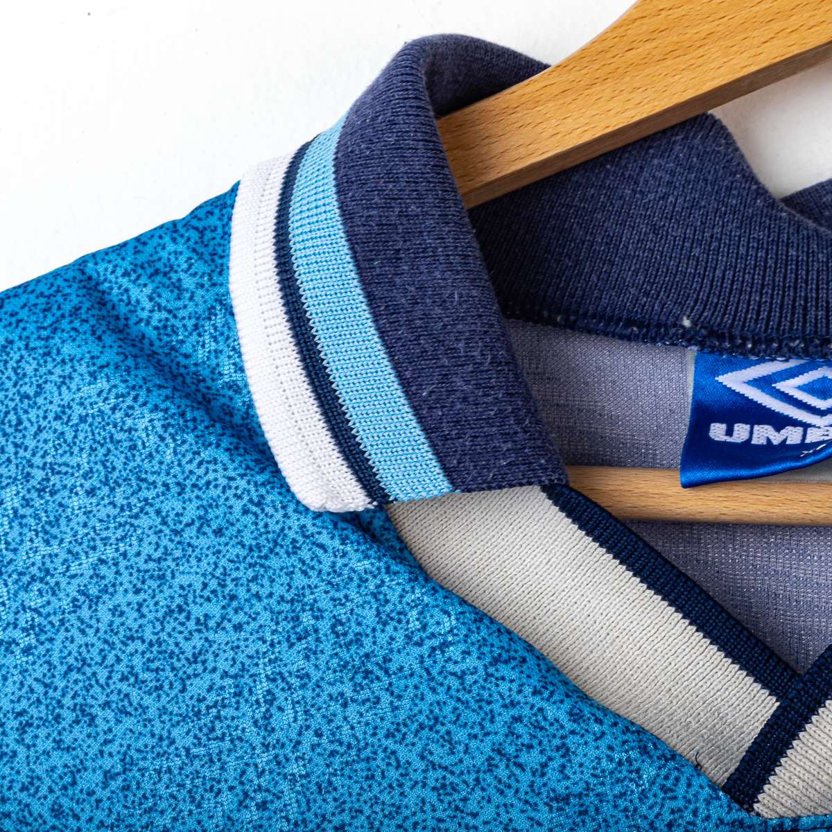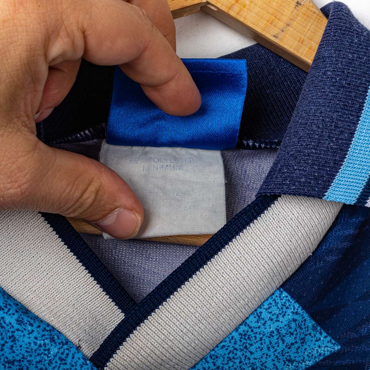 Maglia third della S.S. Lazio stagione 1995/1996, prodotta da Umbro. Base blu navy con maxi grafica geometrica in azzurro sul fronte e sulle maniche, colletto a V con righe a contrasto. Logo Umbro stampato lato destro e Stemma S.S. Lazio ricamato lato cuore. Sponsor centrale “Banca di Roma” stampato in sublimatoco di colore bianco. Sul retro nome Signori e numero 11 in bianco in materiale floccato. Etichetta interna Umbro: taglia XL (Mens 112 cms), “Made in England”, composizione indicata “85% polyester minimum”.