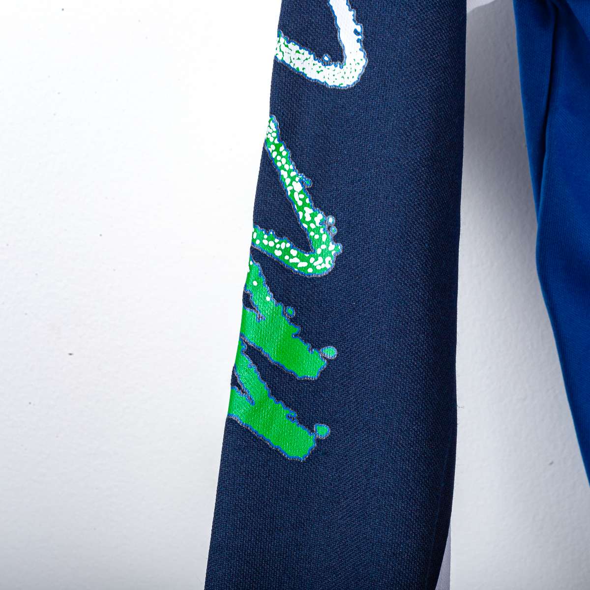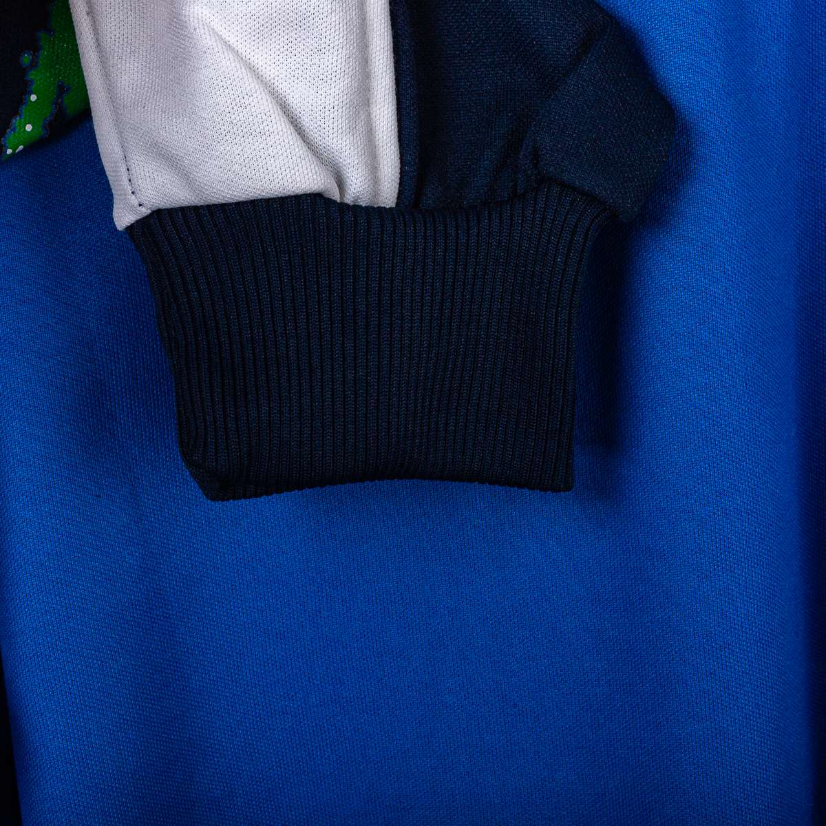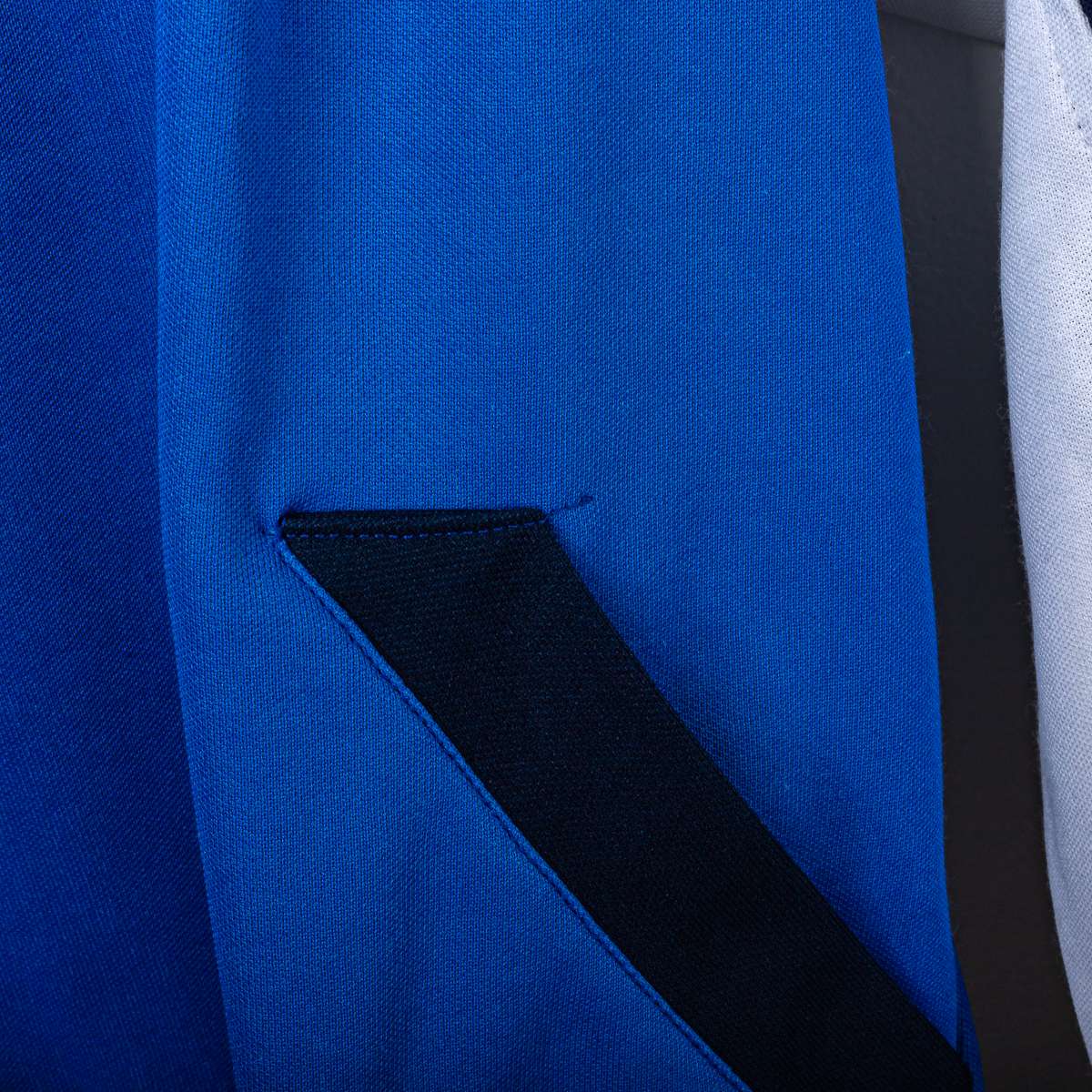 Italian national football team official jacket from the early 1990s, produced by Diadora for the IP program. Full-zip jacket with a high collar, made of 100% polyester technical fabric in light blue with contrasting navy blue and white inserts on the sleeves in a geometric style typical of the era. Diadora logo and IP branding applied in velvet on the right chest, FIGC crest with tricolor and stars sewn on the left chest. Elasticated cuffs and hem for a regular fit, a sporty 1990s-style jacket for official and pre-match wear. Integrated side pockets, front zip with branded pull tab. Diadora internal label with the words "Italian National Football Team" and "Made in Yugoslavia"; size L indicated on the label.
