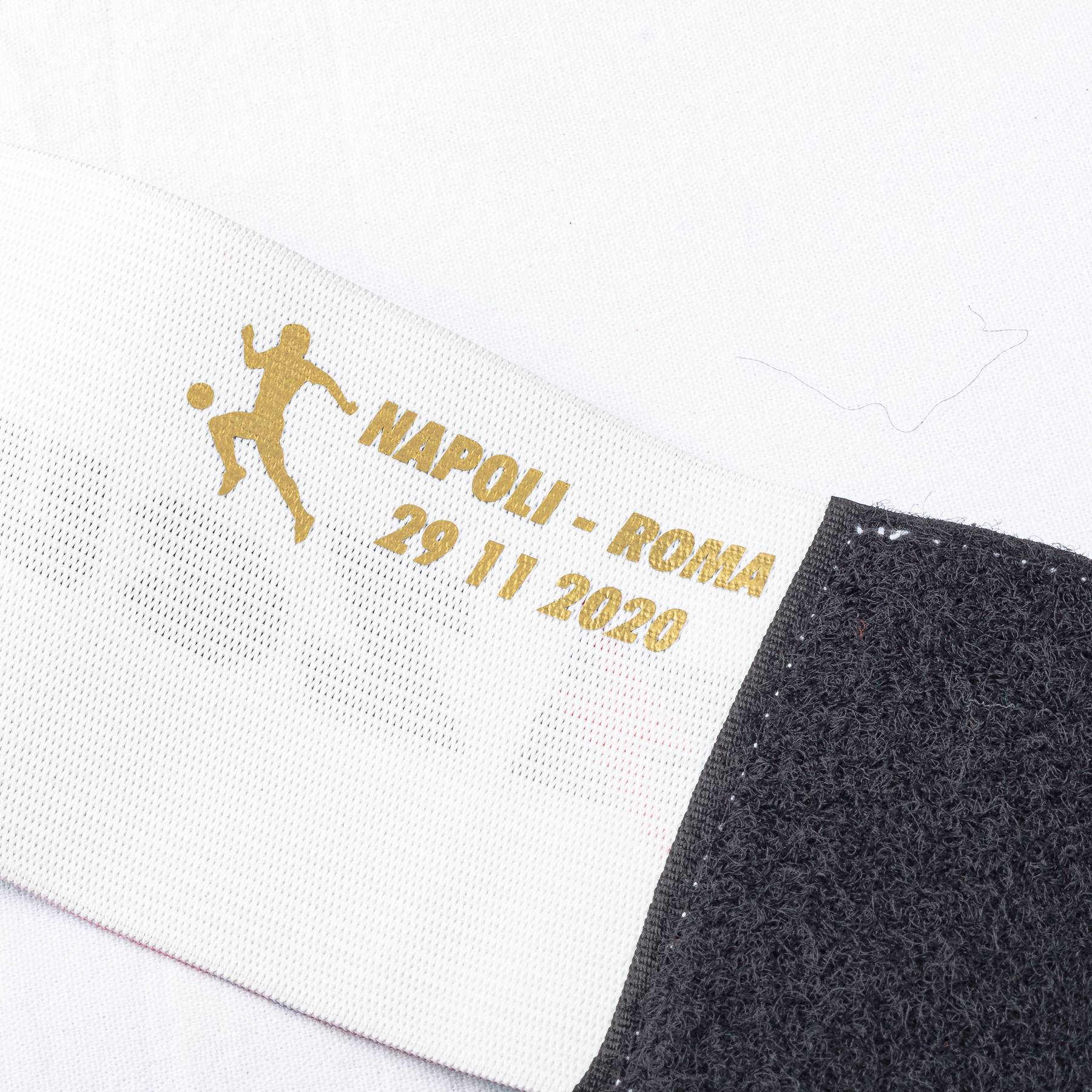 All’interno è presente la stampa dorata con la scritta “Napoli – Roma 29 11 2020” e la sagoma del calciatore in azione, dettaglio esclusivo realizzato per quella partita. Modello ufficiale da gara, in tessuto tecnico elastico con chiusura in velcro e linguetta regolabile.
