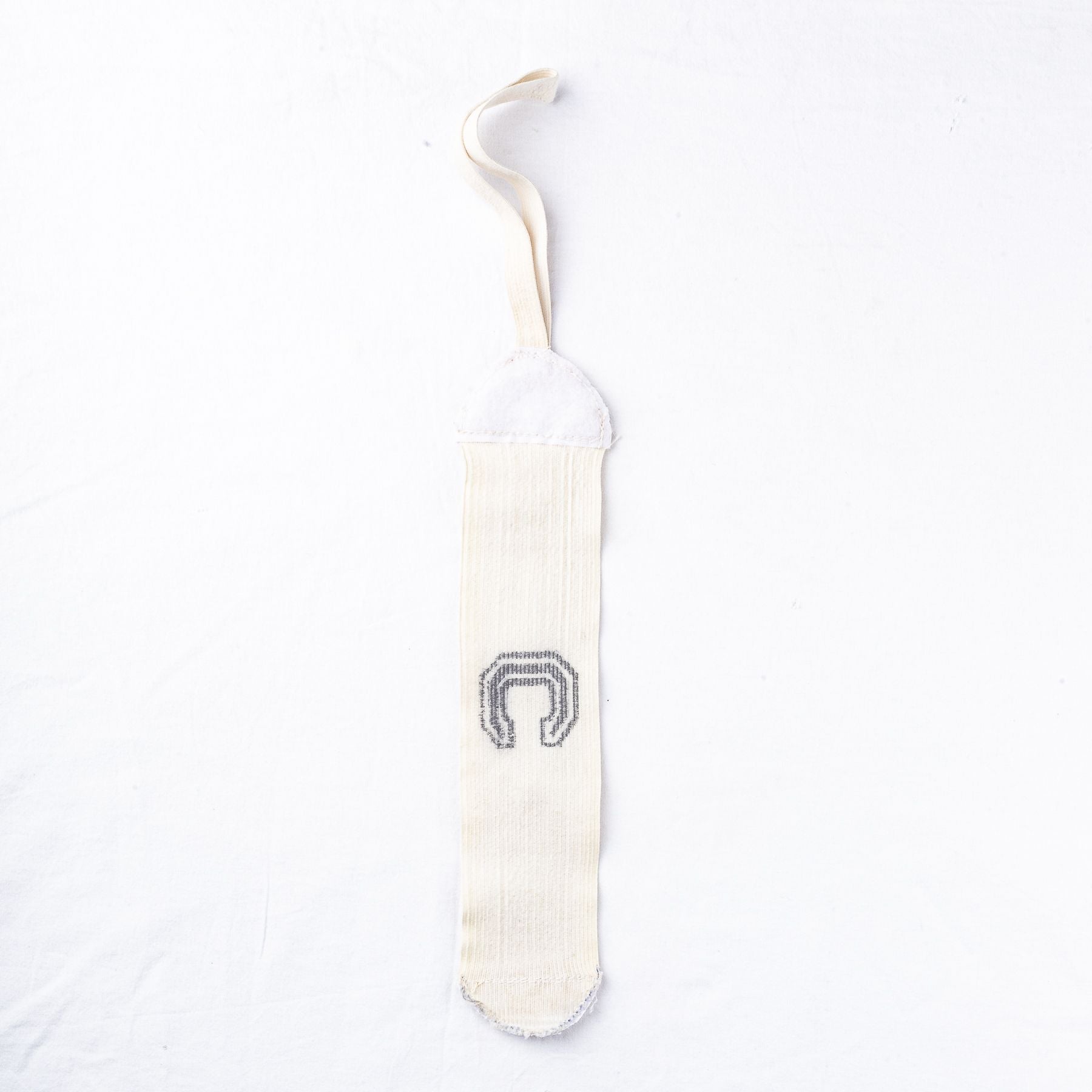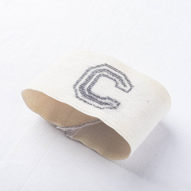 Fascia da capitano originale d’epoca, modello utilizzato da Diego Armando Maradona tra il 1986 e il 1990. Realizzata in tessuto elastico color bianco panna, con grande lettera “C” in stampa verniciata di colore nero, identica a quella indossata da Maradona nelle stagioni del Napoli scudettato e nelle competizioni con la Nazionale argentina. Struttura continua con cucitura centrale e linguetta in tessuto per il fissaggio sul braccio. Segni di utilizzo e naturale ingiallimento omogeneo del materiale che ne testimoniano l’età e ne esaltano il valore collezionistico. Pezzo da memorabilia altamente iconico, legato agli anni d’oro di Maradona tra Napoli e Argentina.