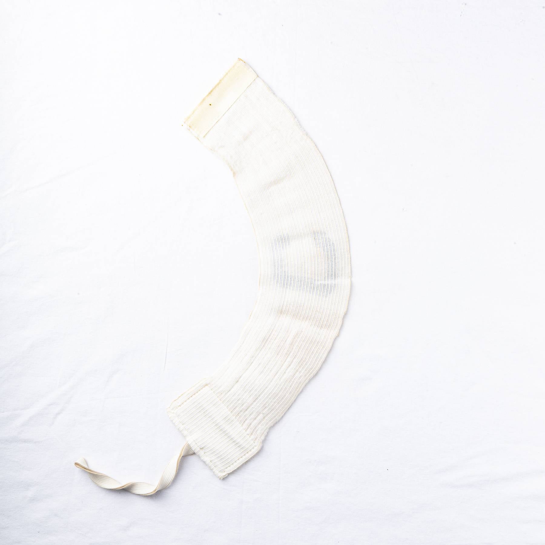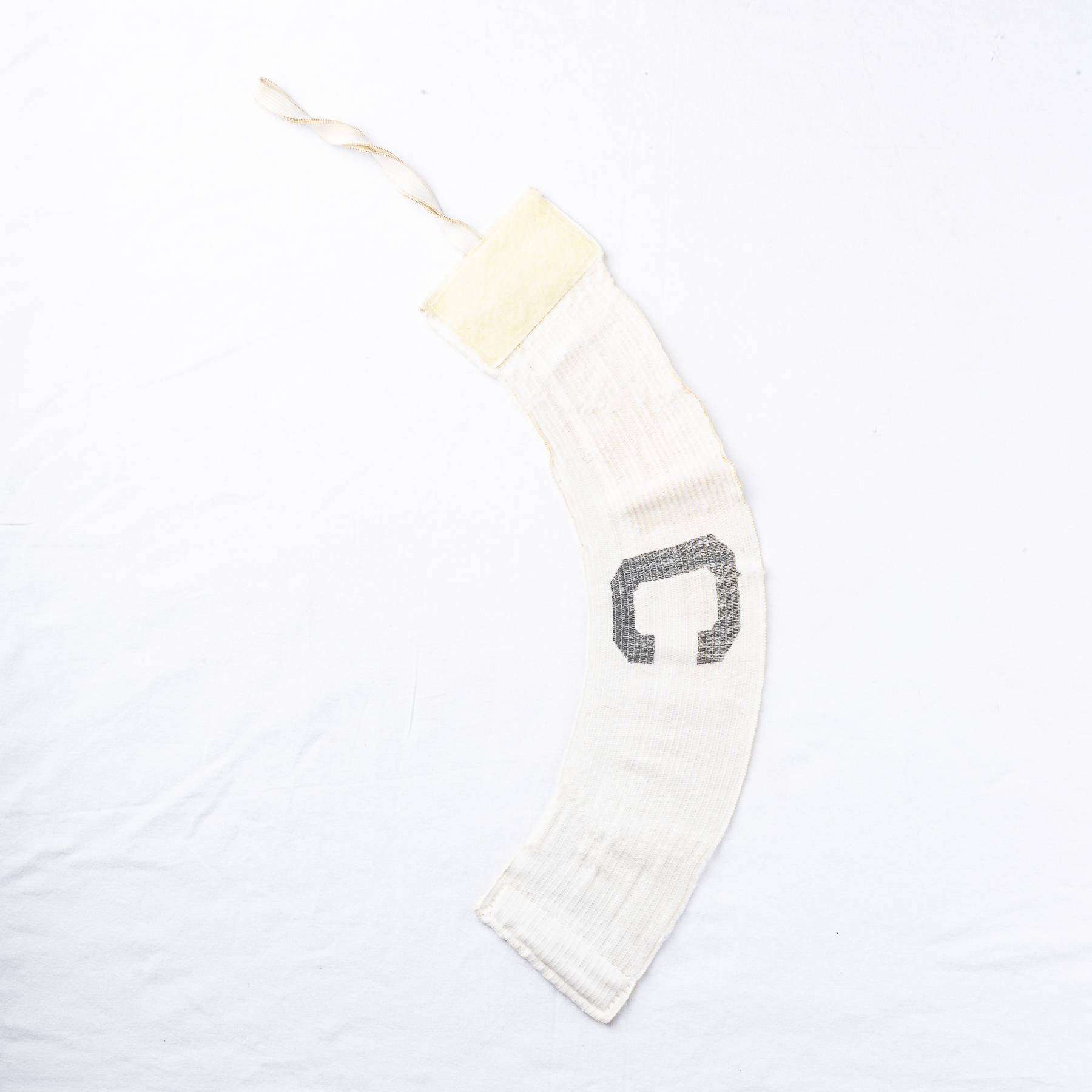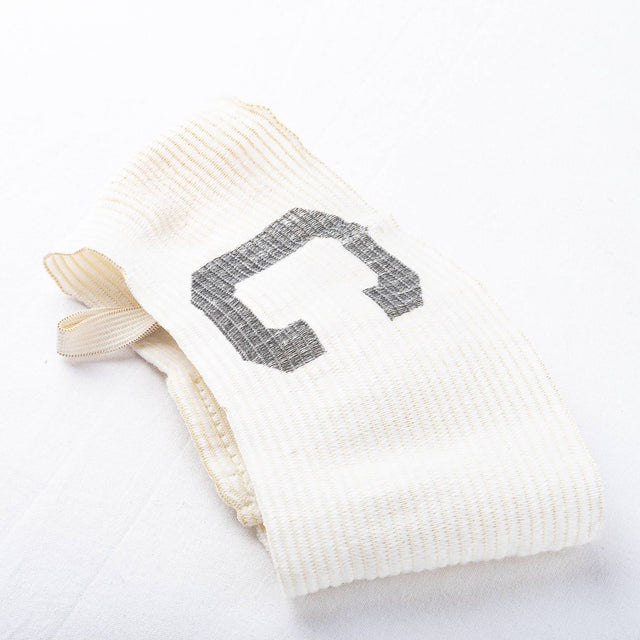 Fascia da capitano bianca modello Diego Armando Maradona, riferita al periodo Boca Juniors 1997. Tessuto elastico a costine, morbido e spesso, con grande lettera “C”verniciata di colore nero, tipico design personale utilizzato da Maradona negli anni finali di carriera. Struttura tubolare senza velcro, con piccolo laccetto in stoffa per il fissaggio sotto la manica, proprio come le fasce artigianali d’epoca.