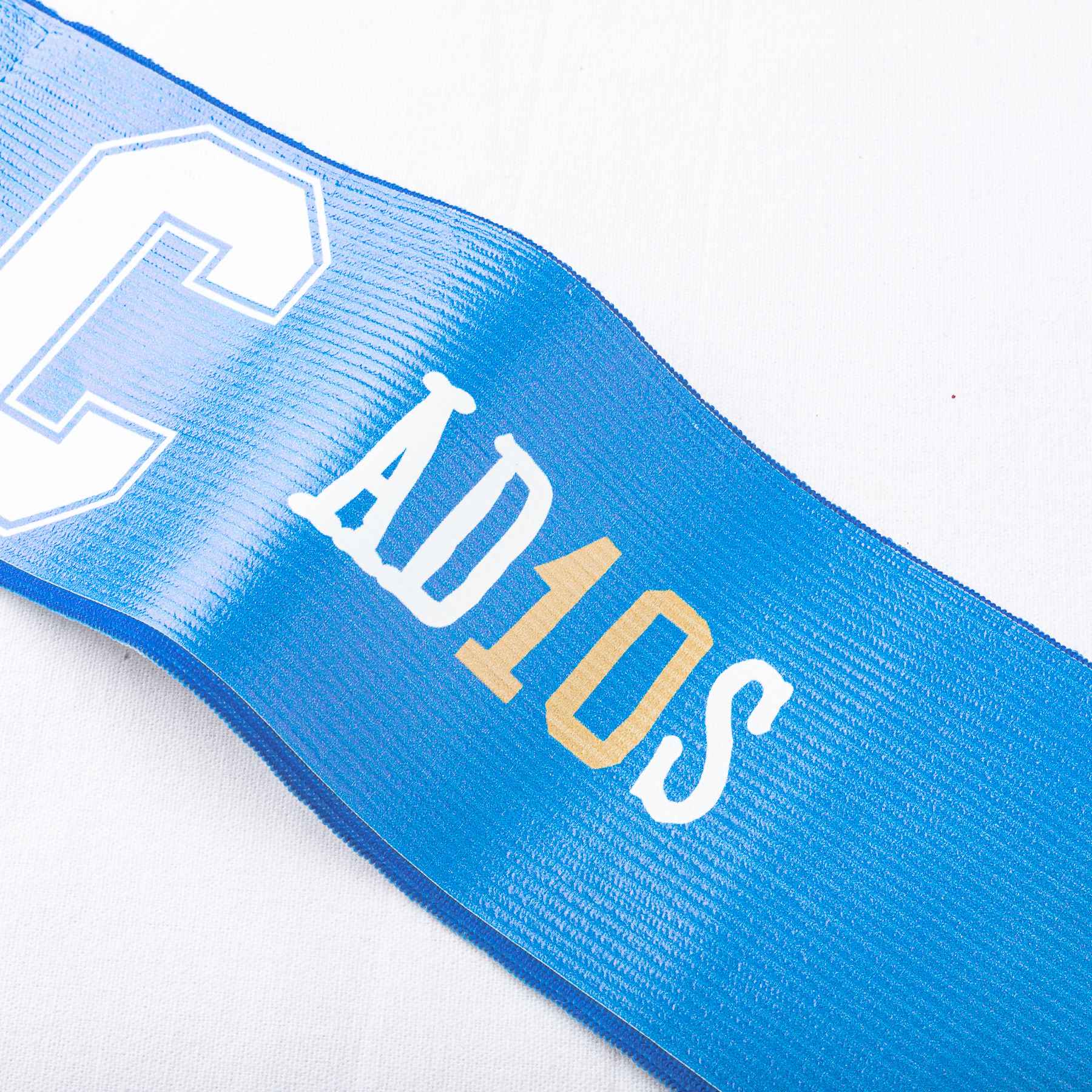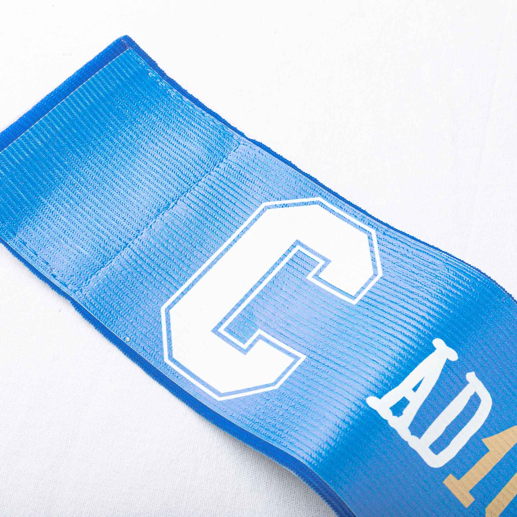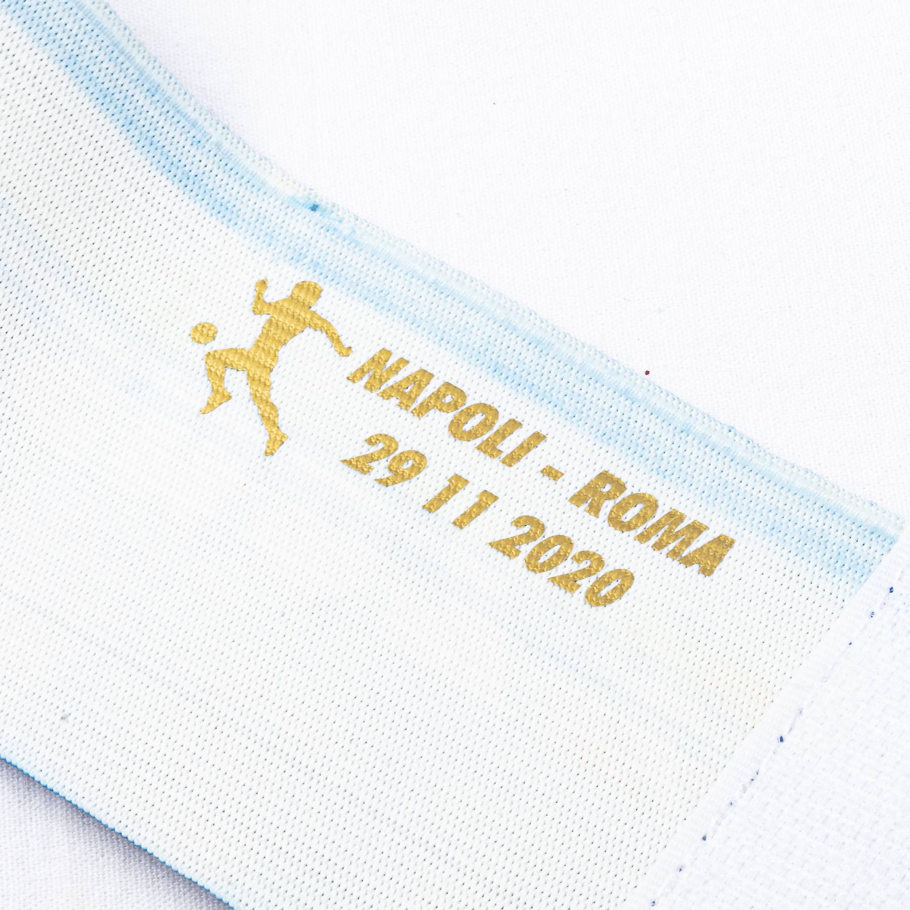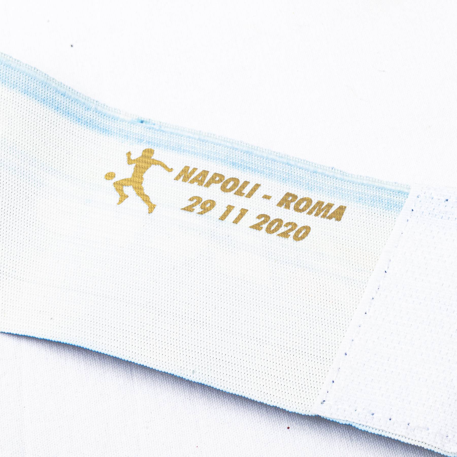 Modello di Fascia da capitano del Napoli indossato da Lorenzo Insigne nel match Napoli-Roma del 29 novembre 2020, gara giocata pochi giorni dopo la scomparsa di Diego Armando Maradona. Modello ufficiale in tessuto elastico azzurro con grande lettera “C” bianca sul davanti, ispirata allo storico design utilizzato da Maradona negli anni Ottanta. All’interno stampa dorata con dicitura “NAPOLI – ROMA 29 11 2020” e silhouette del calciatore, dettaglio celebrativo realizzato appositamente per la partita. Chiusura con linguetta elastica interna per il fissaggio sull’avambraccio. Fascia originale da gara, legata alla storica serata al San Paolo (poi intitolato a Maradona) in cui il Napoli omaggiò il Pibe de Oro con una vittoria e una serie di tributi speciali.