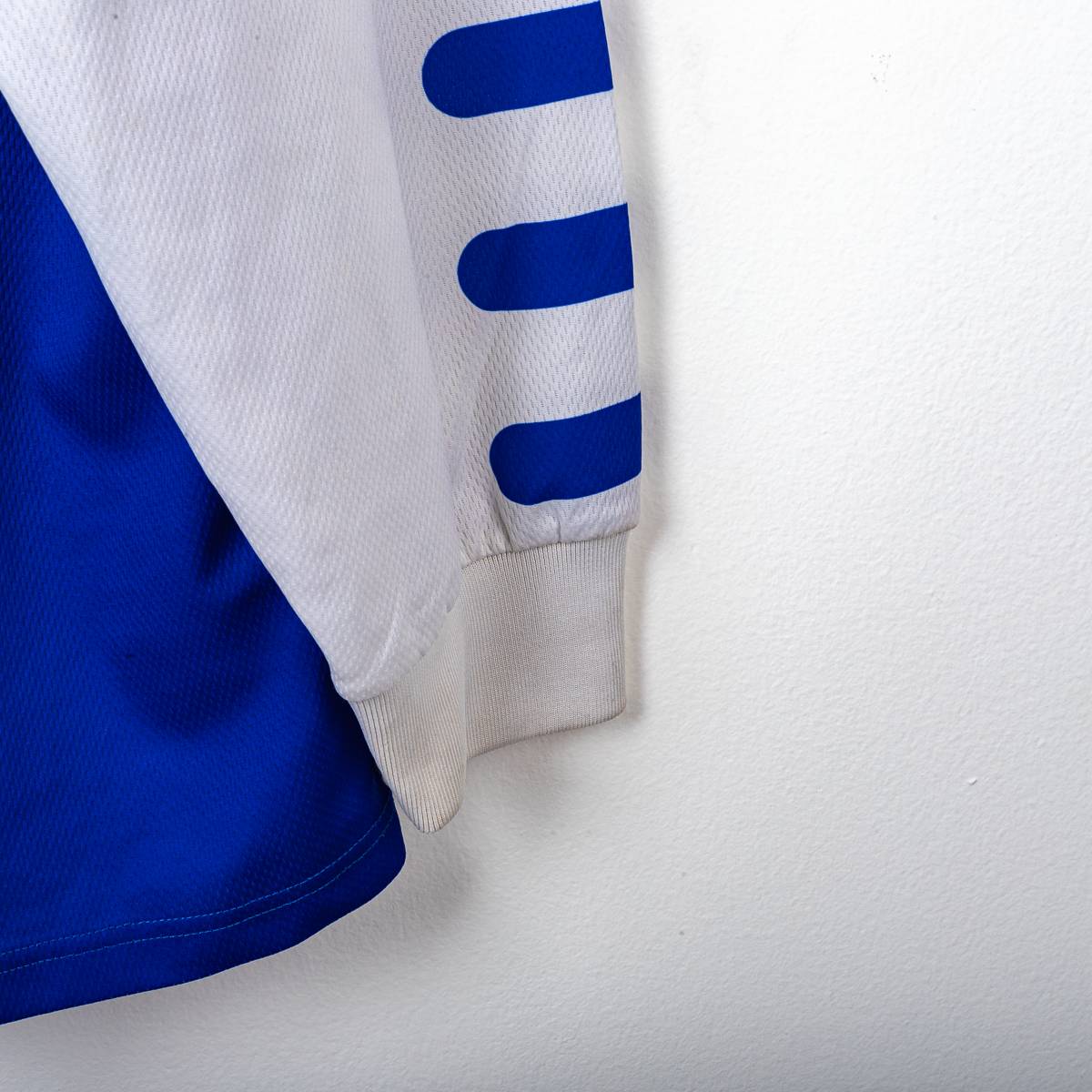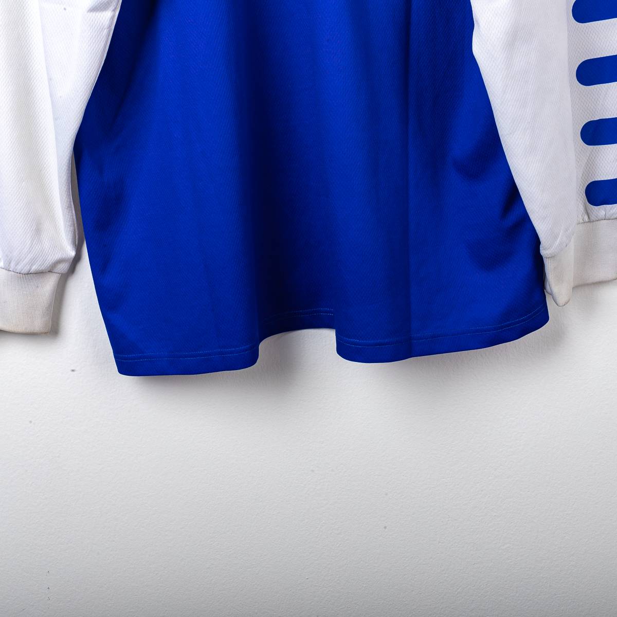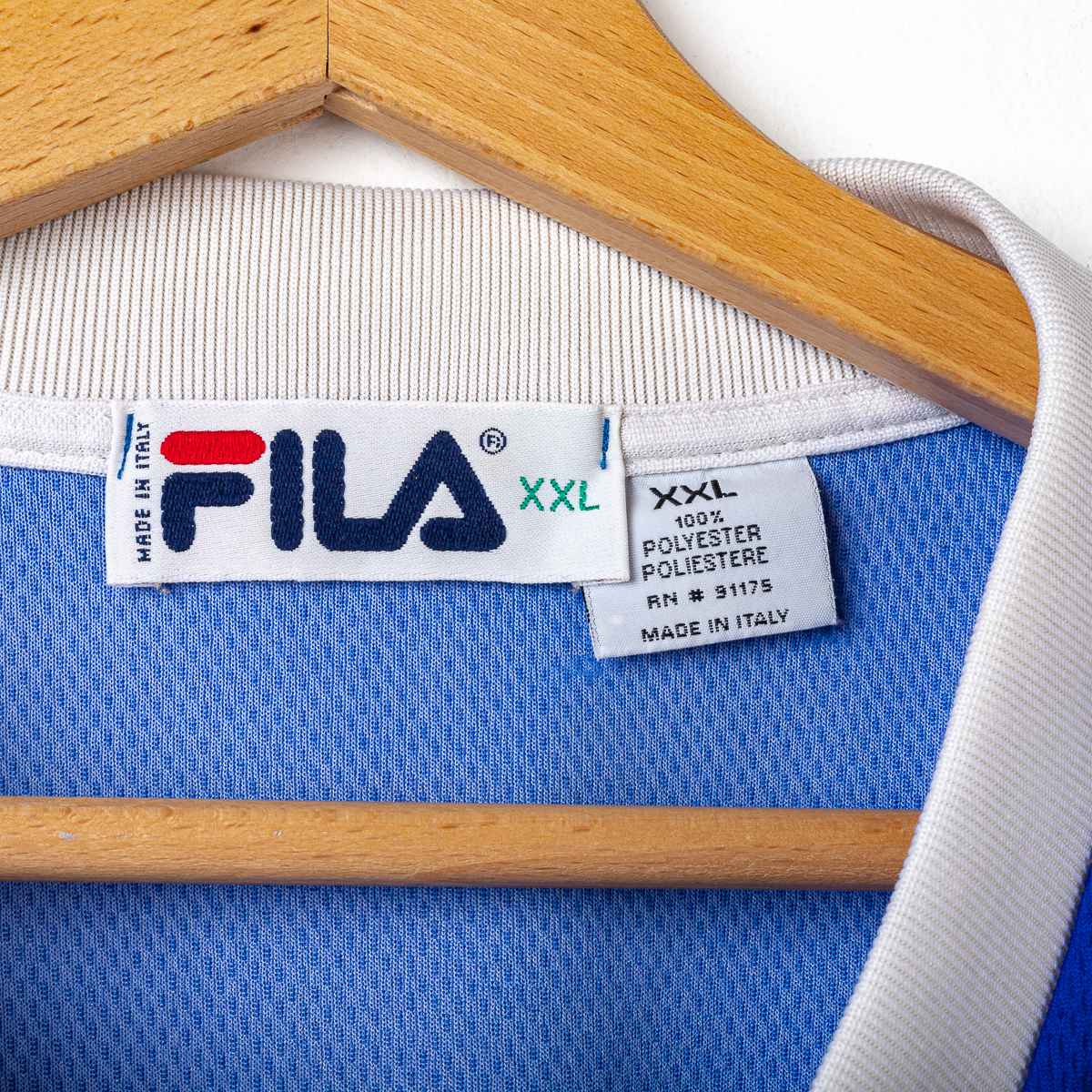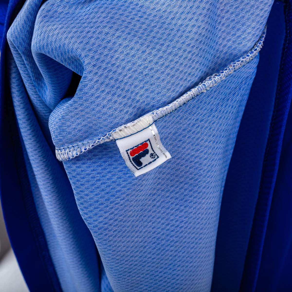 ACF Fiorentina training jersey from the 1999/2000 season, produced by Fila. Long-sleeved model made of 100% polyester technical fabric in royal blue with contrasting white sleeves, lightweight and breathable, designed for training. White ribbed V-neck and matching elastic cuffs. Fila logo and Toyota sponsor printed centrally on the front; Toyota Fila sponsor also replicated on the back. Loose and comfortable fit, essential training-field design. Fila label inside with size XXL, composition and production Made in Italy.